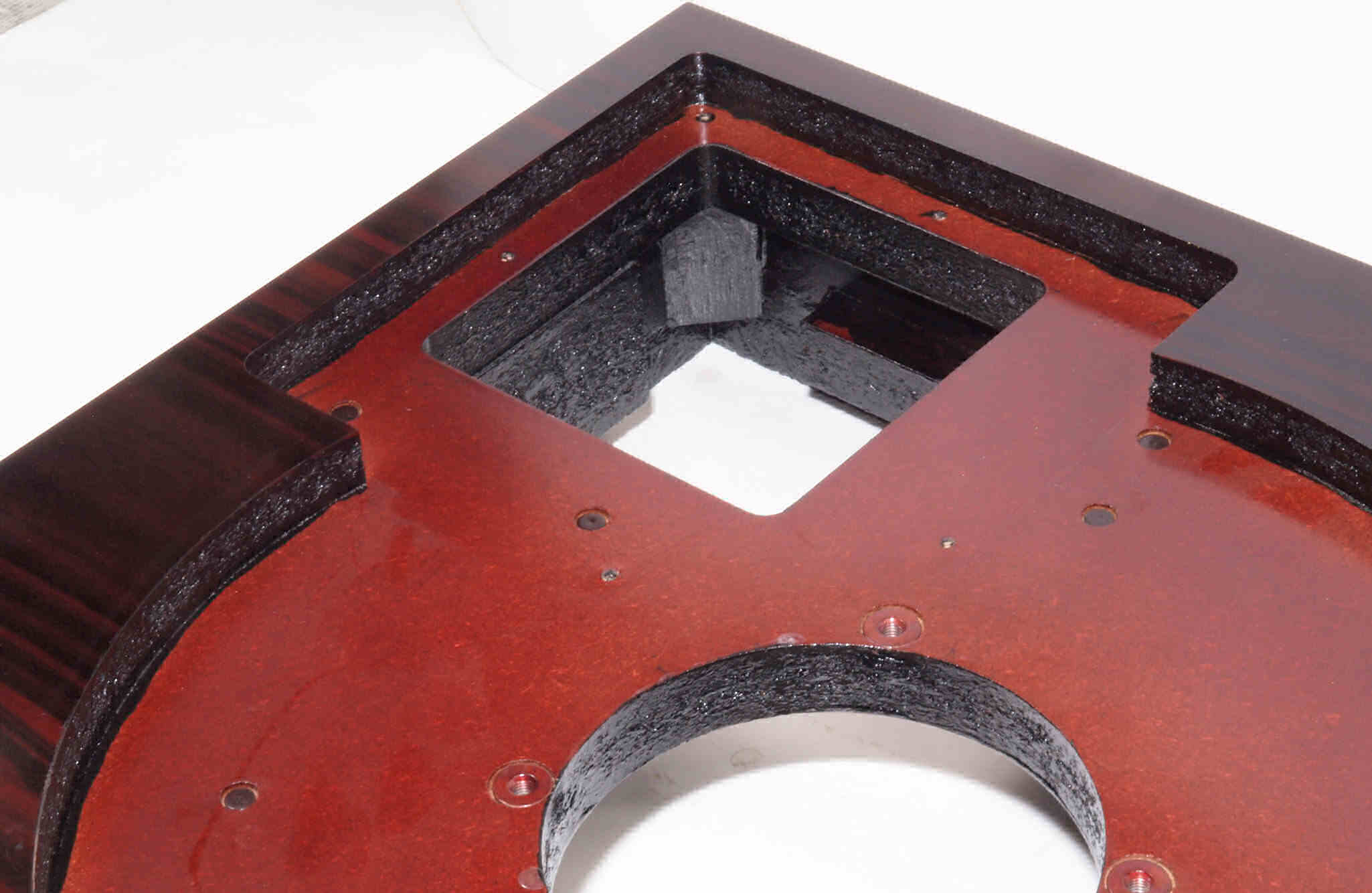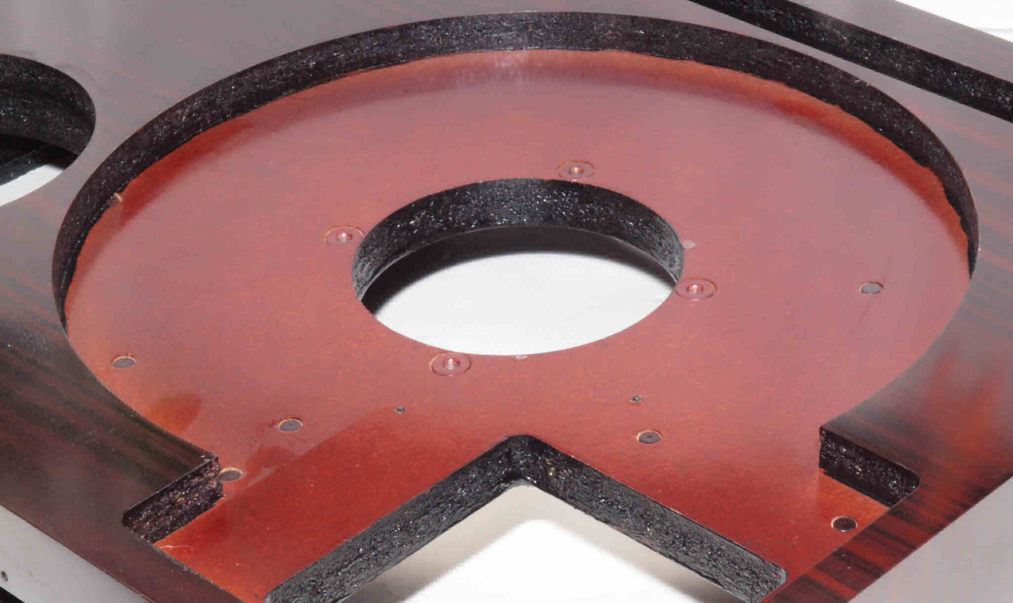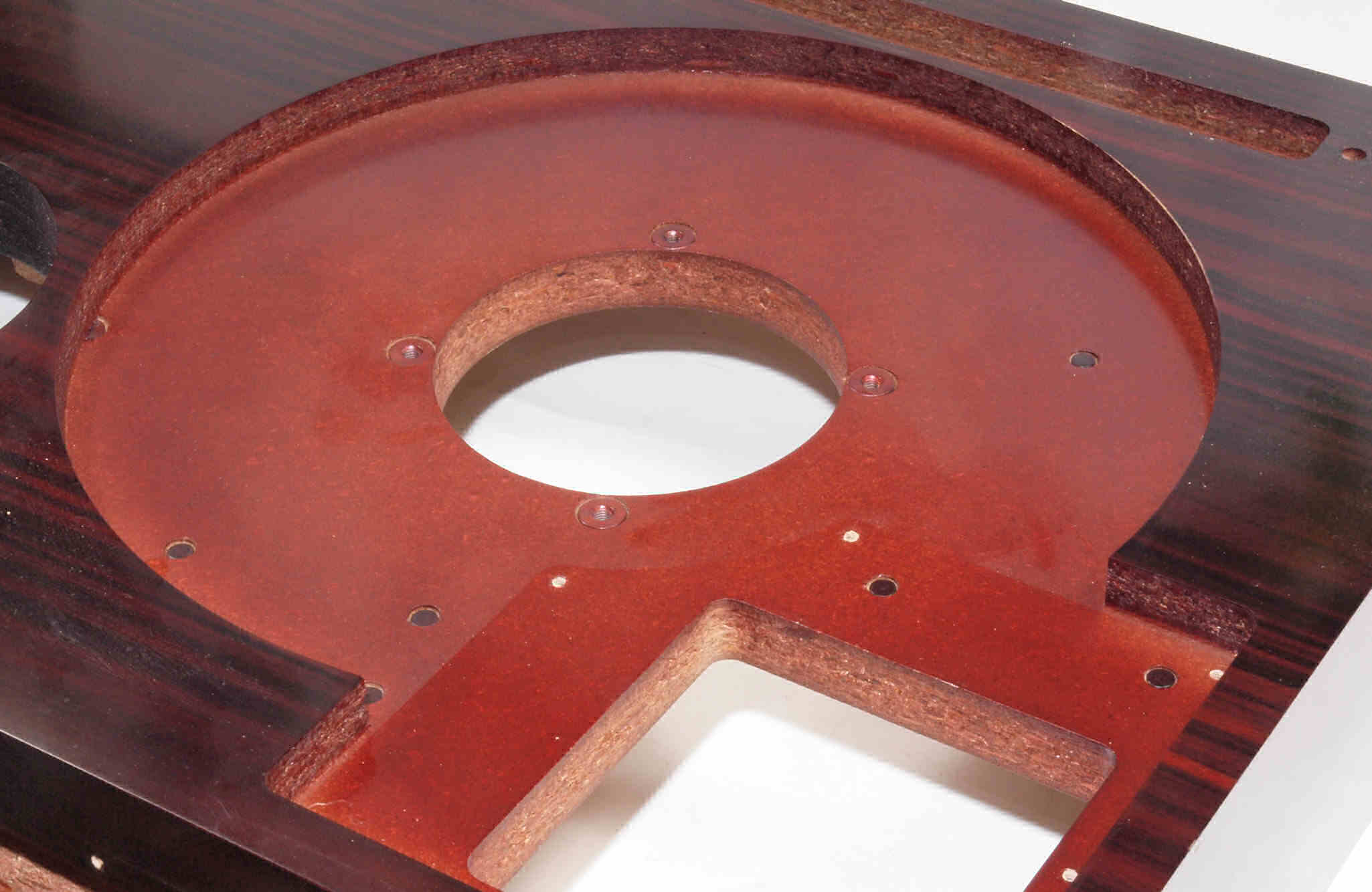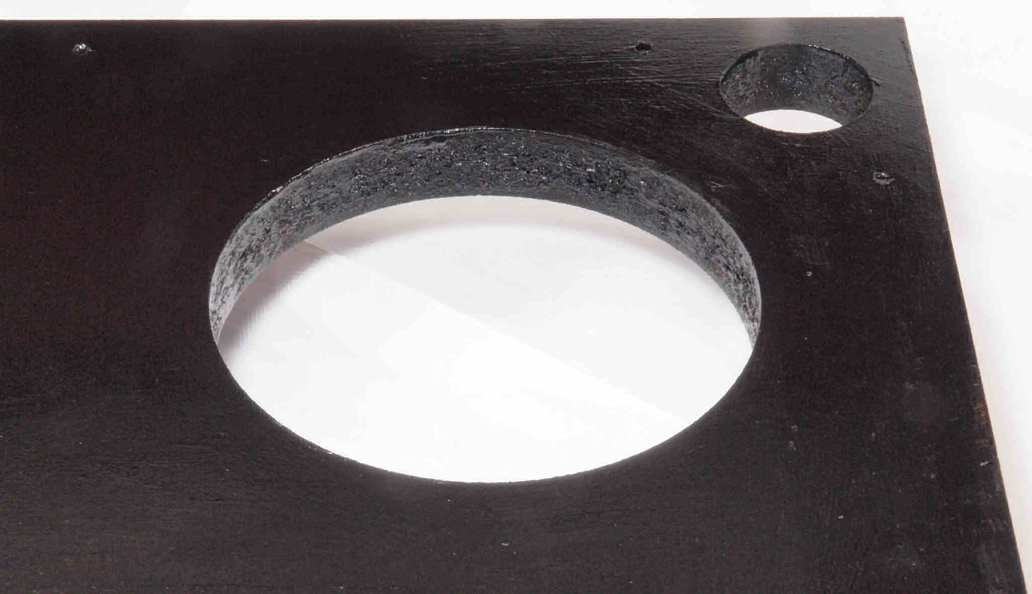 W18. 修理後 タンテーブル取り付け穴。 キズを消す為と割れを防ぐのに、塗装する。