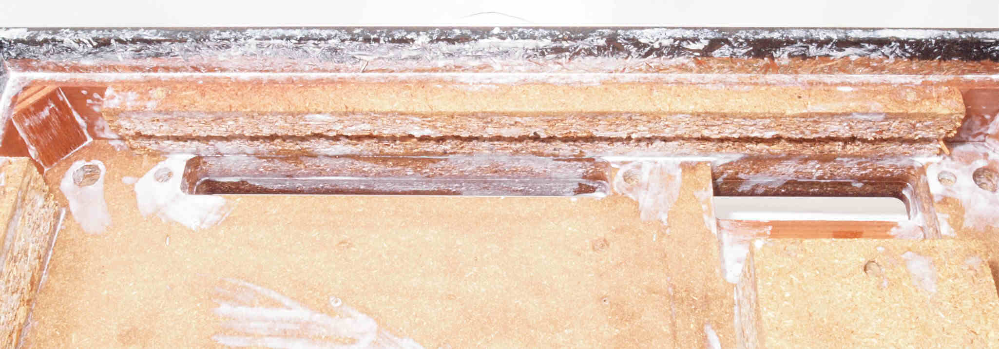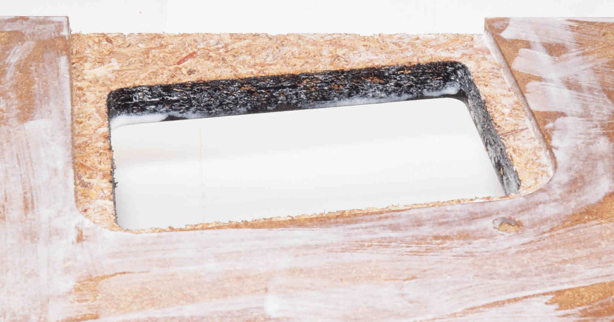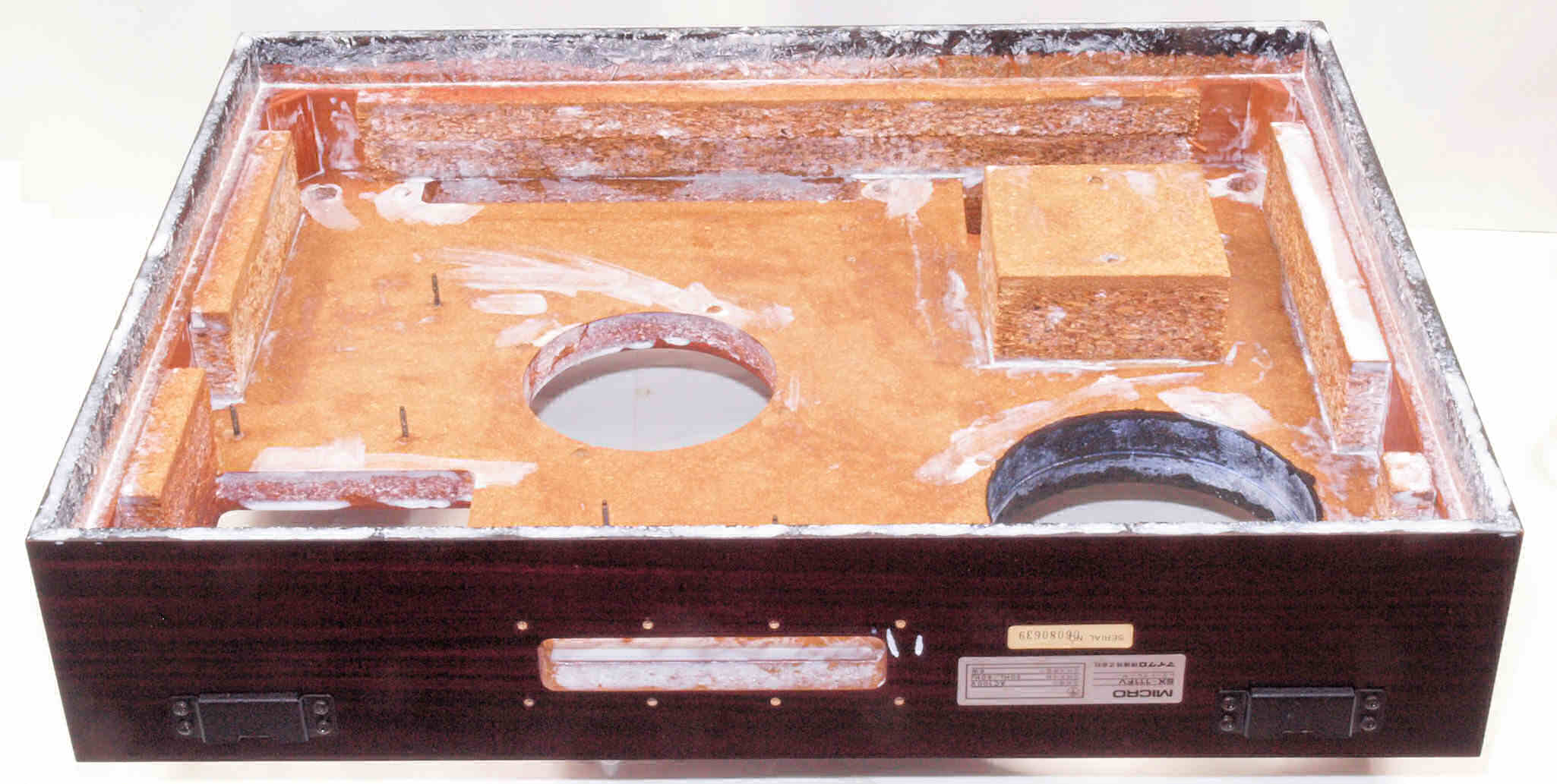 W72. 修理(塗装)後 底板裏側、 前右から。 圧縮材に、水性木工ボンドを塗布。