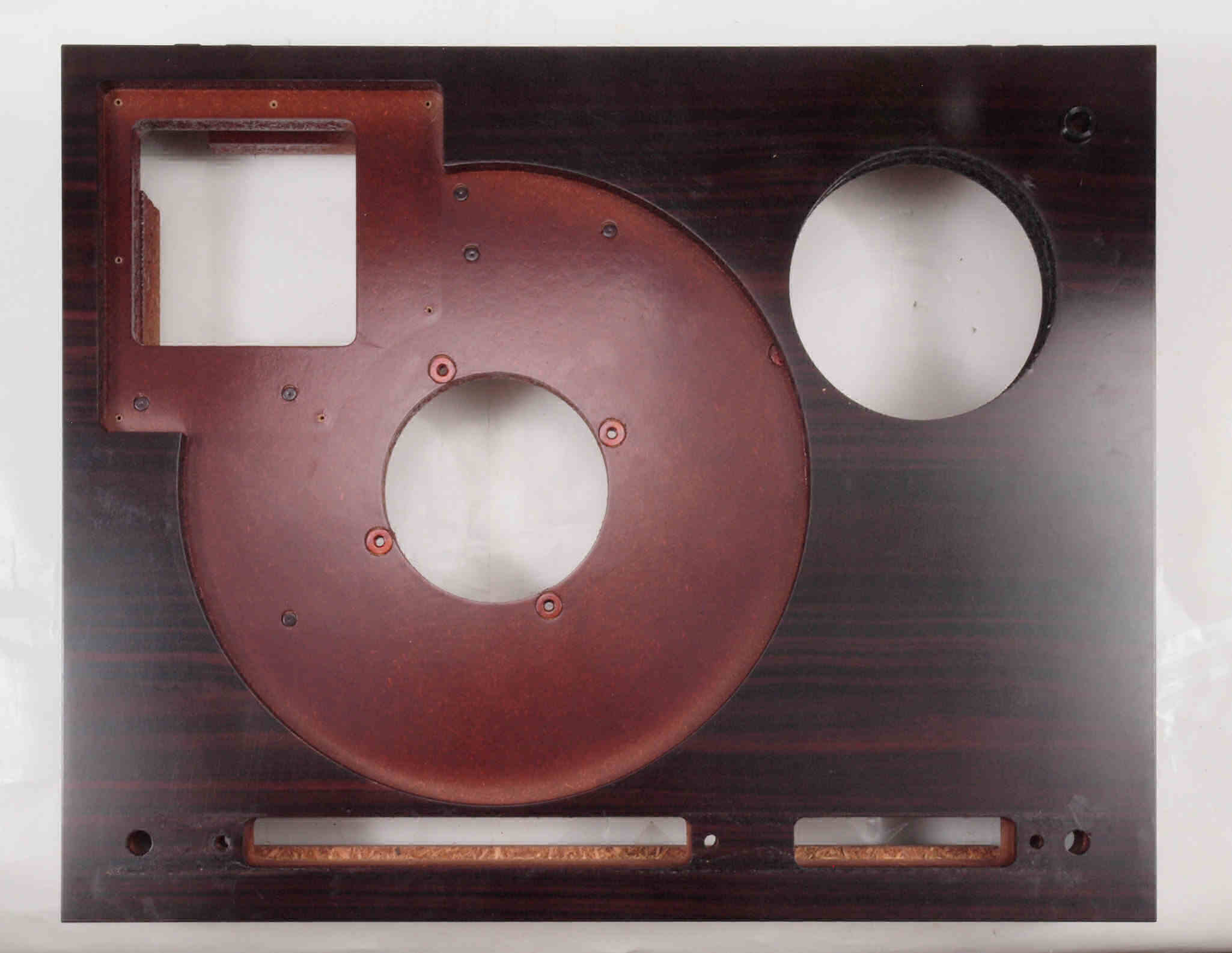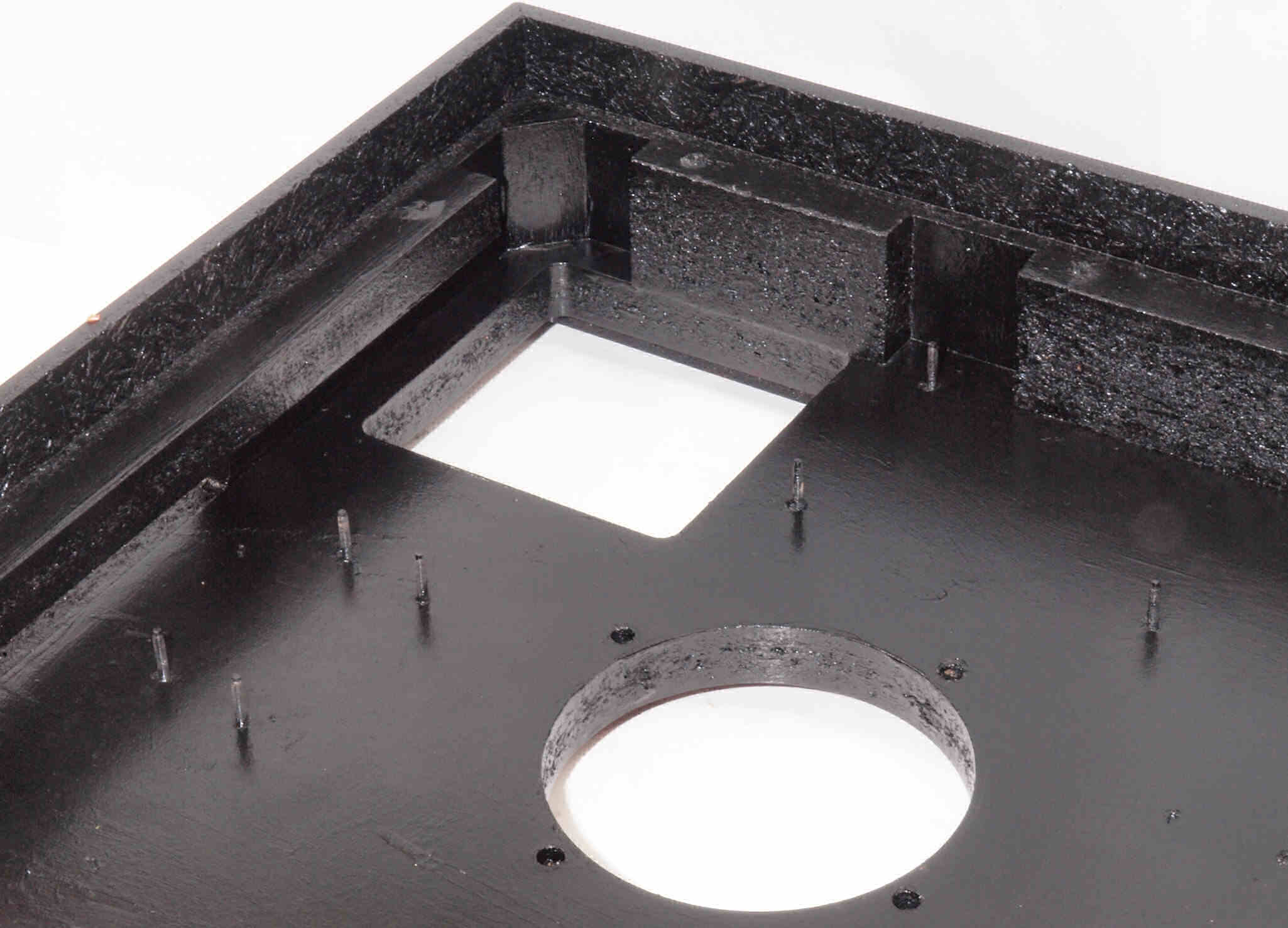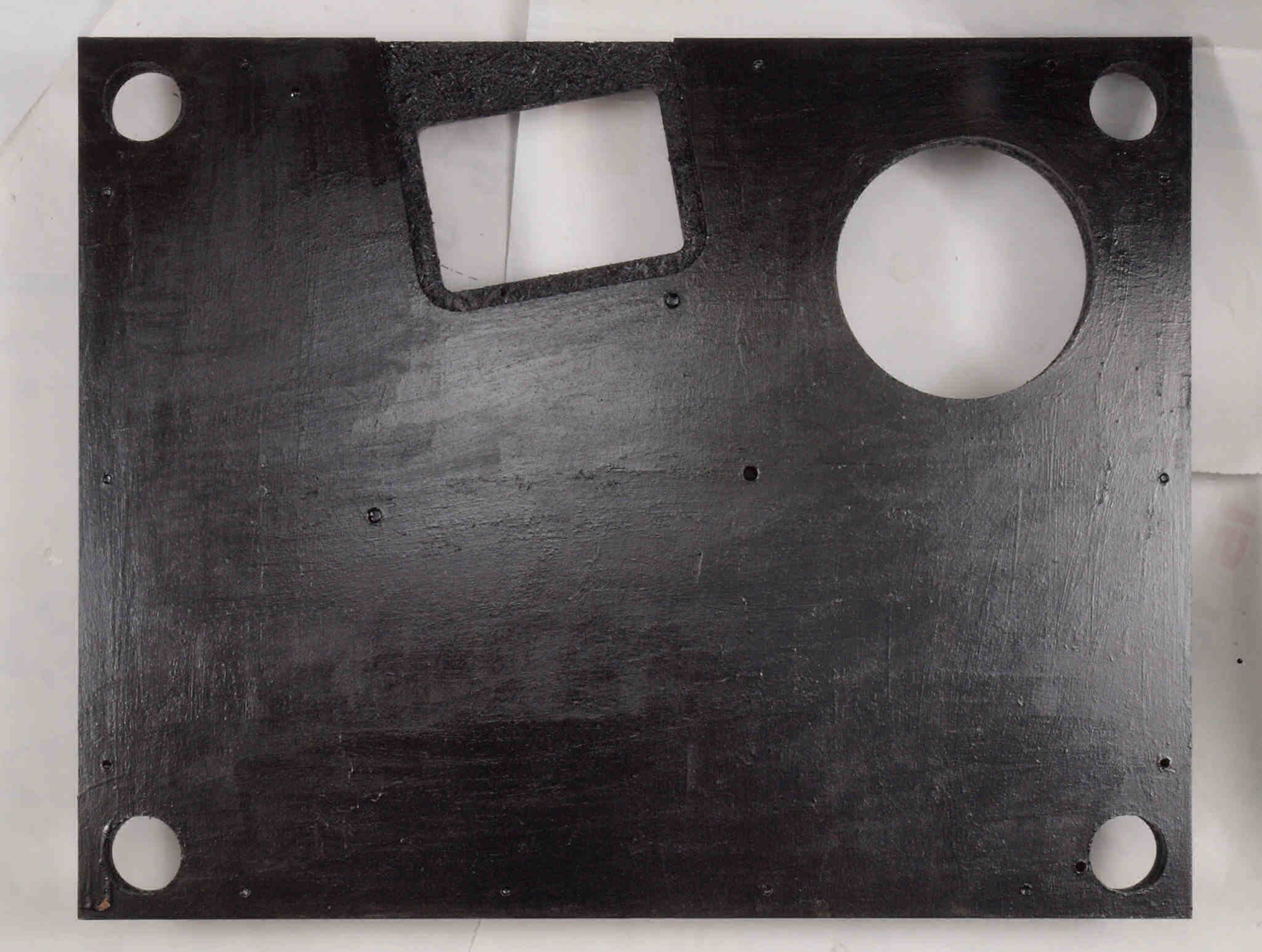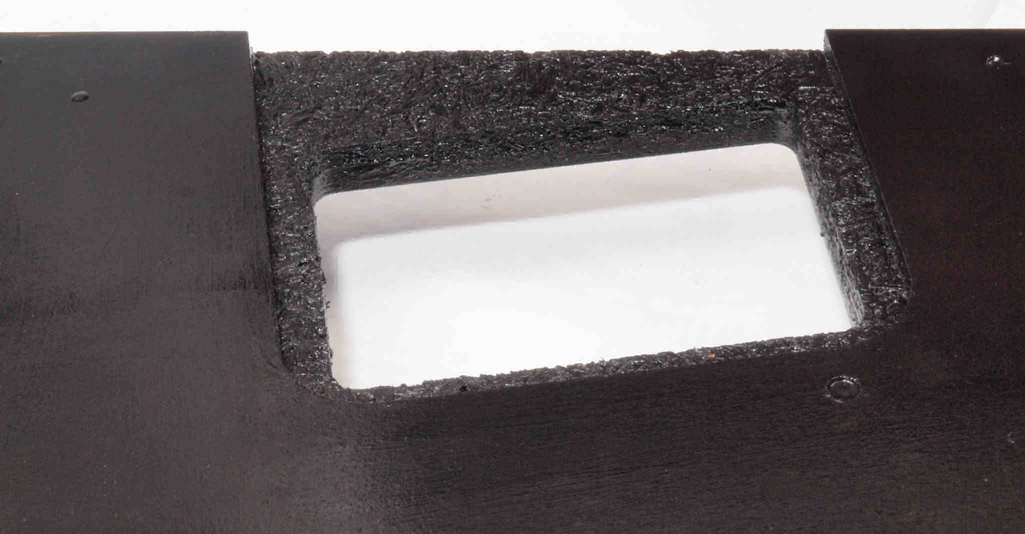 W96. 修理中 底板裏側、アーム取り付け穴、反対側。さらに、キズを消す為と割れを防ぐのに、ペンキを塗る。
