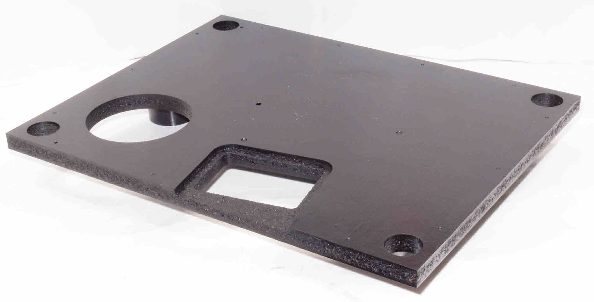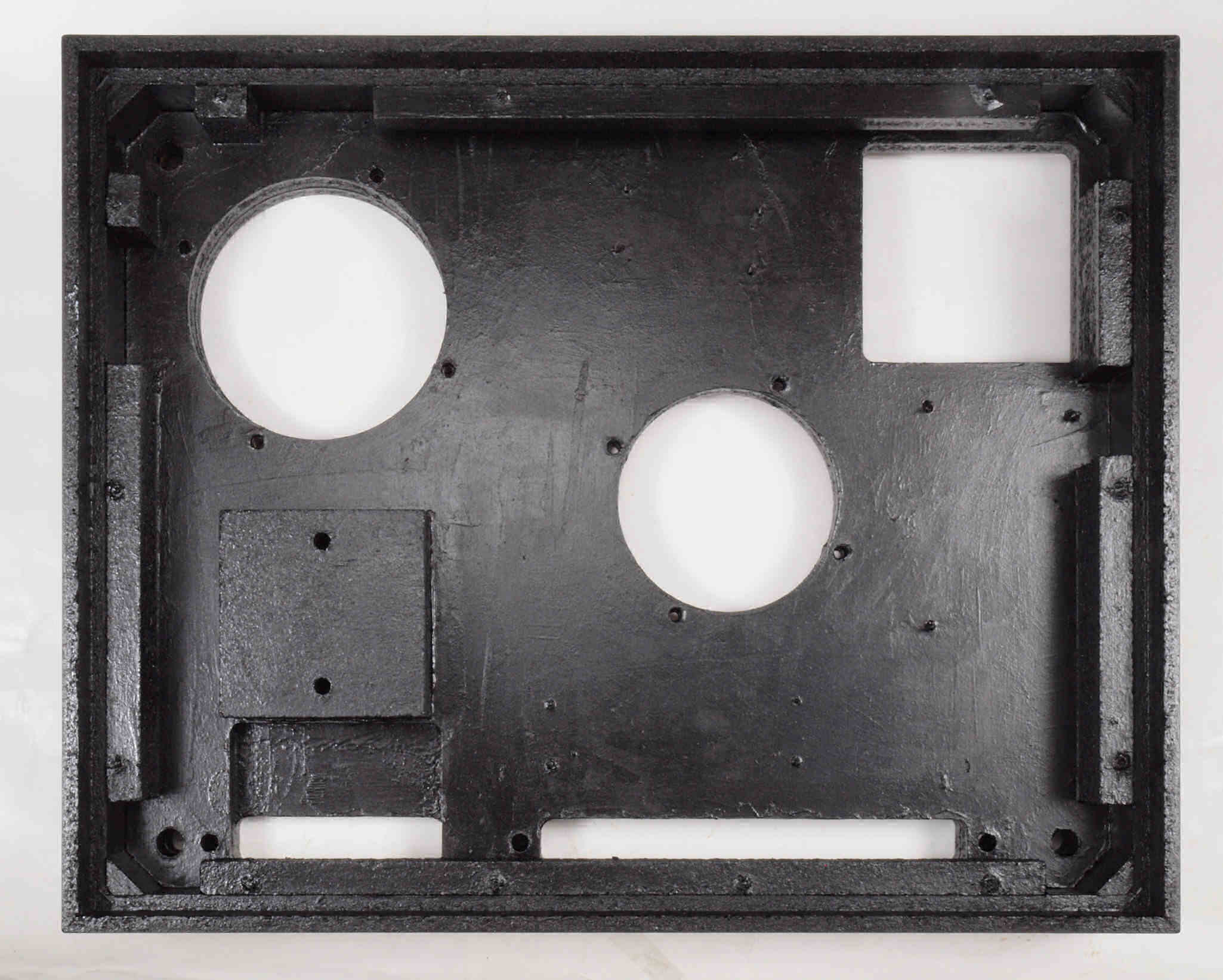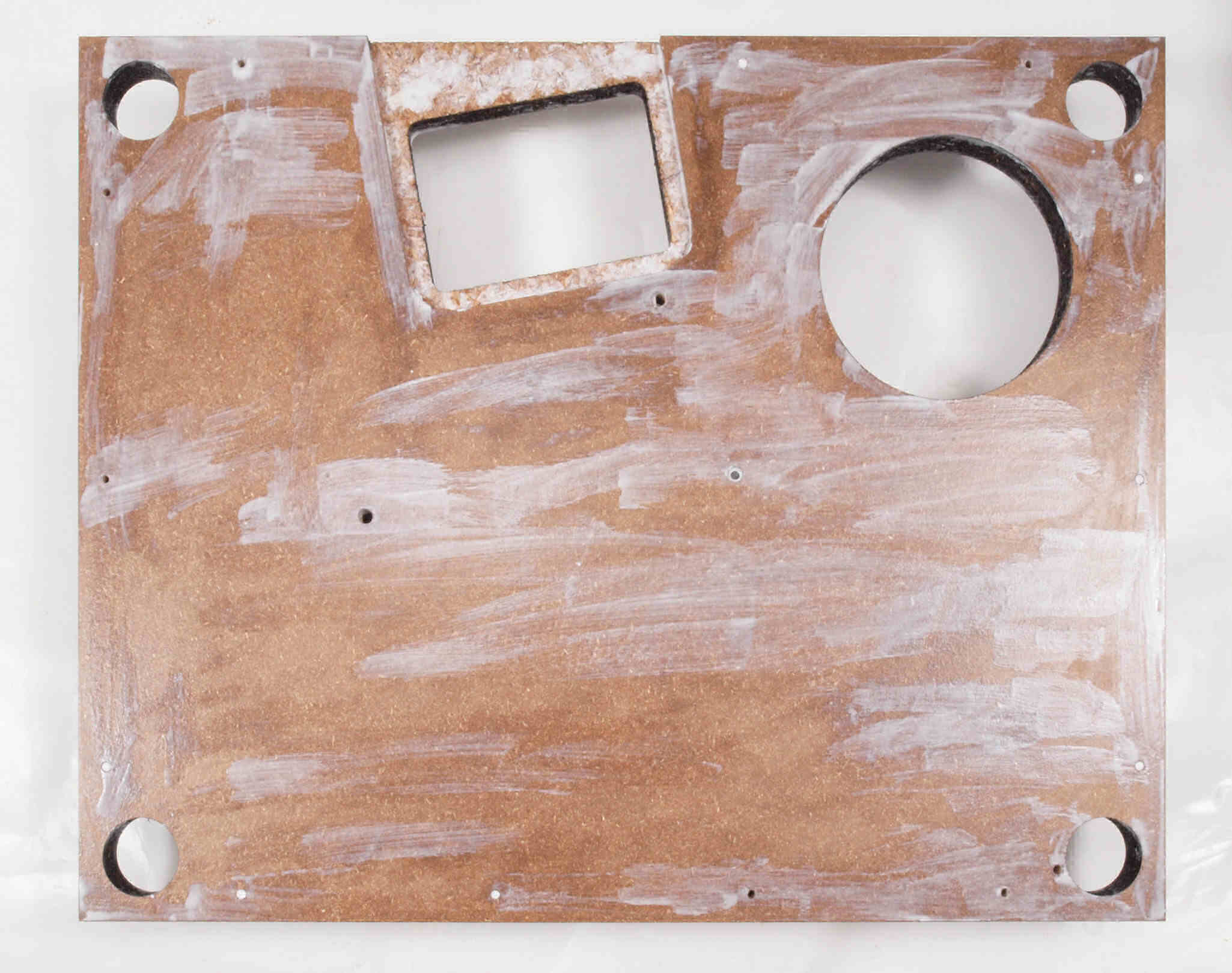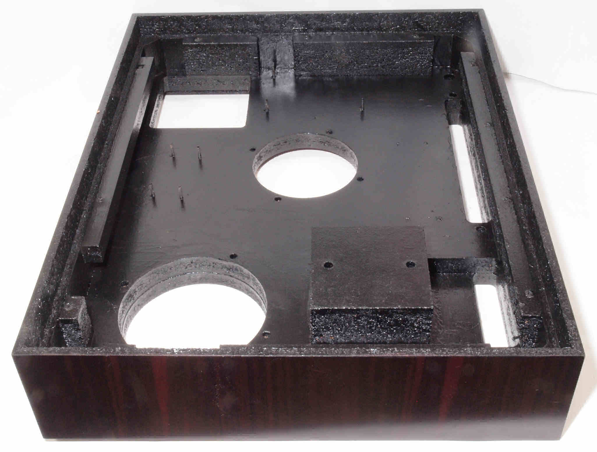 W96. 修理中 底板裏側、アーム取り付け穴、反対側。さらに、キズを消す為と割れを防ぐのに、ペンキを塗る。