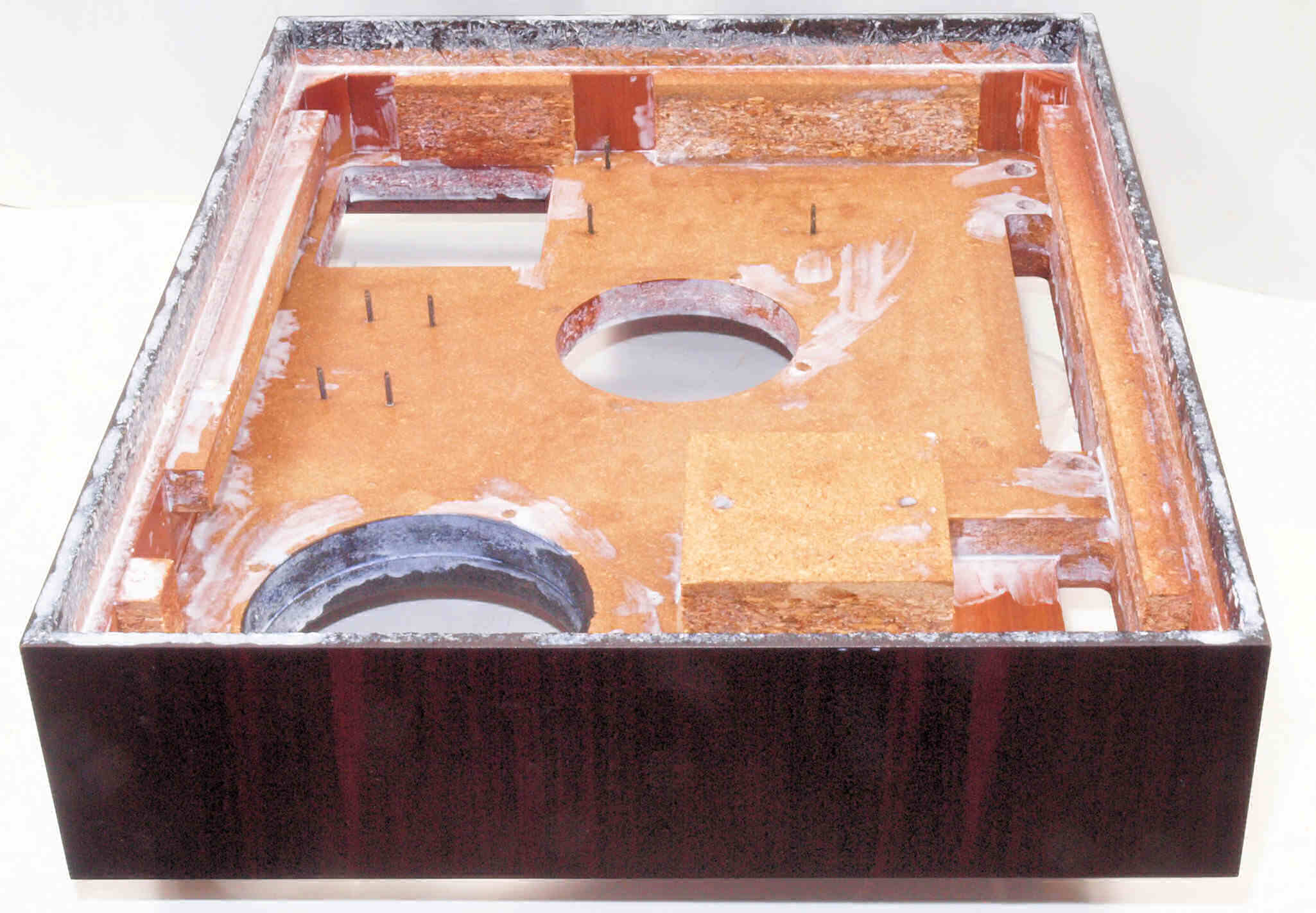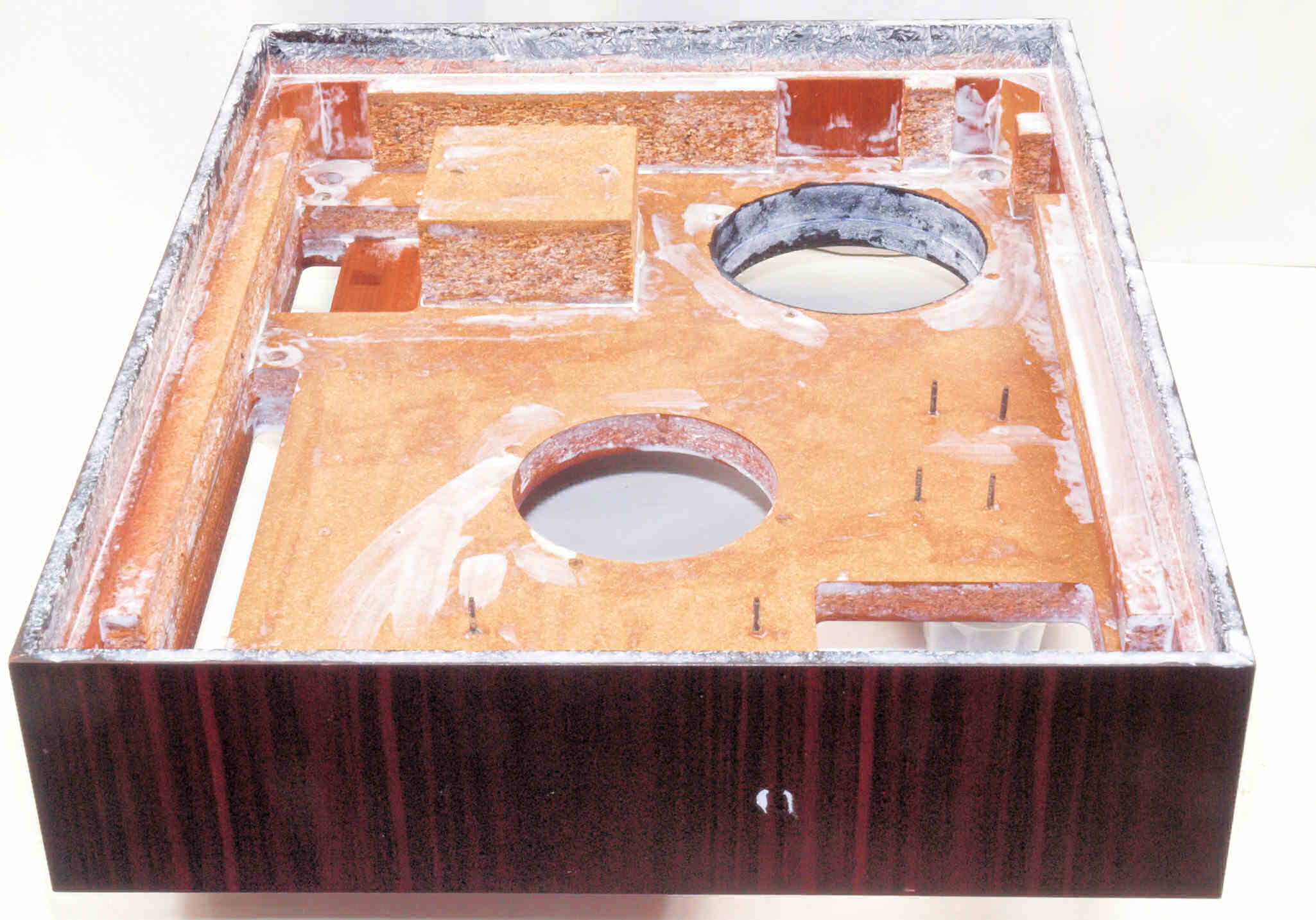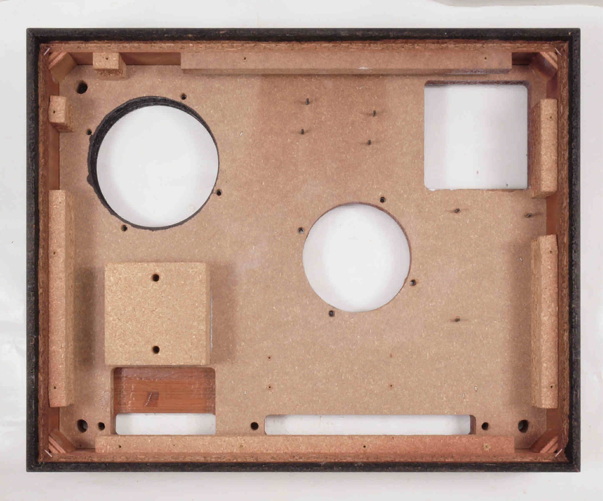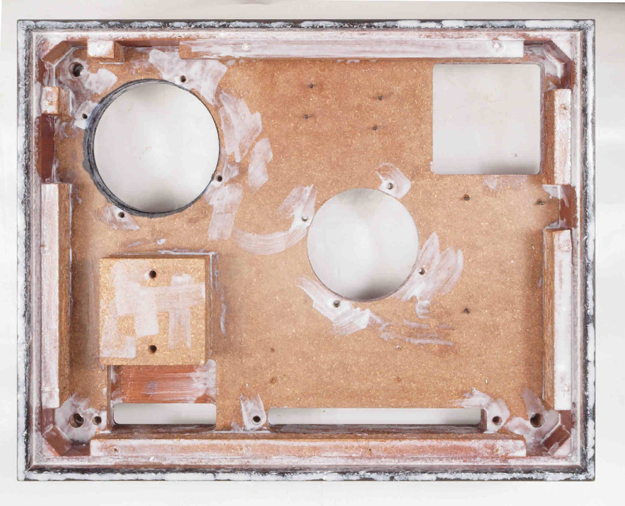 W82. 修理中 底板裏側、トランスカバーを取付ける所、水性木工ボンドを塗布する。