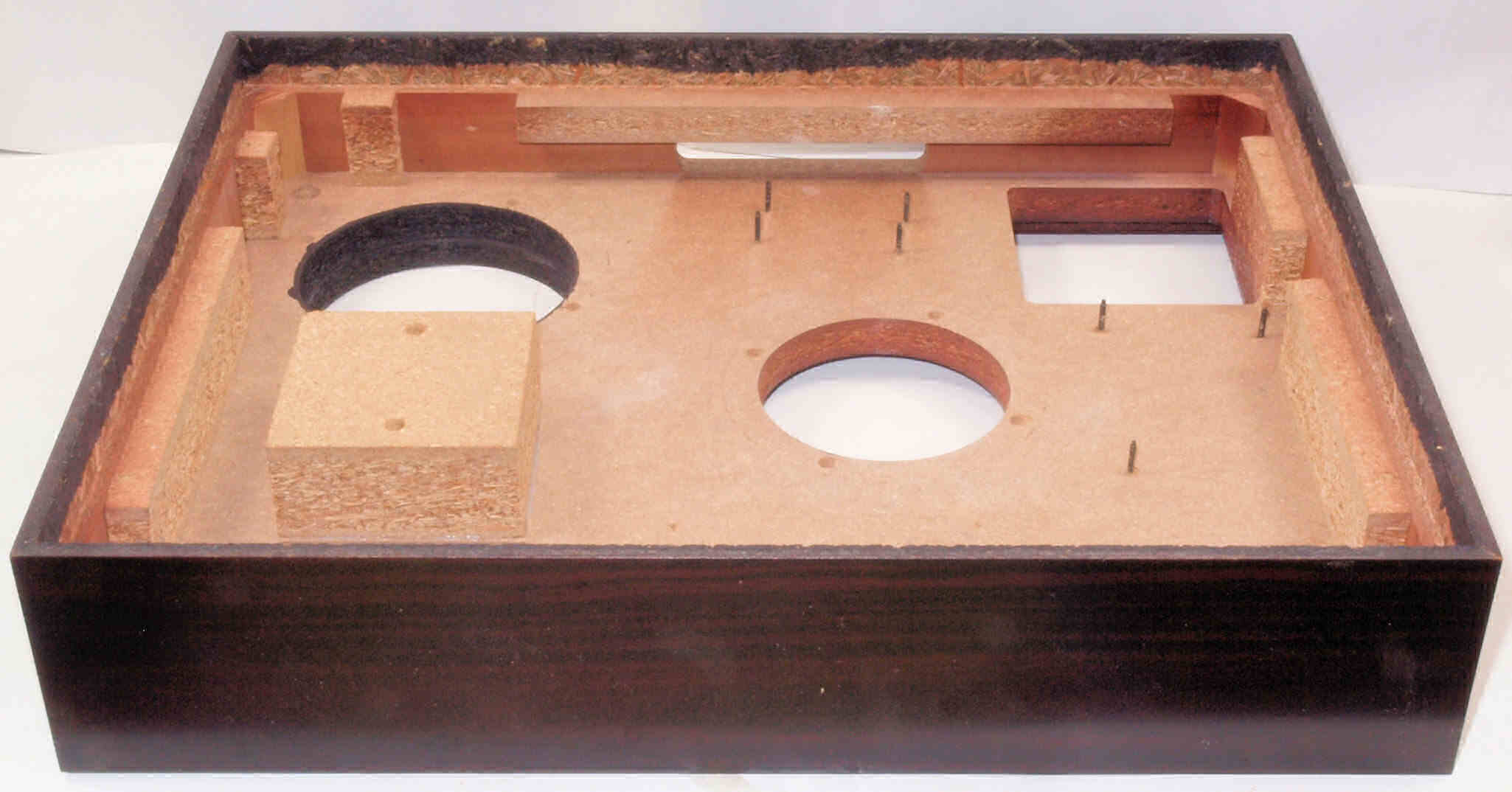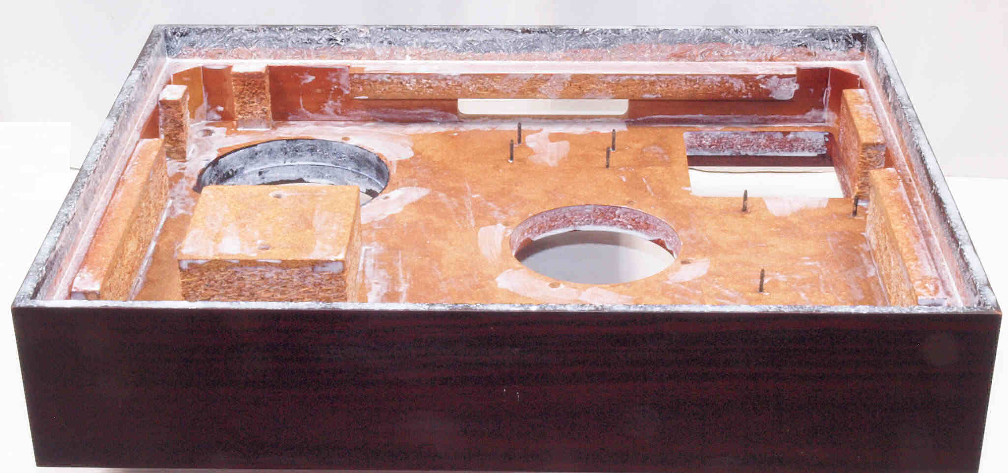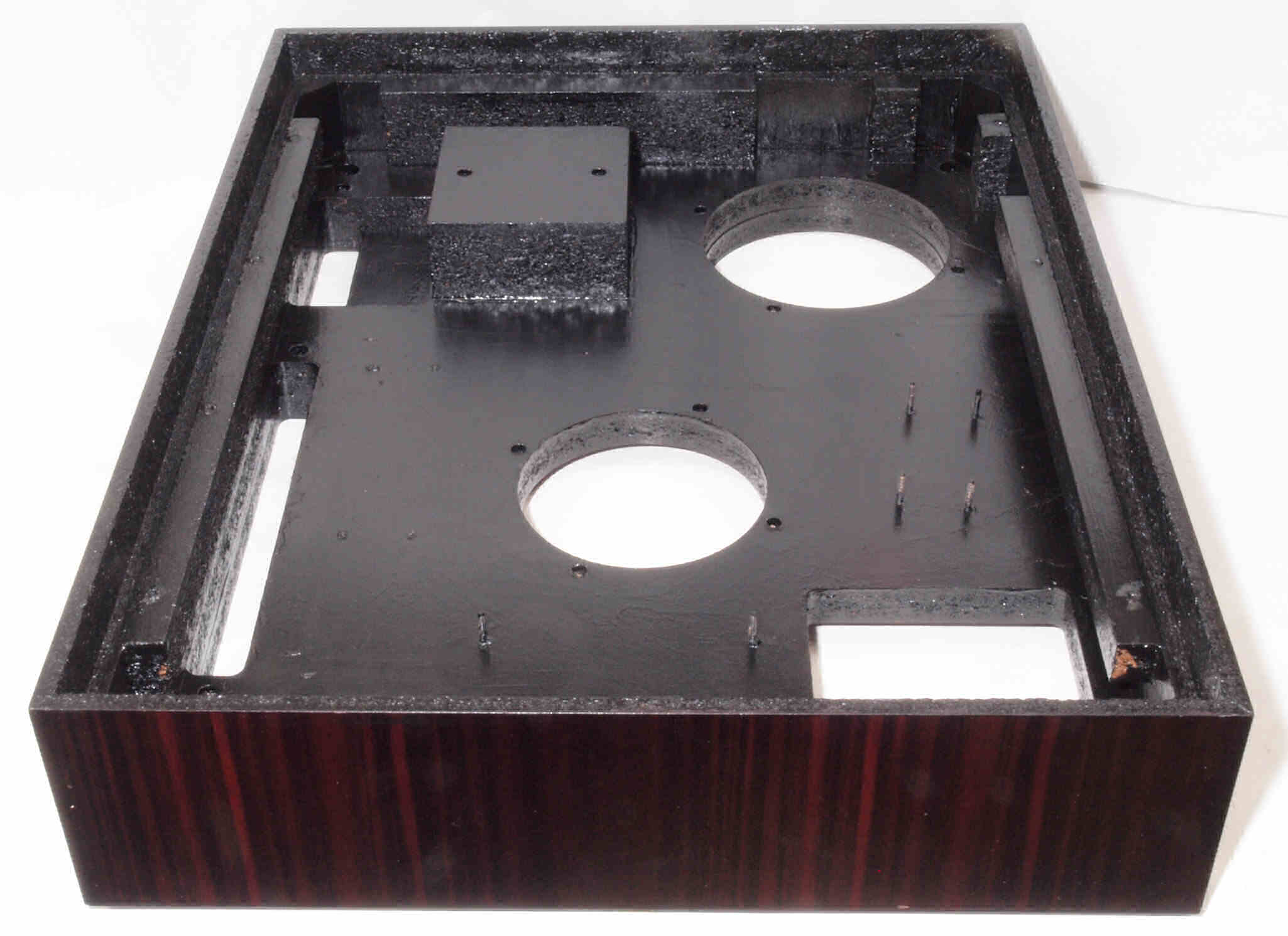 W85. 修理中 底板裏側、トランスカバーを取付ける所、反対側。水性木工ボンドを塗布する。