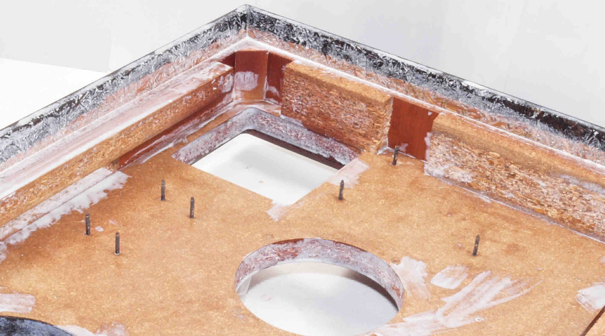 W75. 修理中 底板裏側、 後左から。 圧縮材に、水性木工ボンドを塗布する。