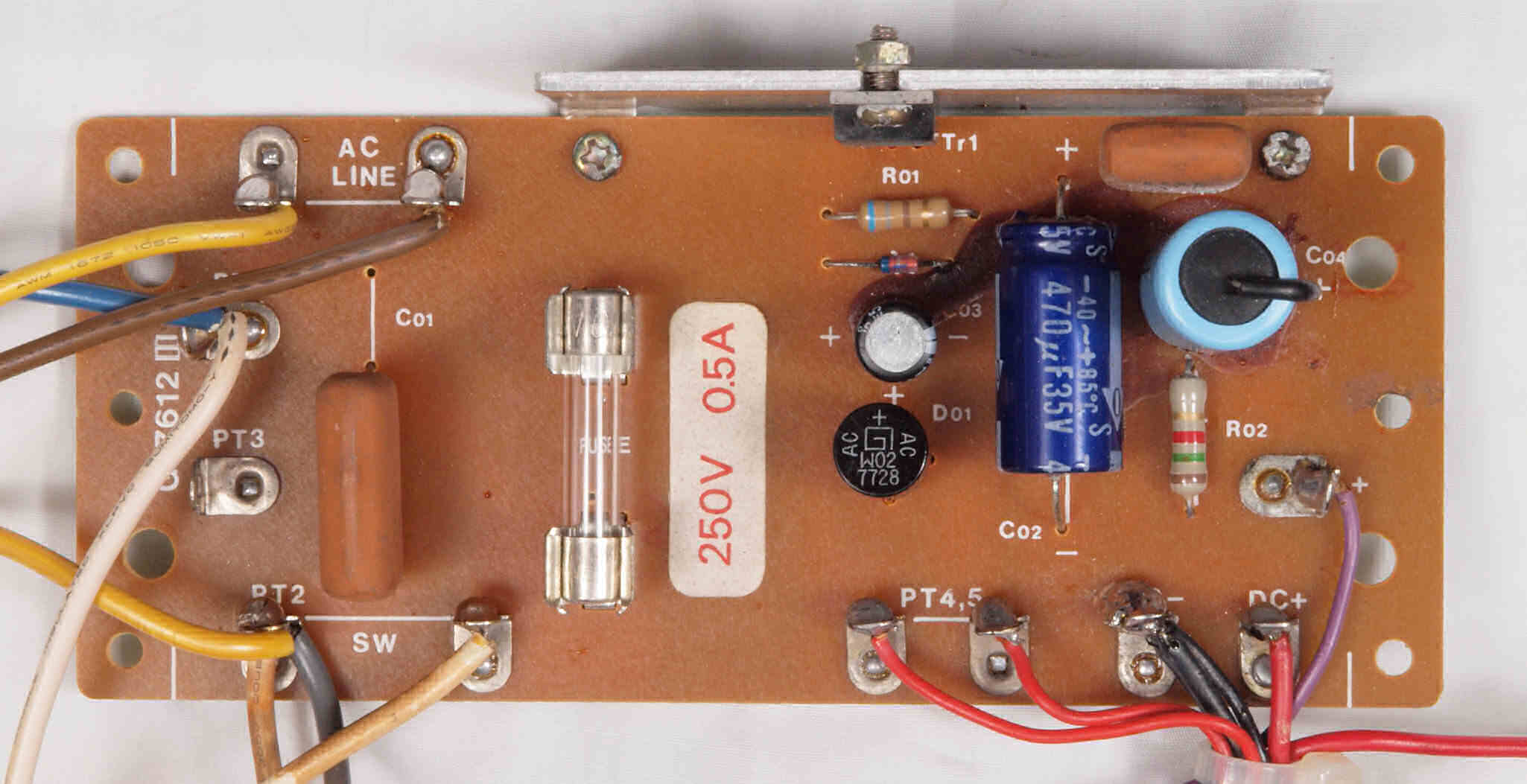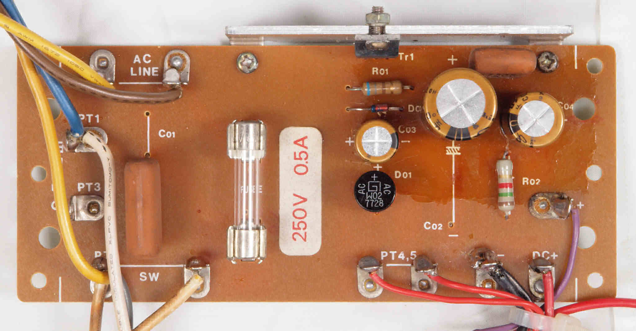 C22. 修理中 電源・ヒューズ基板。 トルエン溶媒の接着剤。