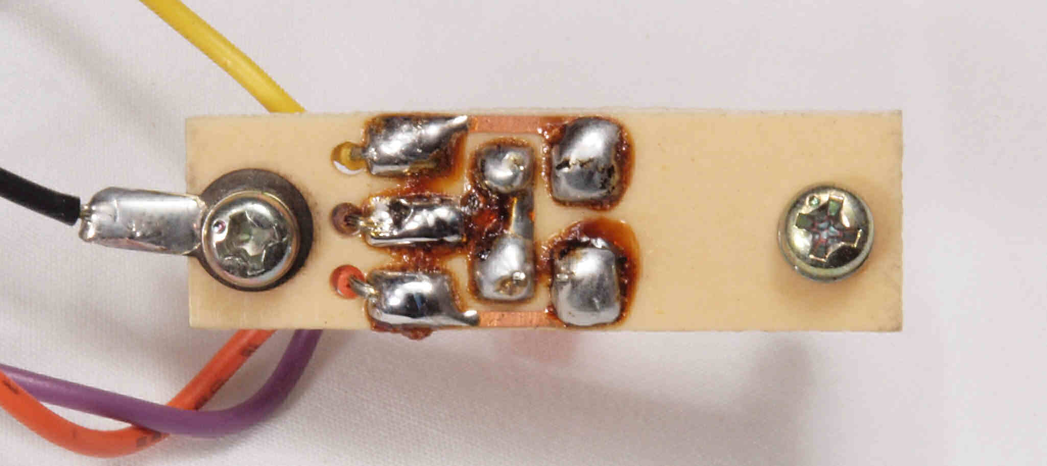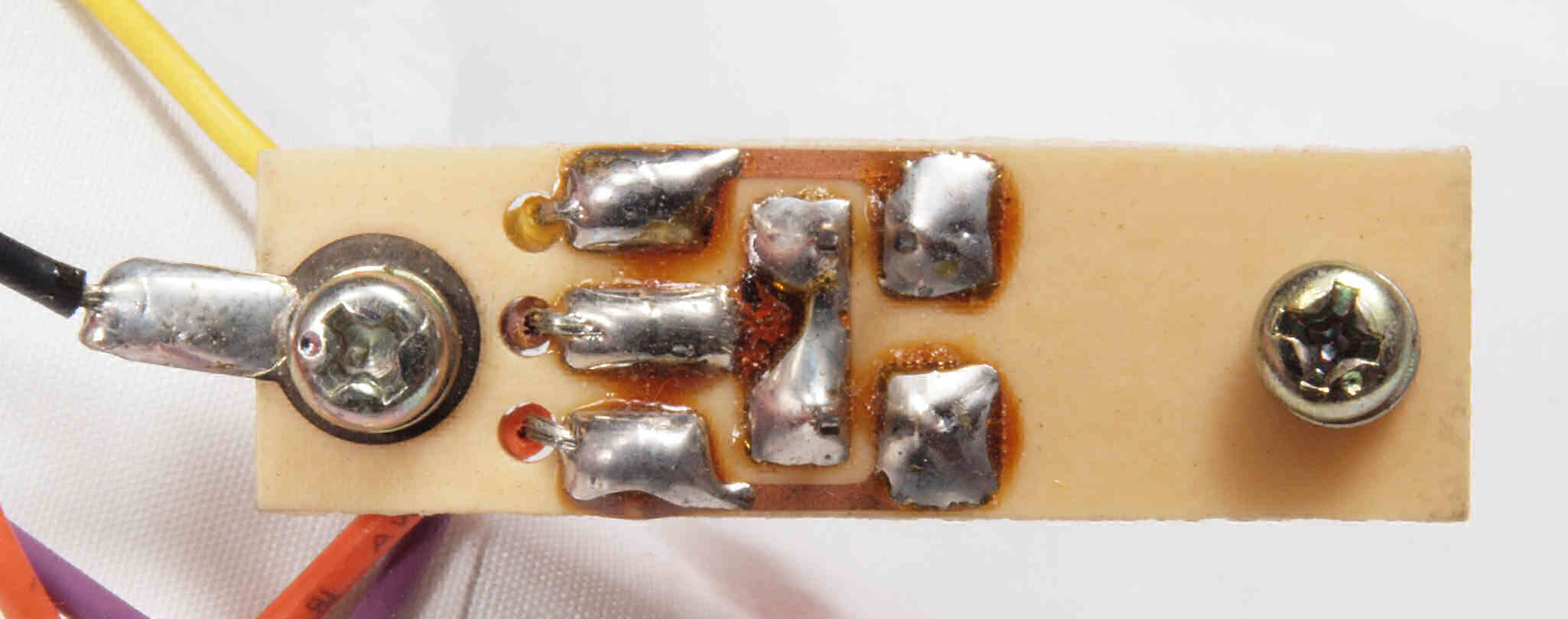 C27. 完成電源・ヒューズ基板裏。余分なフラックスを落として、コート液を塗る。