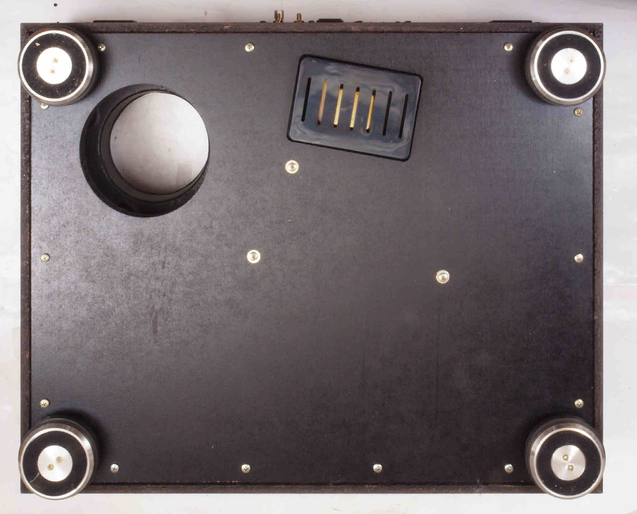 W84. 修理前 底板裏側、トランスカバーを取付ける所、反対側。 止めビスが圧縮材を割る。