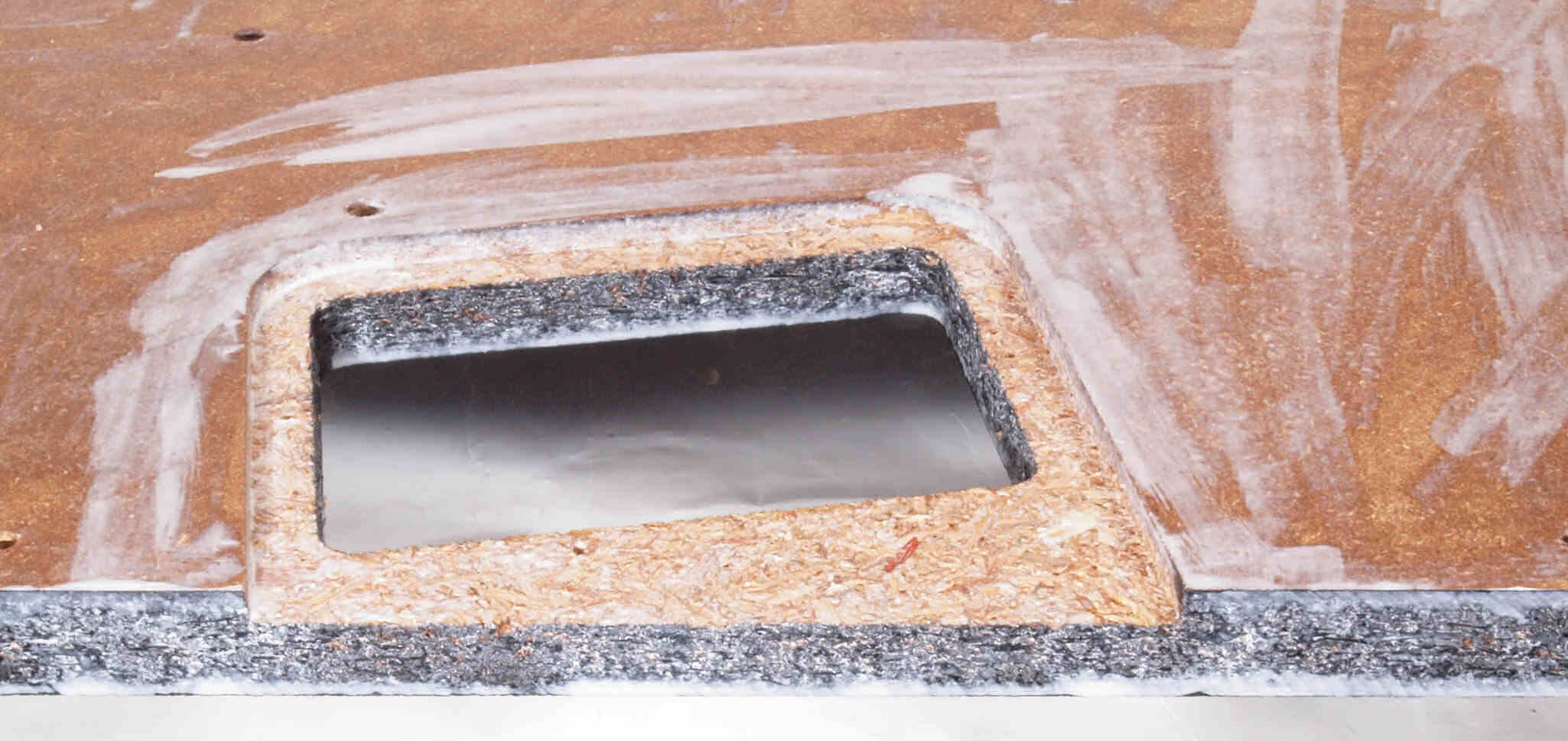 W64. 修理中 底板裏側。 圧縮材に、水性木工ボンドを塗布。