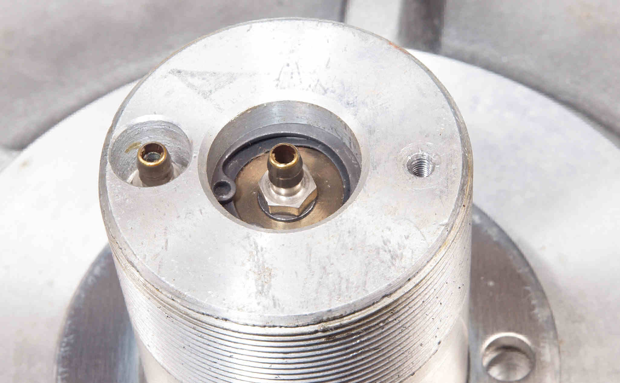 | M. RB−1500修理状況。 画像をクリックすると、大きく(横幅2050ドット)表示されます。 M1. 軸の取り出し。左側ホース配管継手の穴の中にバネの残骸が見える。 |