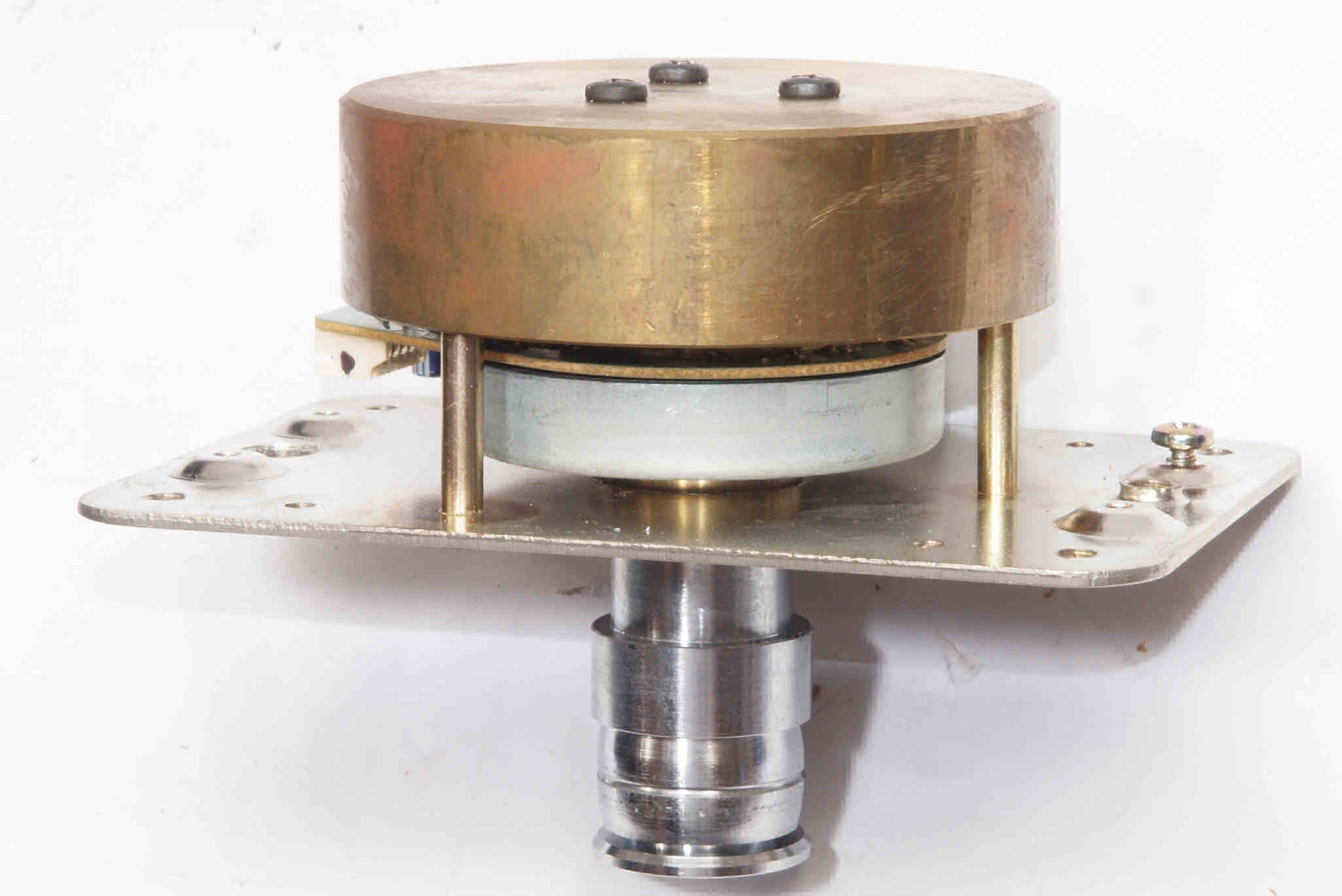 | D41. 修理中 モータ取り出す。アウターローター構造なので、下側のみの軸受け構造。 ベルトを貼りすぎて少し減ってガタあり。 |