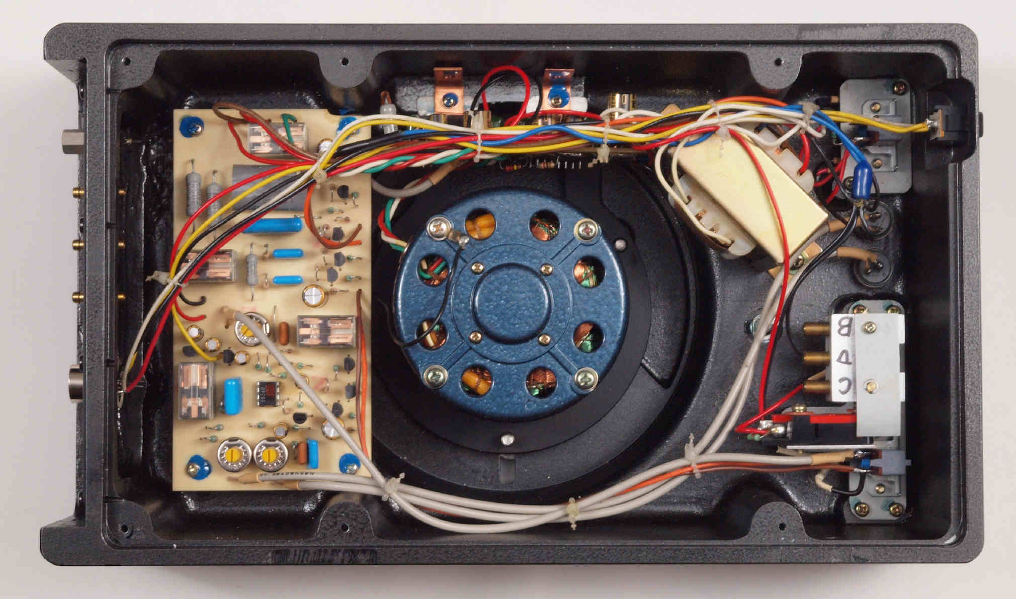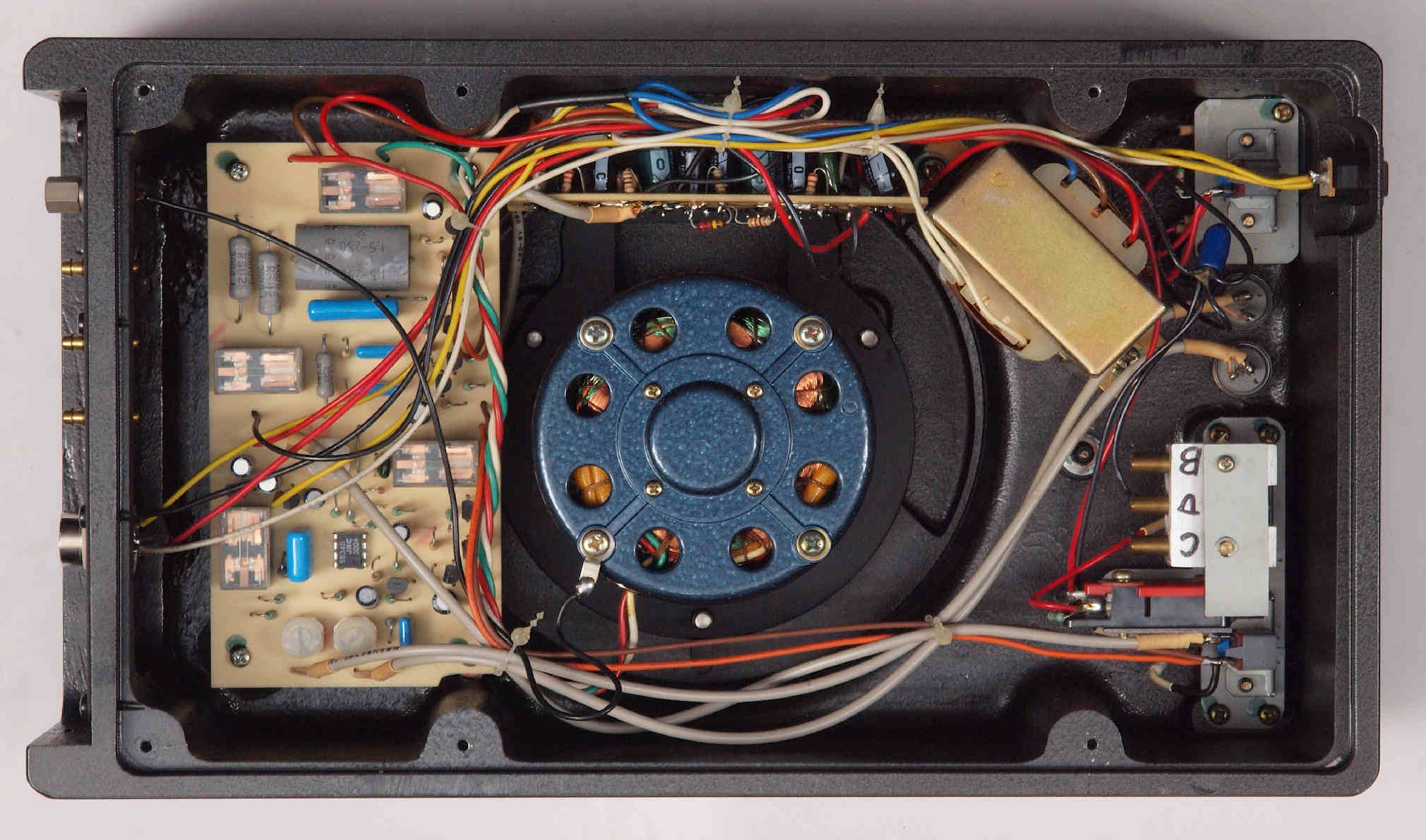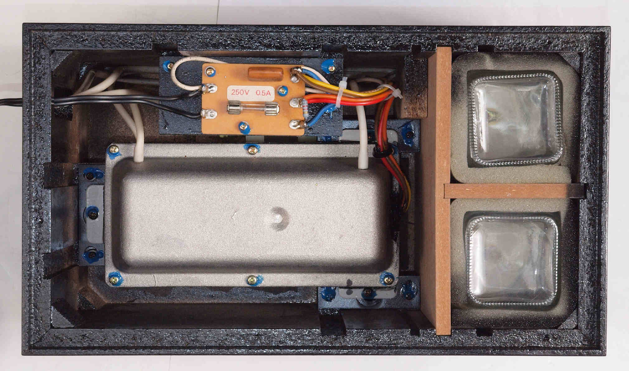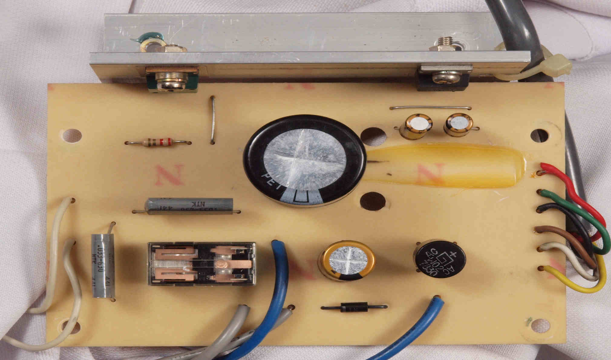 | D422. 修理後 下から見る。ケースが鉄製なので、ICの放熱を助ける為、銅板を取り付け。 |