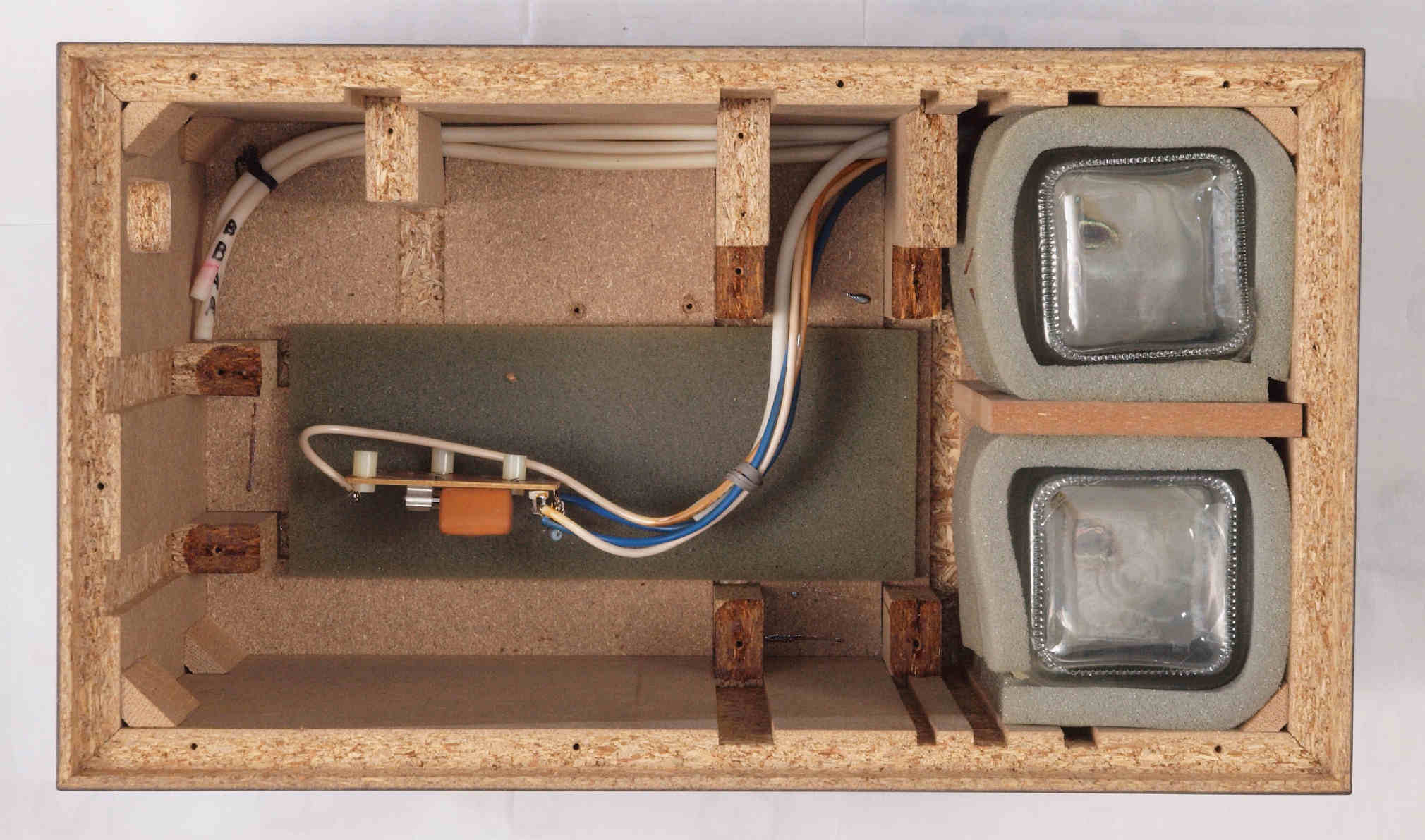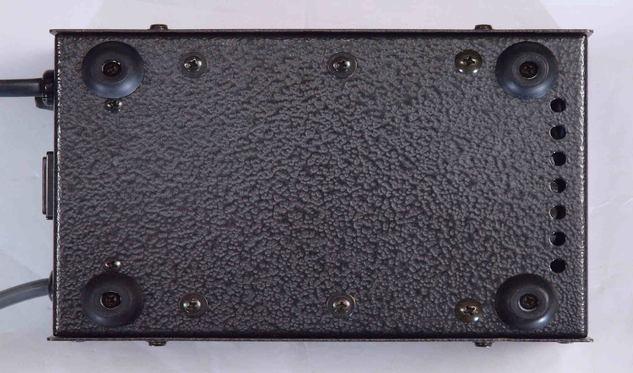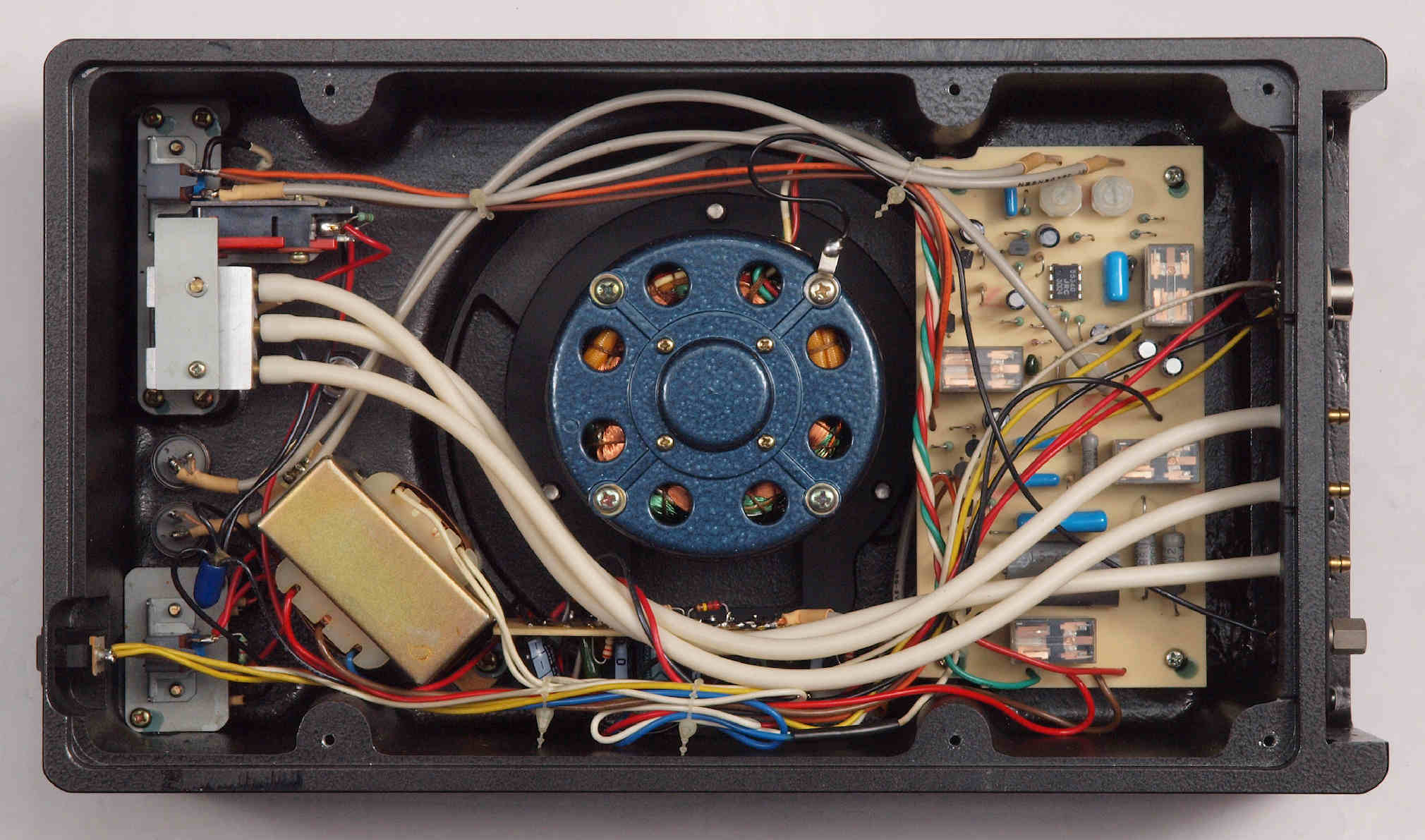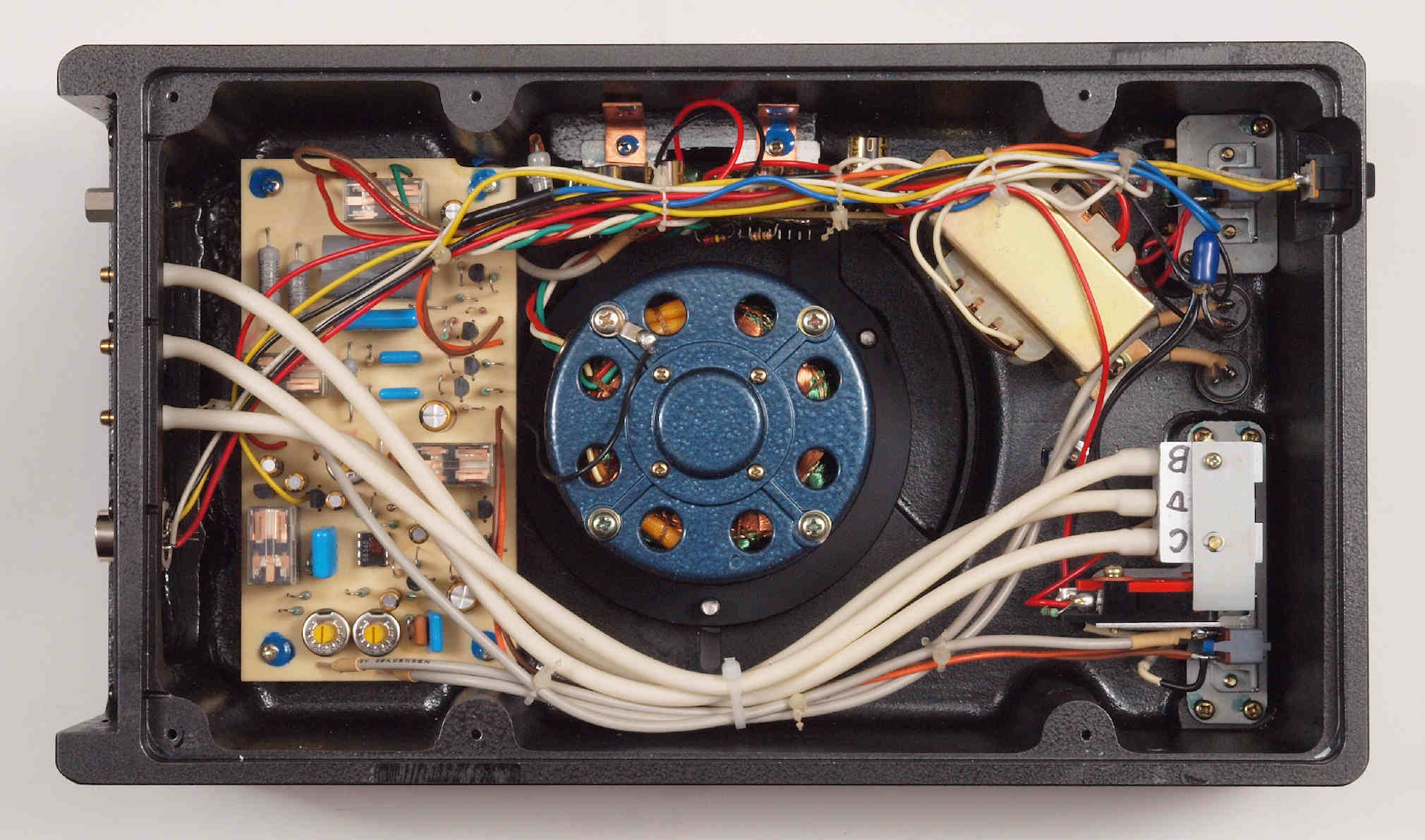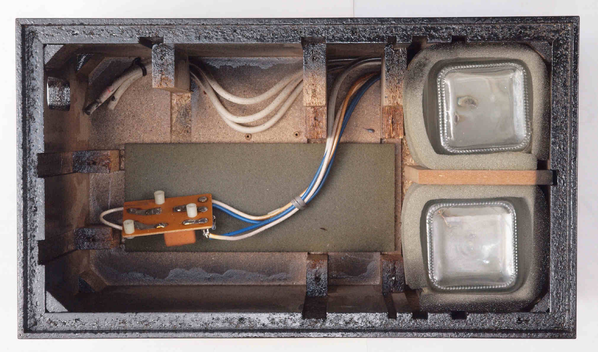 | D422. 修理後 下から見る。ケースが鉄製なので、ICの放熱を助ける為、銅板を取り付け。 |