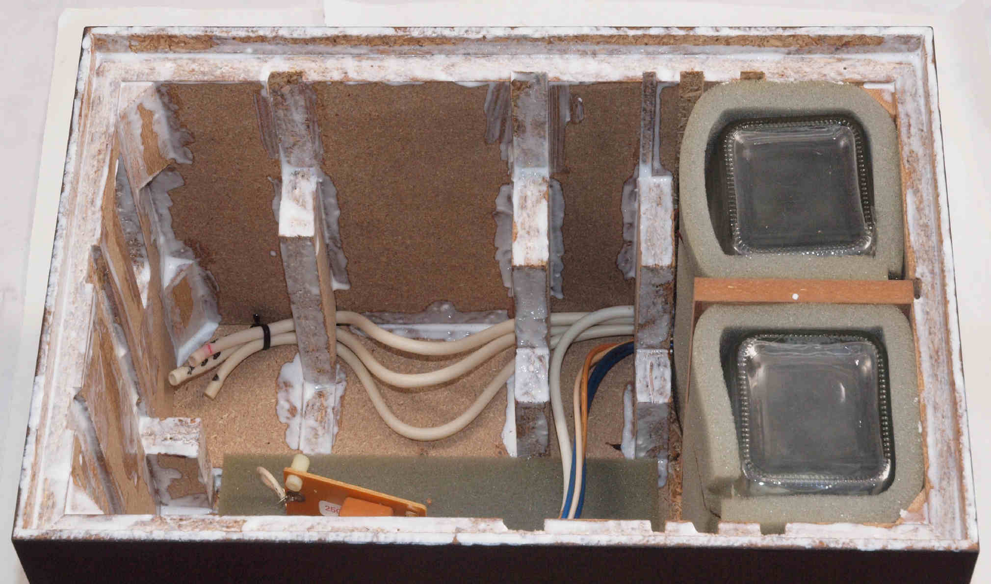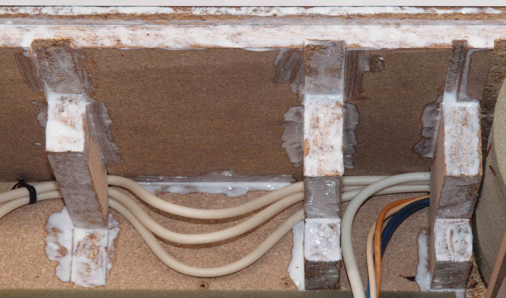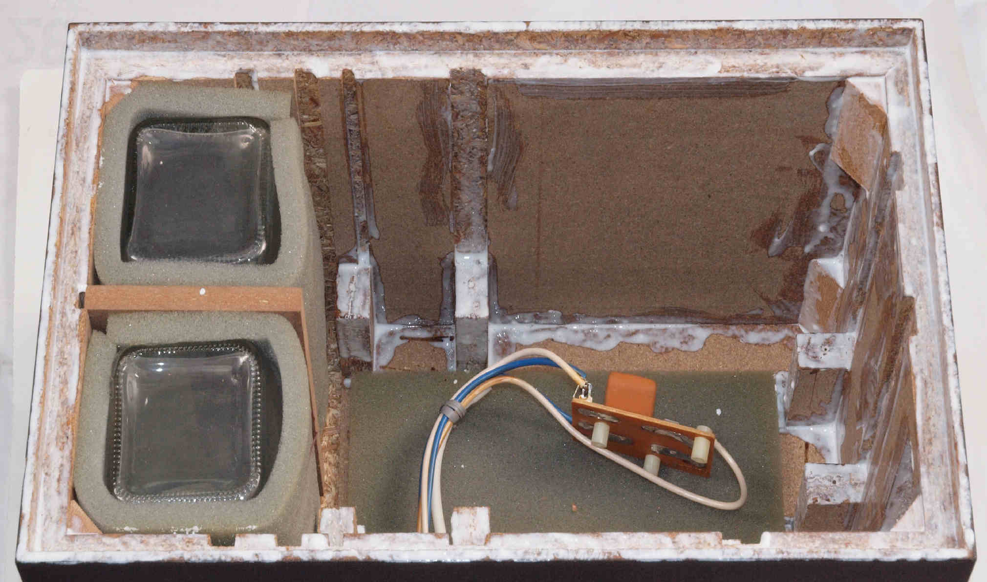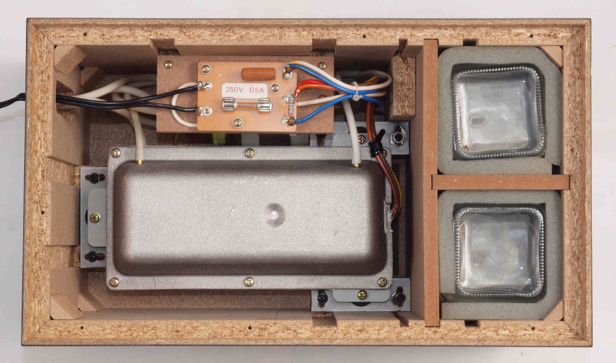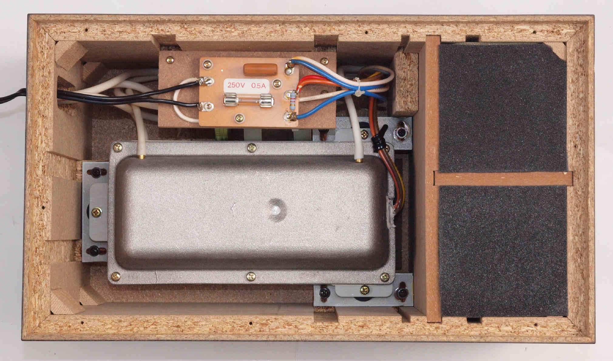 | C62. 修理中 木ネジで割れた、「ポンプ取り付け圧縮板」、「フューズ取付圧縮板」、ボンドを染みこませる。 |