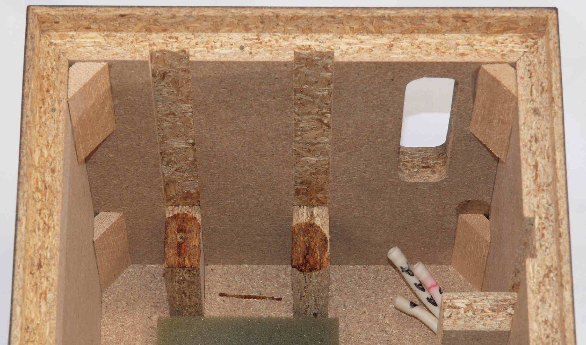 | C41. 修理前 接着材が劣化した木箱圧縮板右側。 |