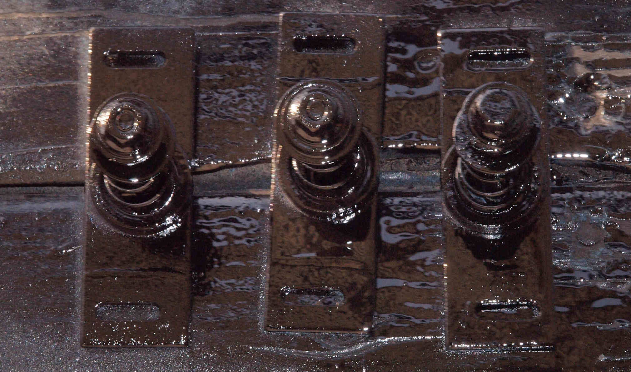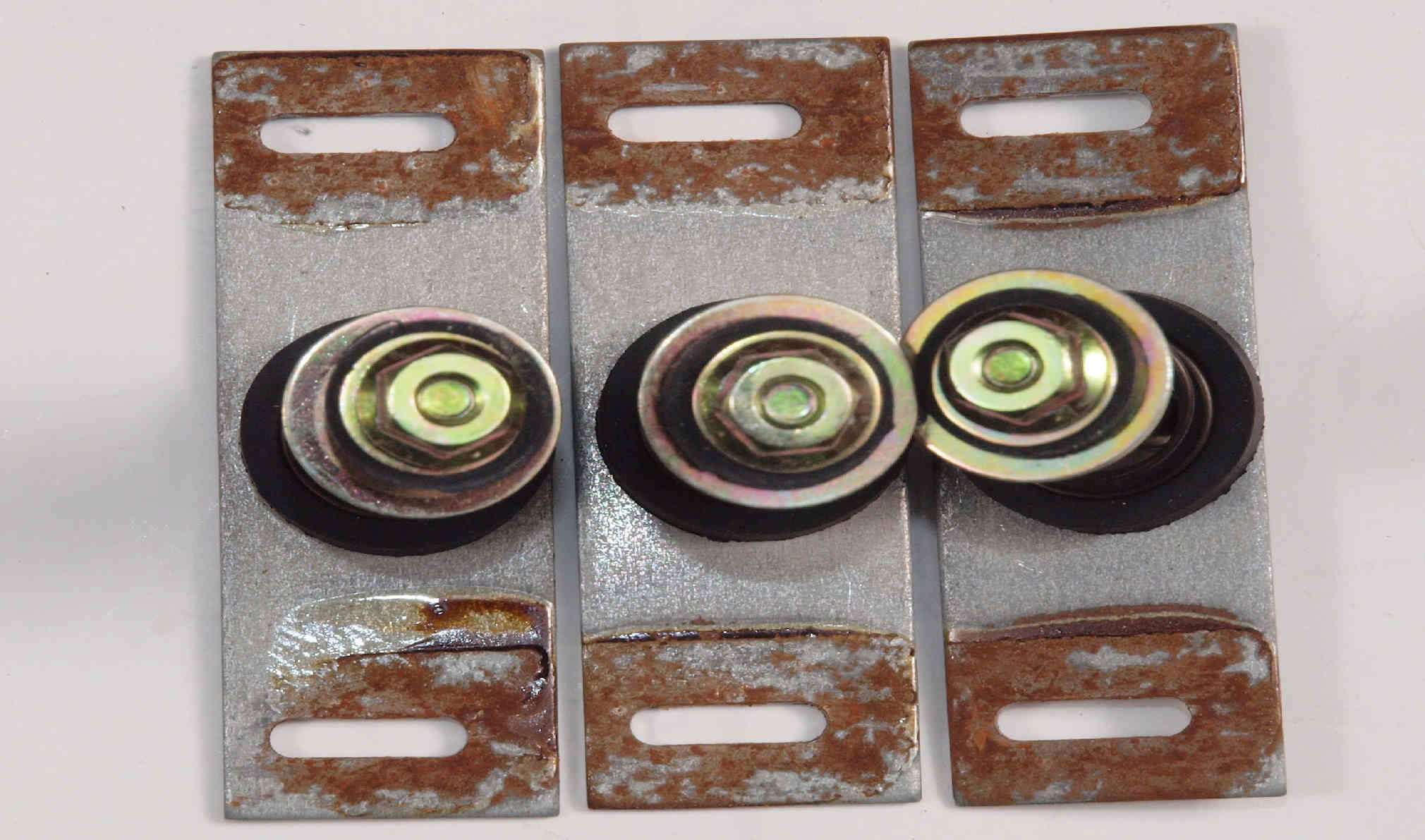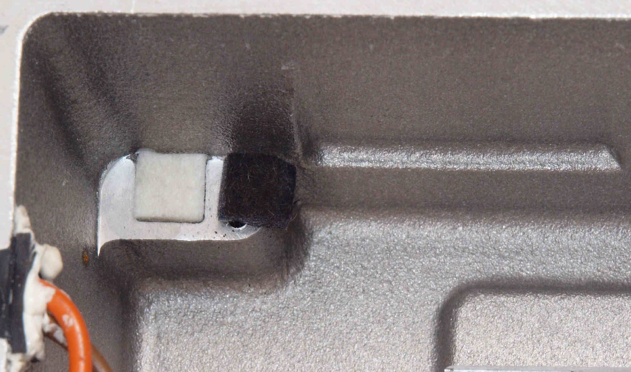 | C61. 修理前 木ネジで割れた、「フューズ取付圧縮板」、「ポンプ取り付け圧縮板」。 |