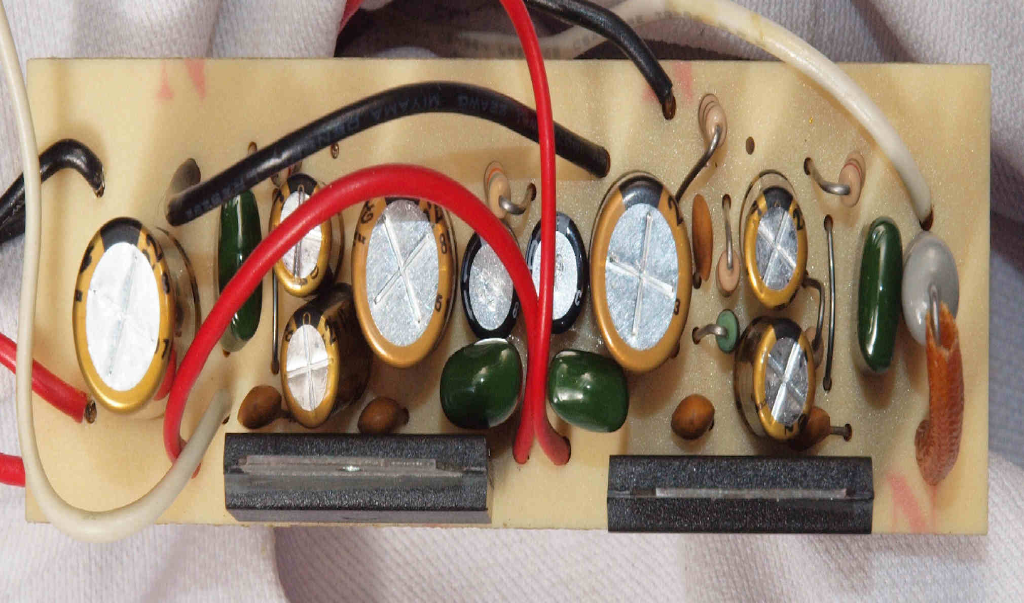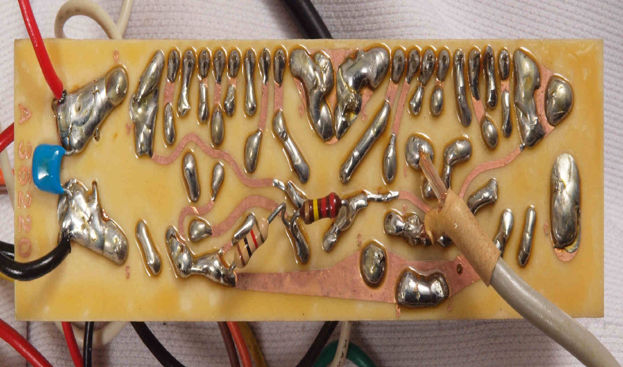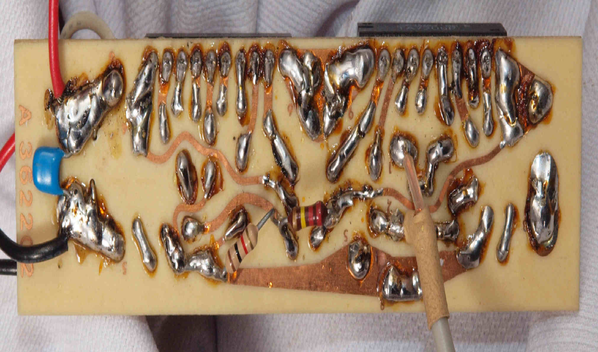| D75. 完成電源部整流基板裏。余分なフラックスを落として、コート液を塗る。 |