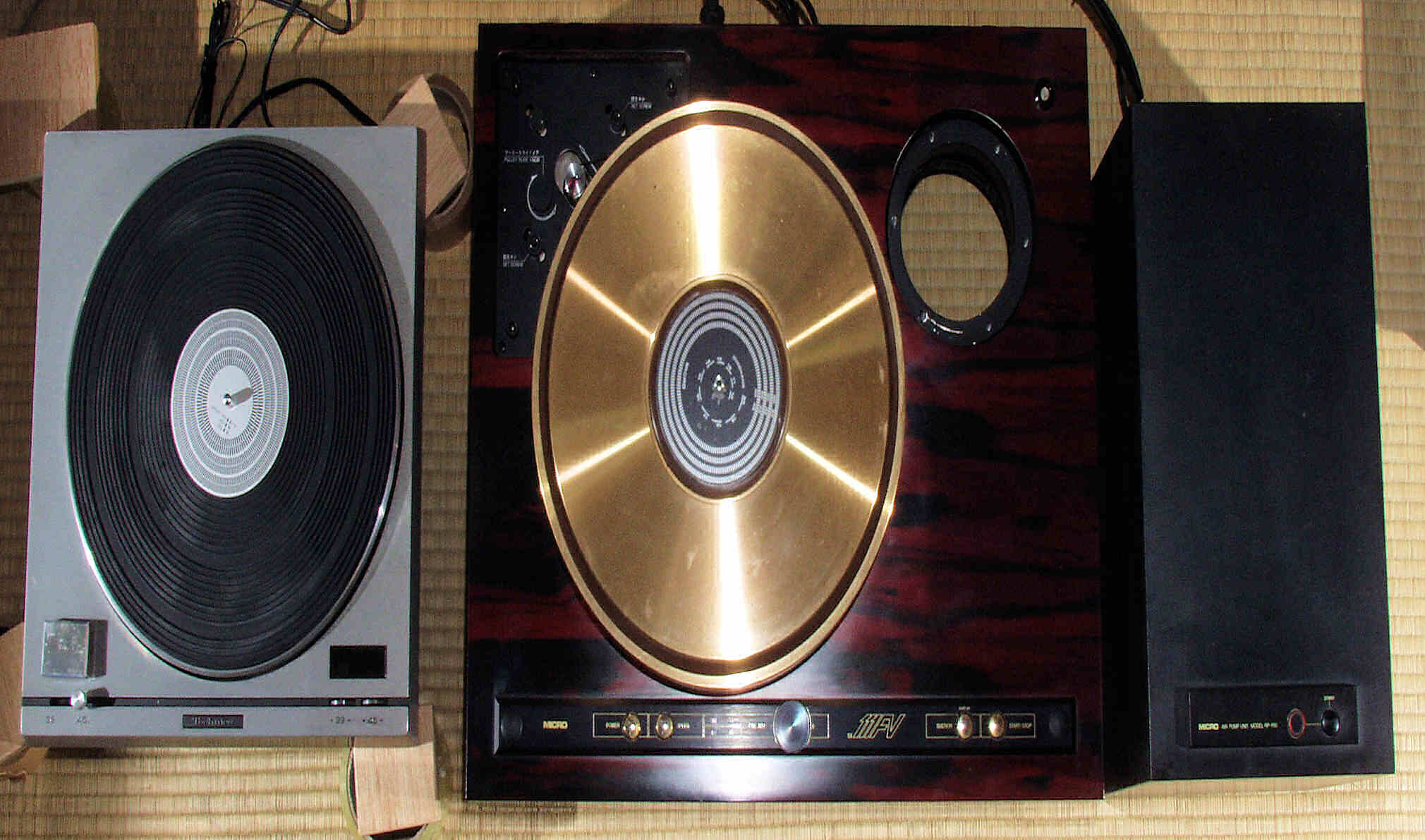 | E5. 完成し24時間連続動作エージング中。 マイクロがベルトドライブ等の機械的機構で安定させたのに比べ、 純粋に電気で安定させている。 右は「MICRO SEIKI SX−111FV. 2台目」 |