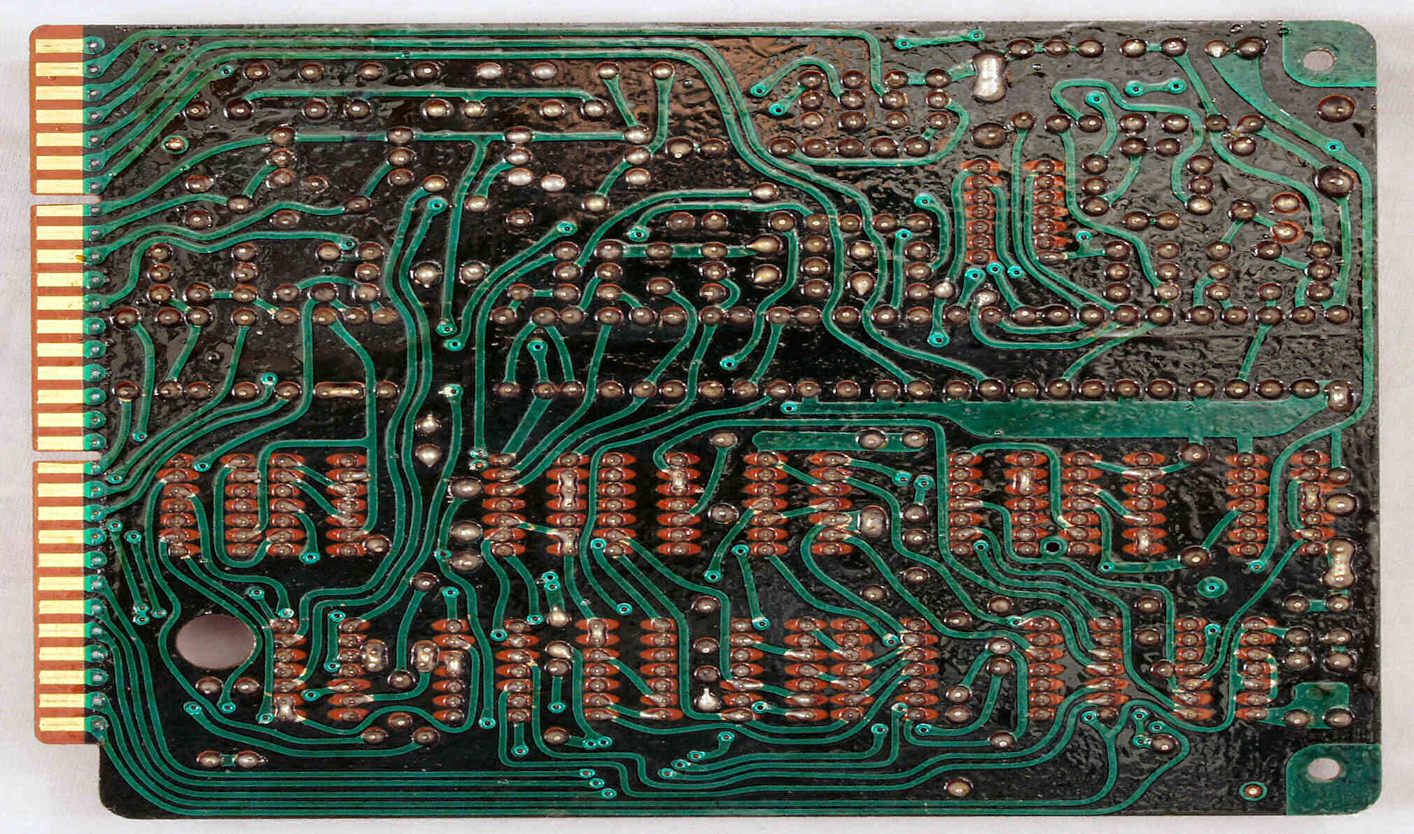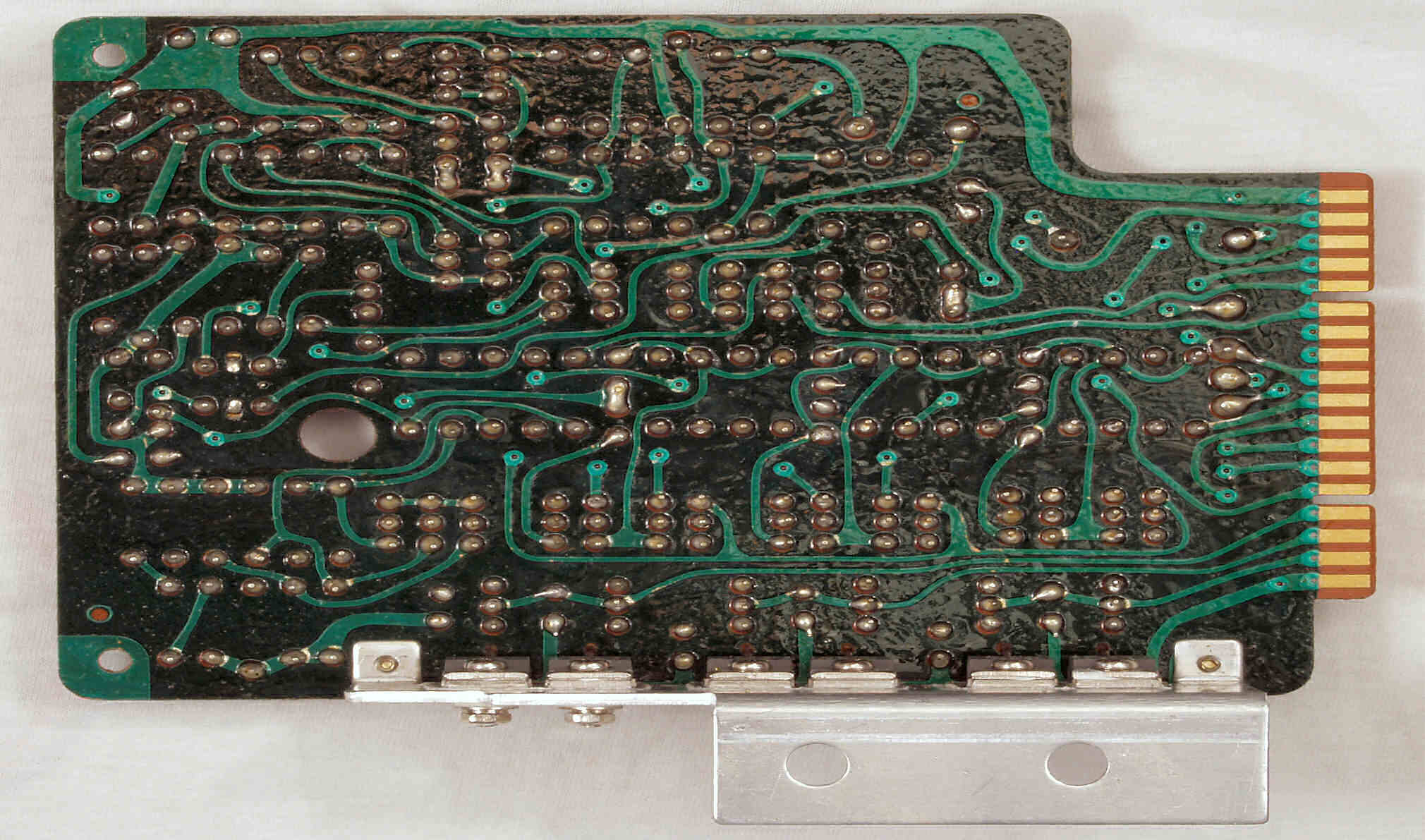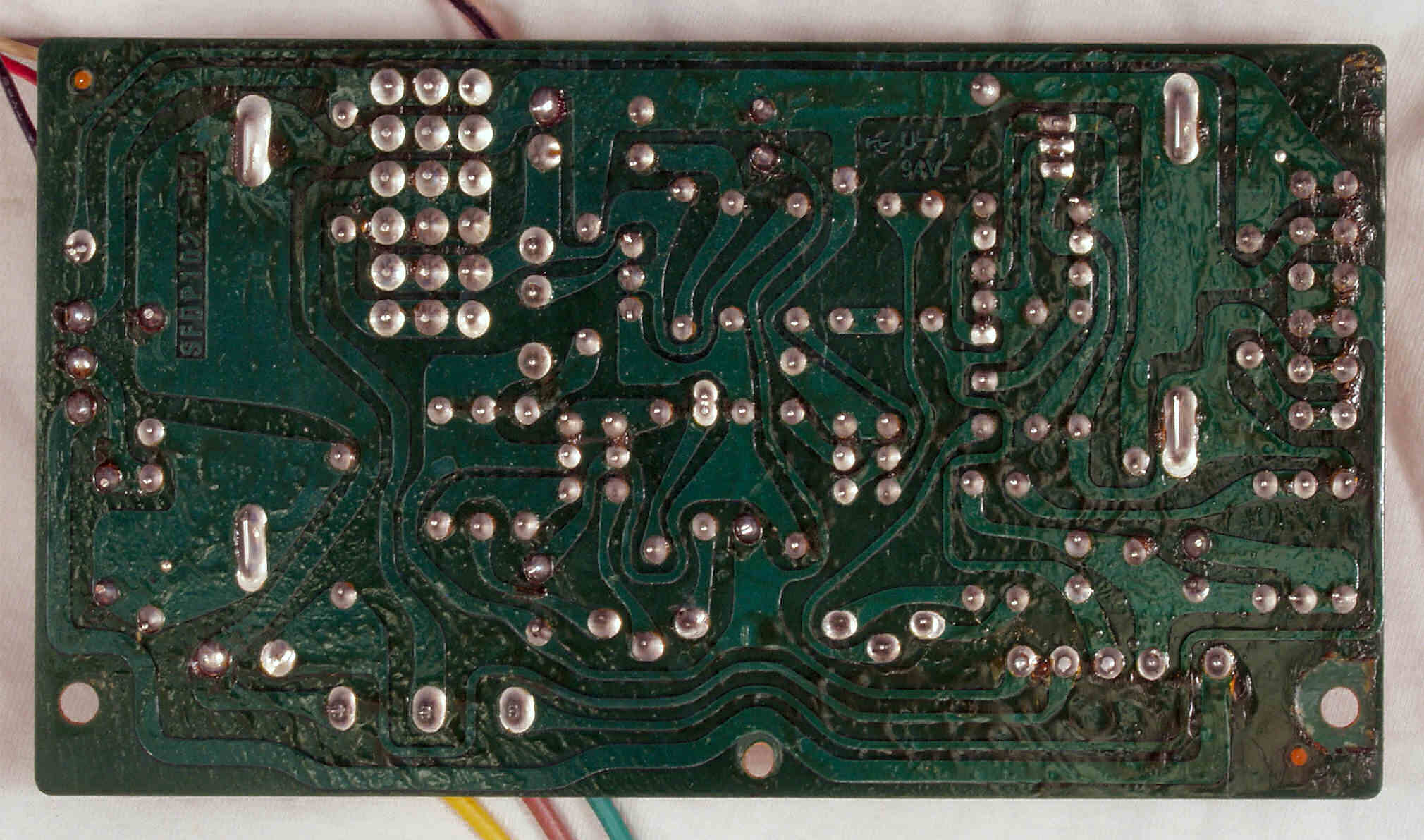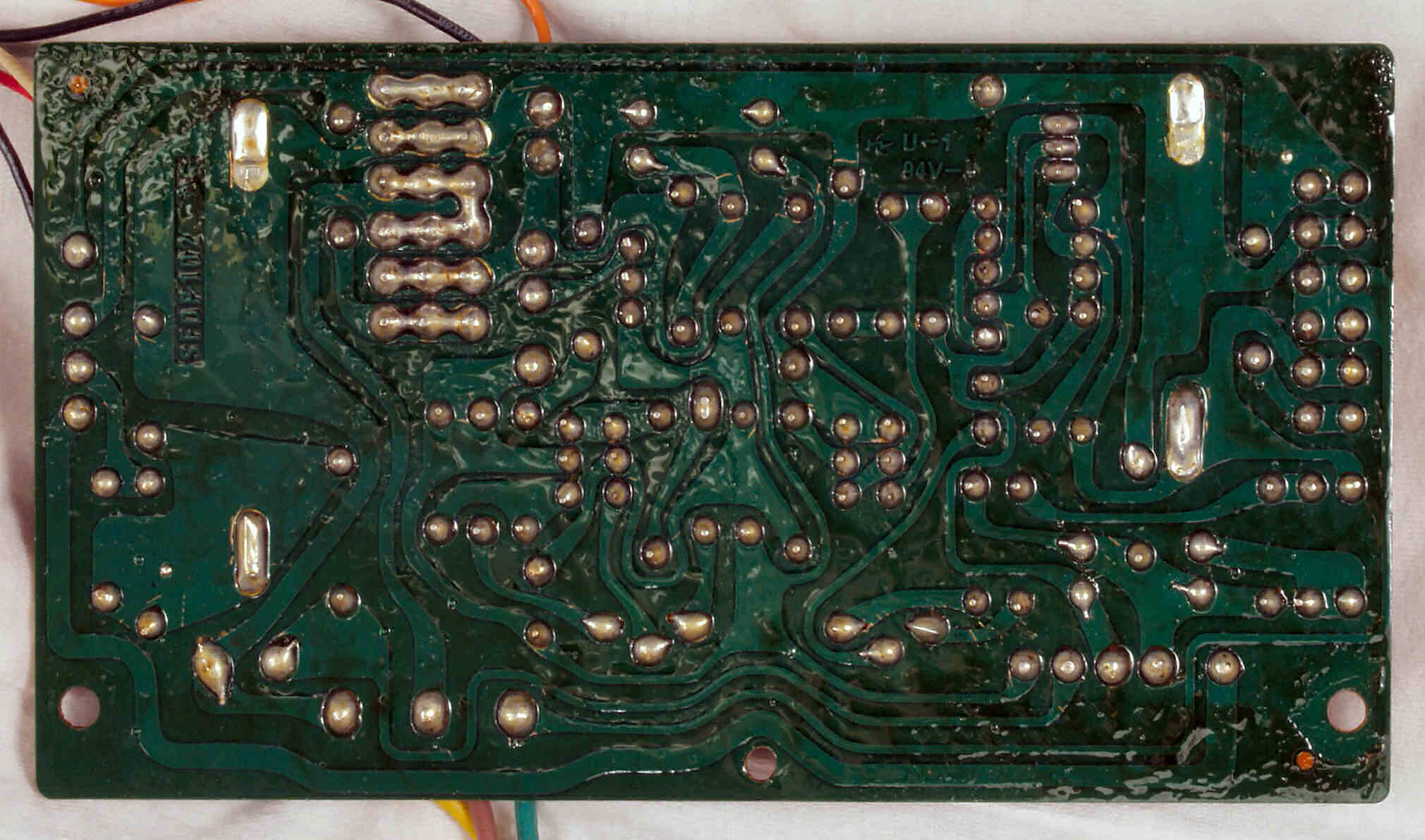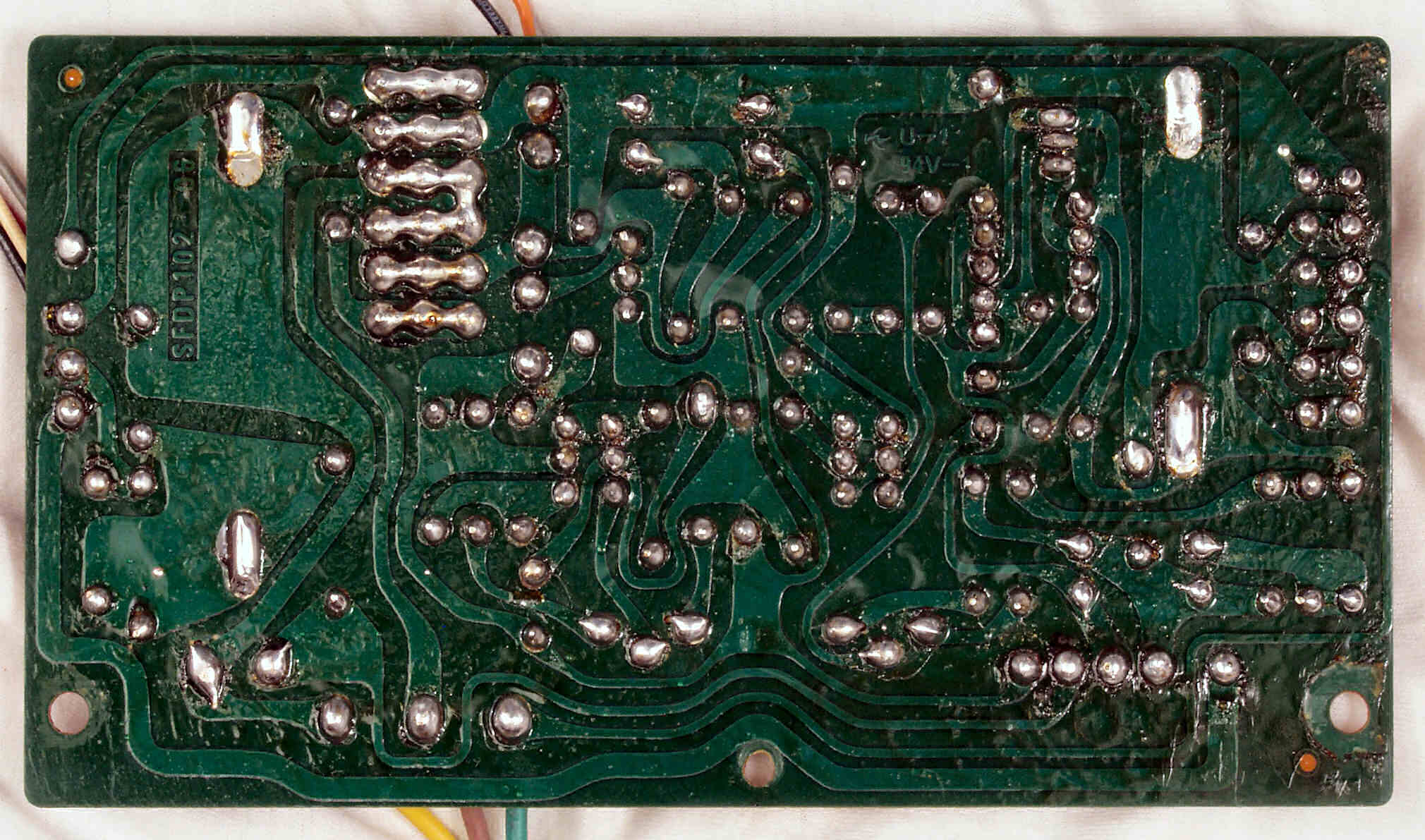 | C45. 修理(半田補正)後 基準発生・速度切替え分周基板裏。全ハンダをやり直す。 | ||||||||||||||||||||||||||||||