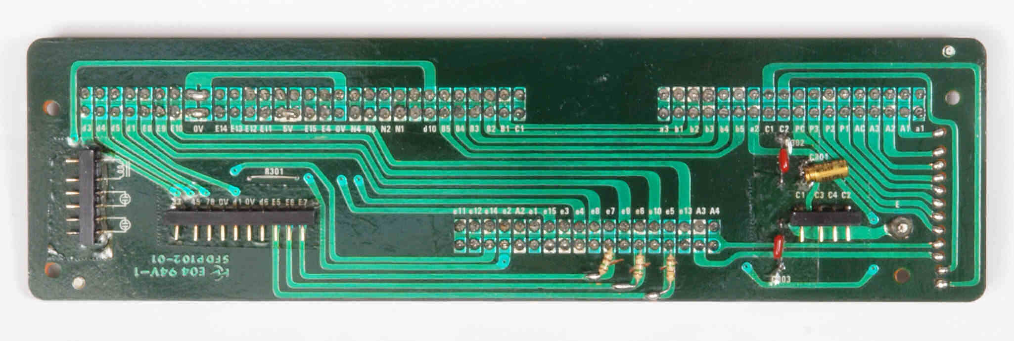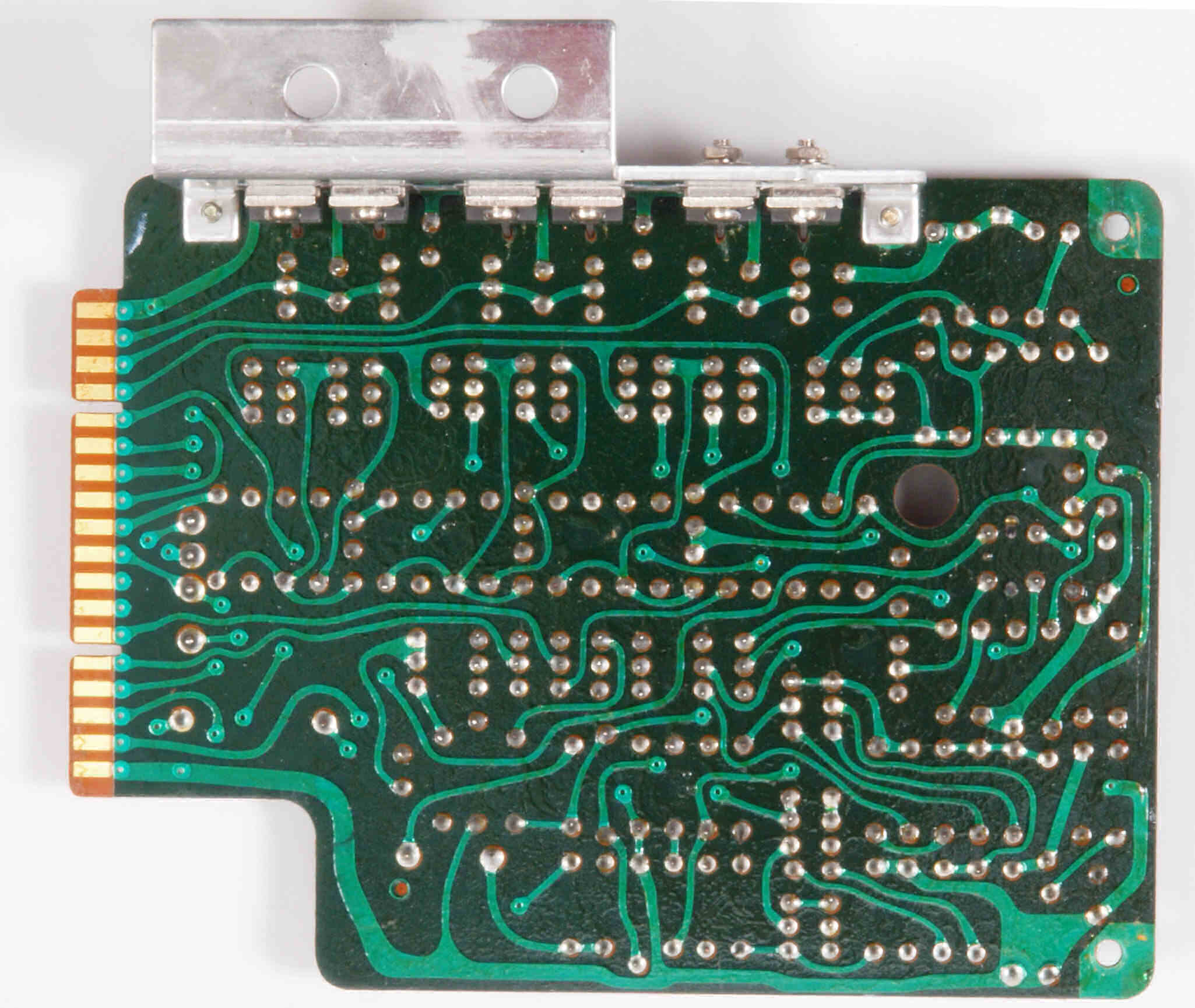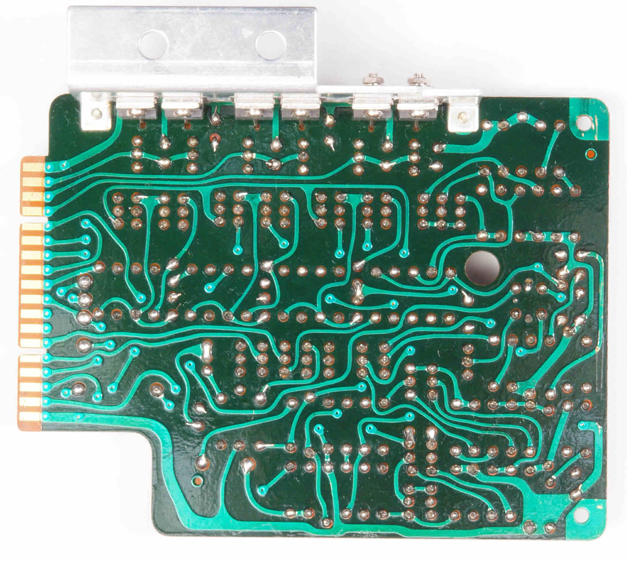 | C63. 完成基準発生・速度切替え分周基板。余分なフラックスを落として、コート液を塗る。前回の修理で割れた、角の固定穴を補強する。 | ||||||||||||||||||||||||||||||||||||
