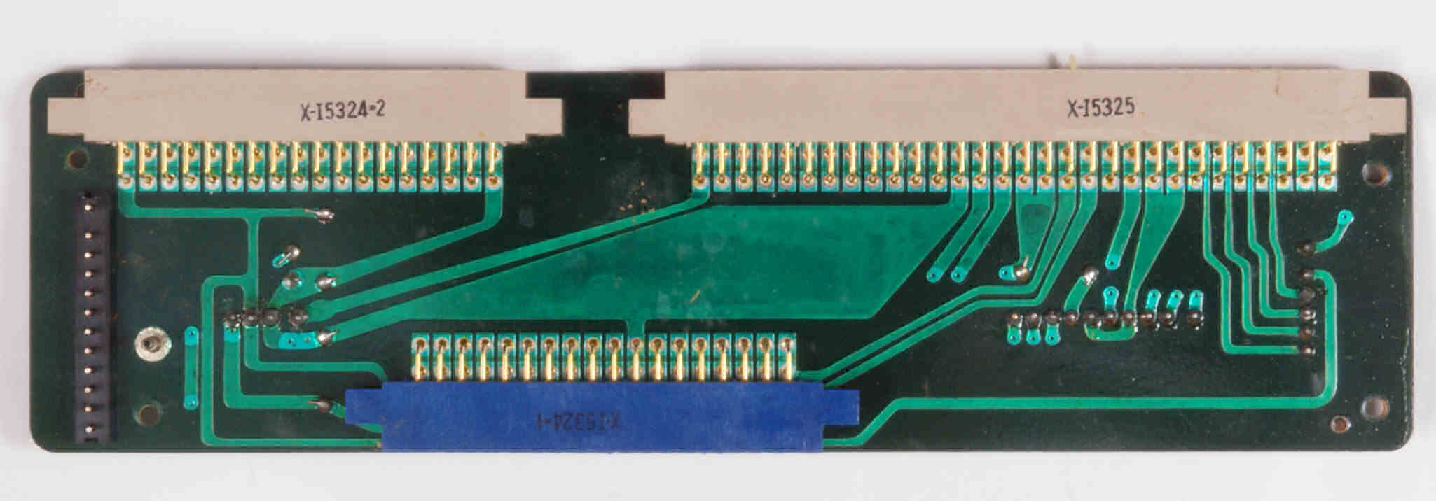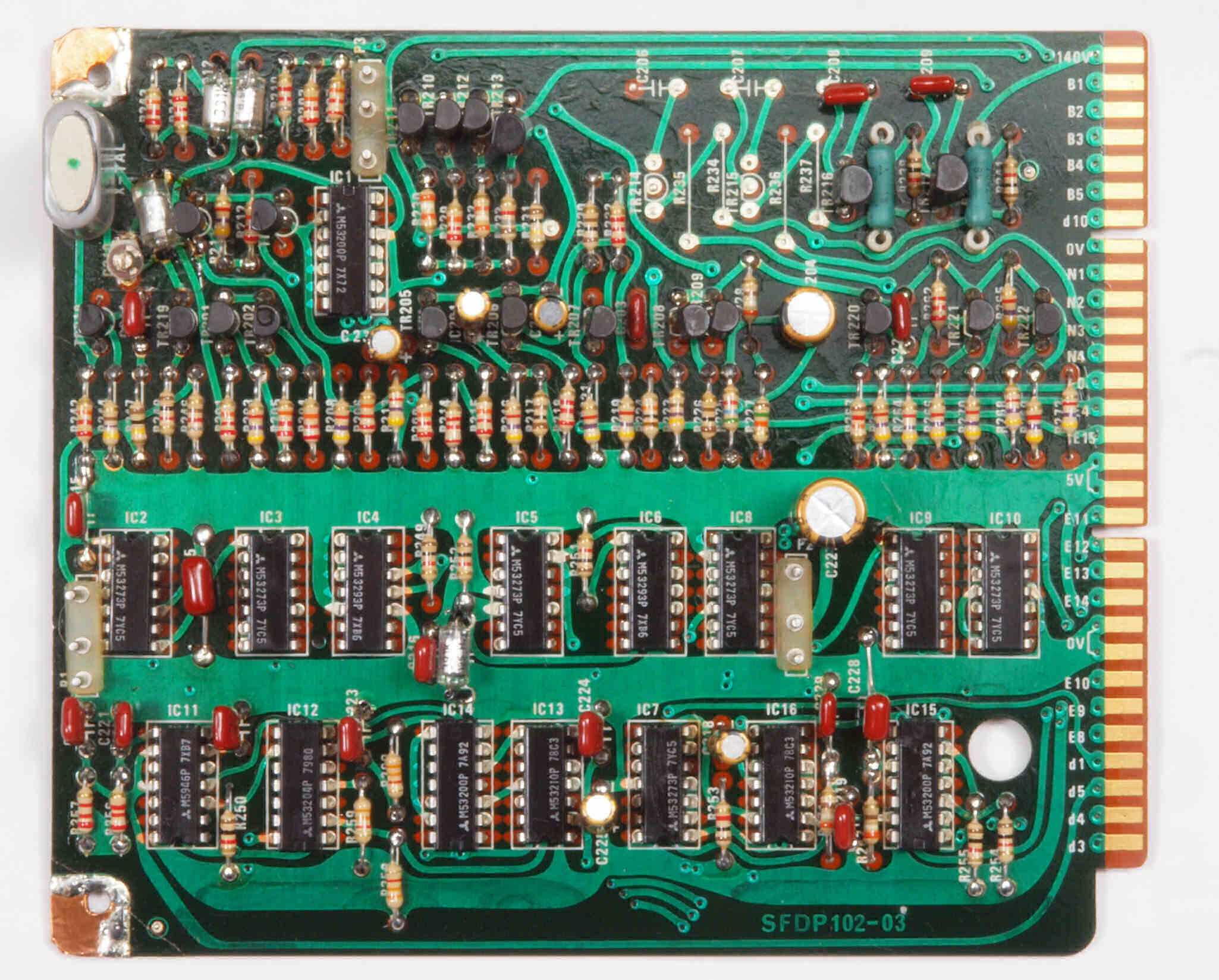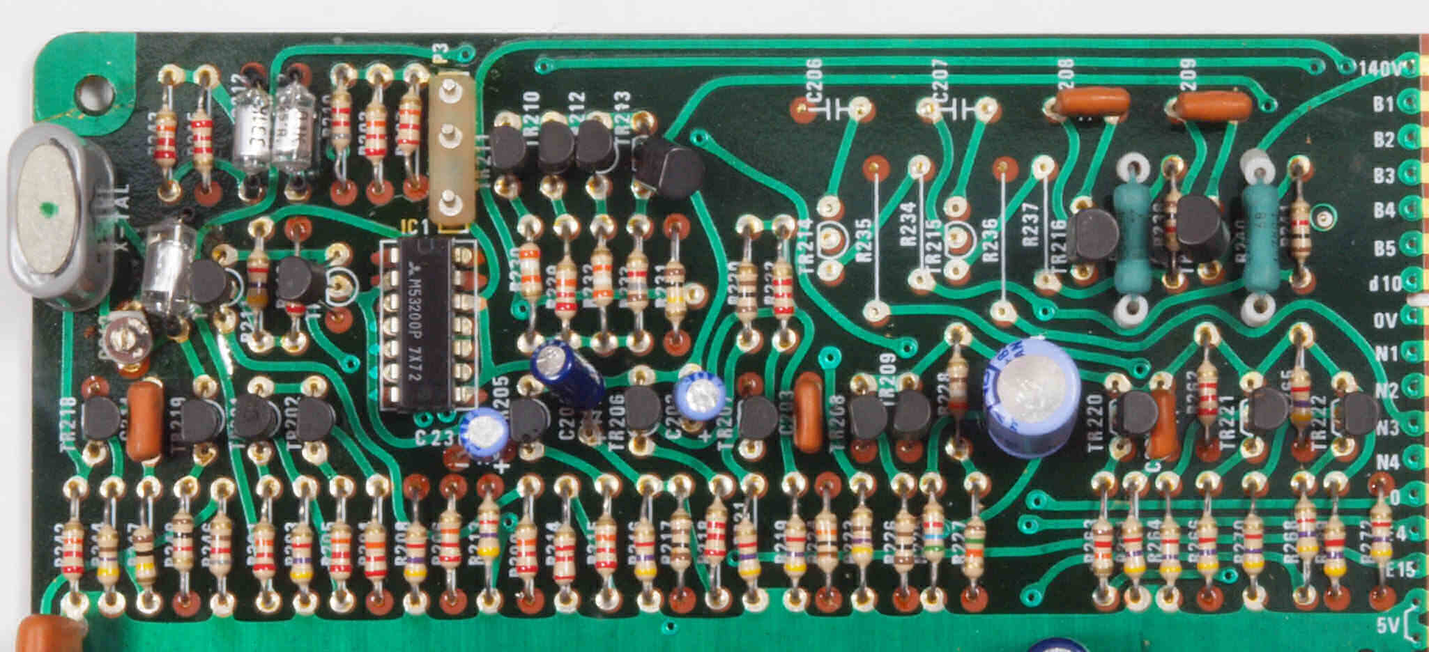 | C63. 完成基準発生・速度切替え分周基板。余分なフラックスを落として、コート液を塗る。前回の修理で割れた、角の固定穴を補強する。 | ||||||||||||||||||||||||||||||||||||