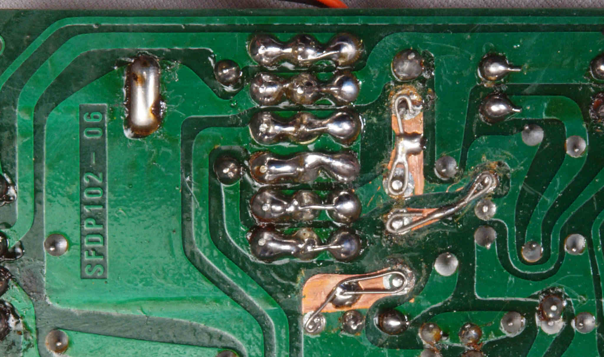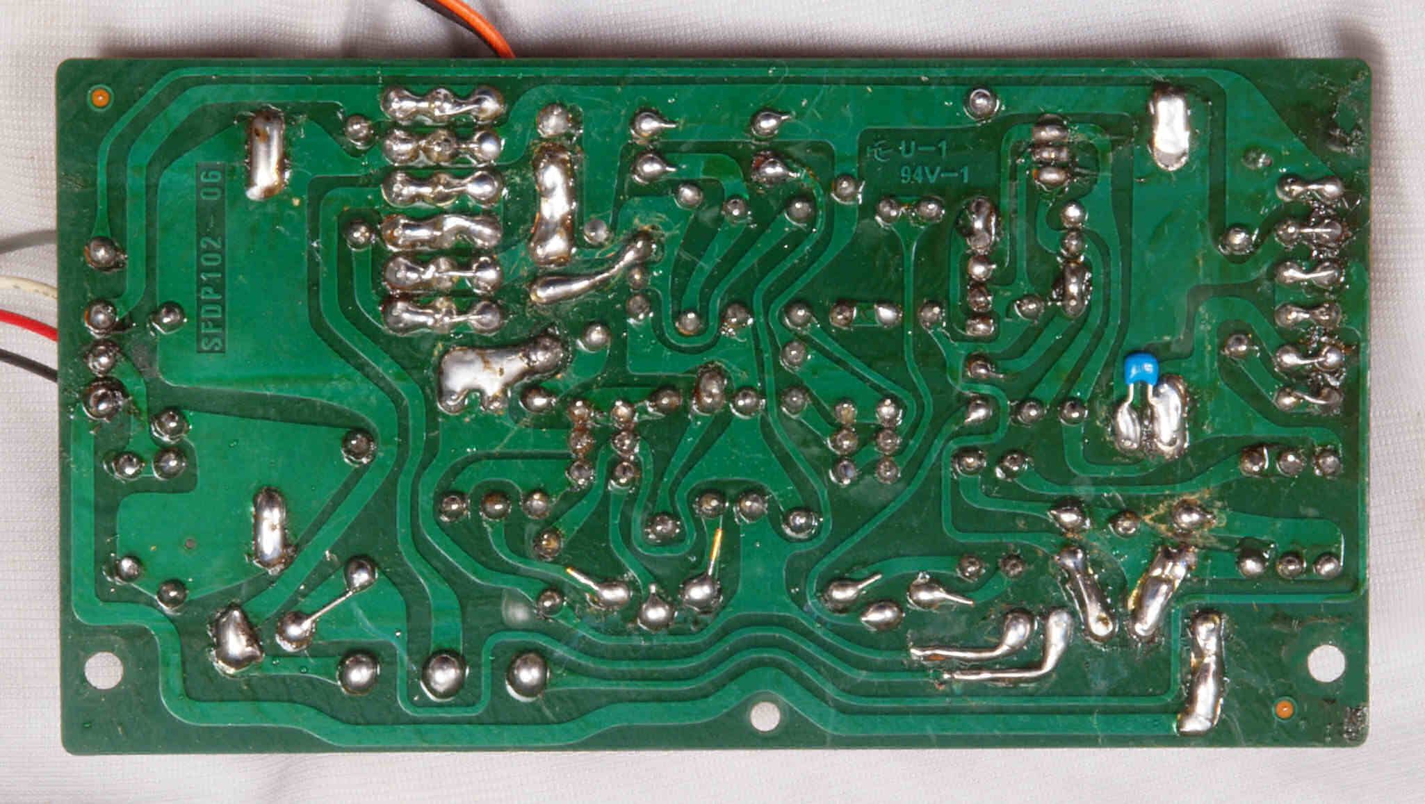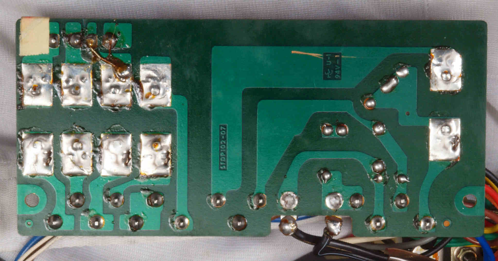 | C95. 修理(半田補正)後 メイン基板裏。全ハンダをやり直す。電解コンデンサー1個、フイルムコンデンサー2個交換。 | ||||||||||||||||||||||||||||||||||||
