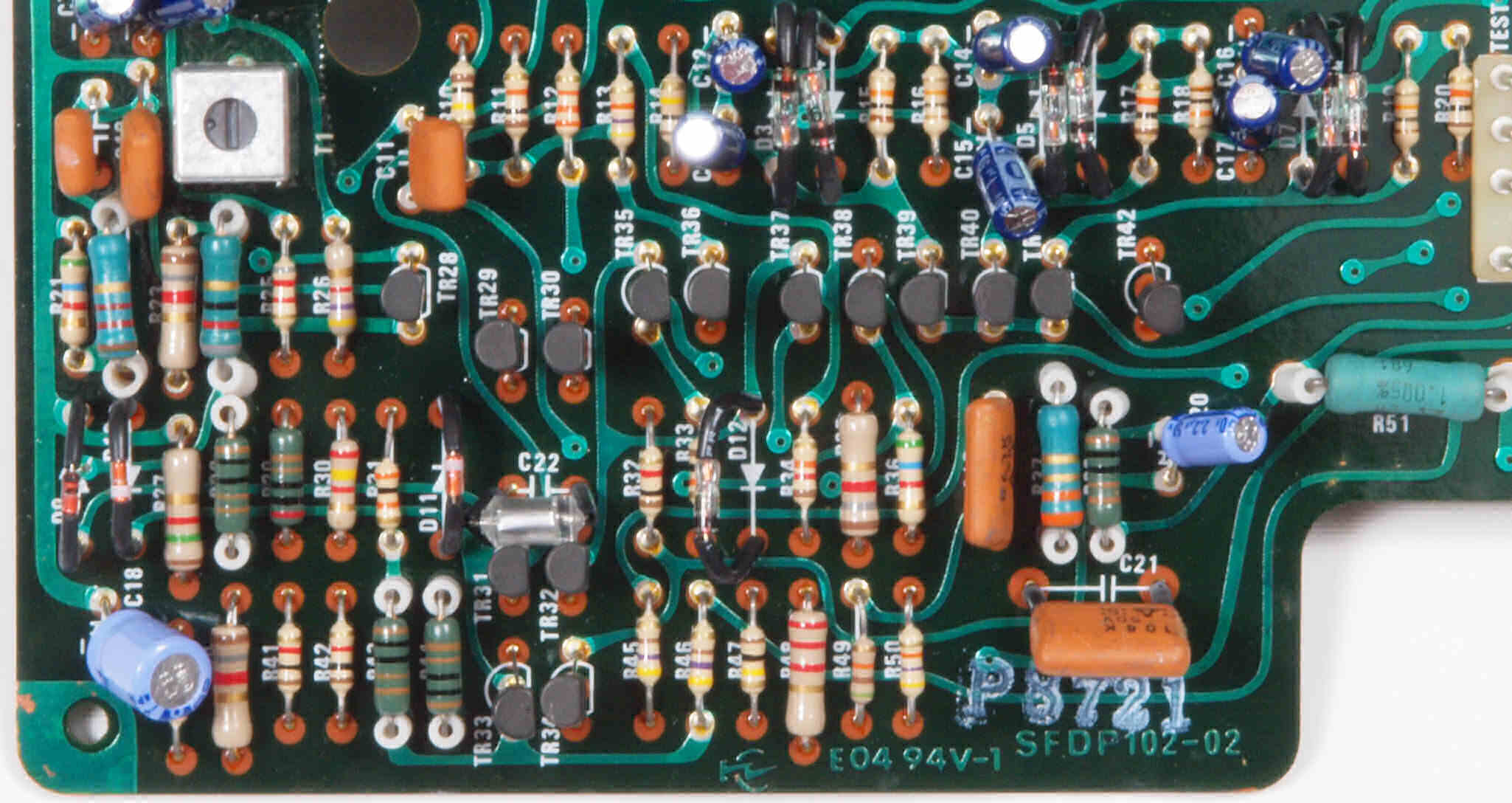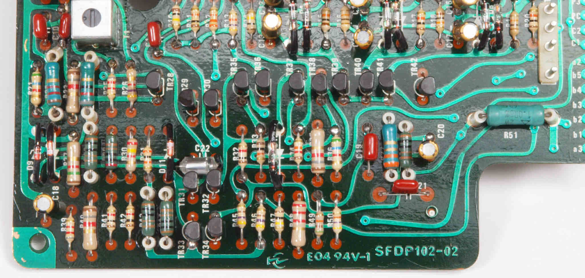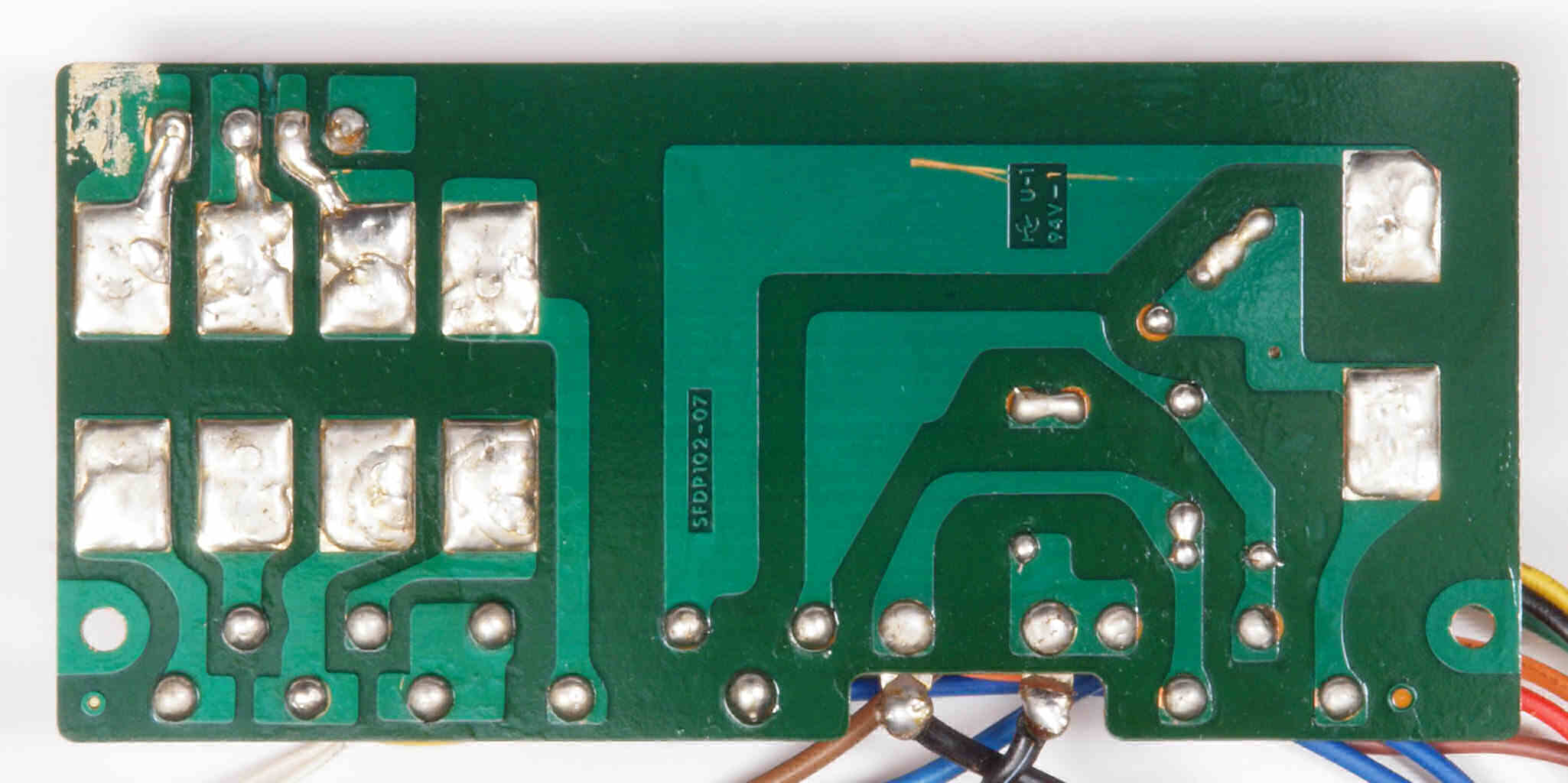 | C95. 修理(半田補正)後 メイン基板裏。全ハンダをやり直す。電解コンデンサー1個、フイルムコンデンサー2個交換。 | ||||||||||||||||||||||||||||||||||||