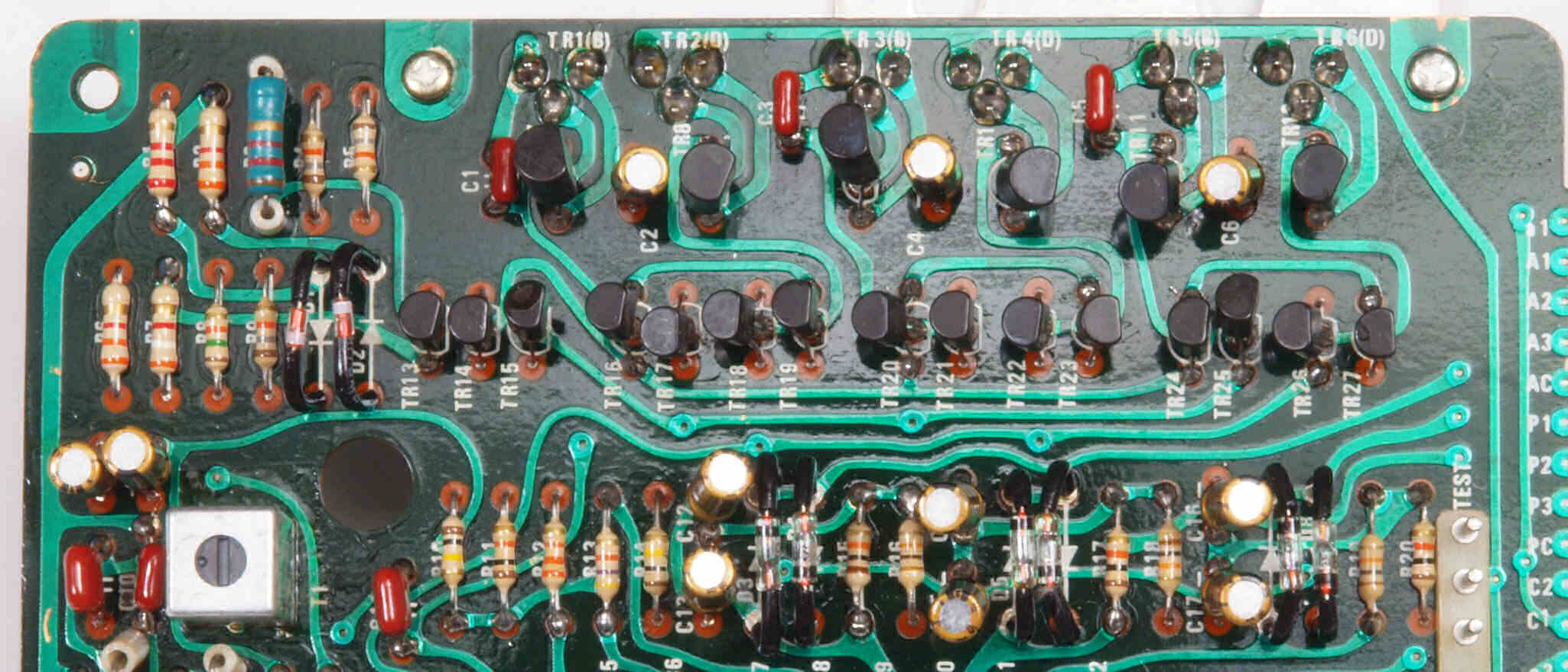 | C12. 修理後 電源定電圧基板 電解コンデンサー7個、半固定VR2個、TR(トランジスター)2個交換 | ||||||||||||||||||||||||||||||||||||