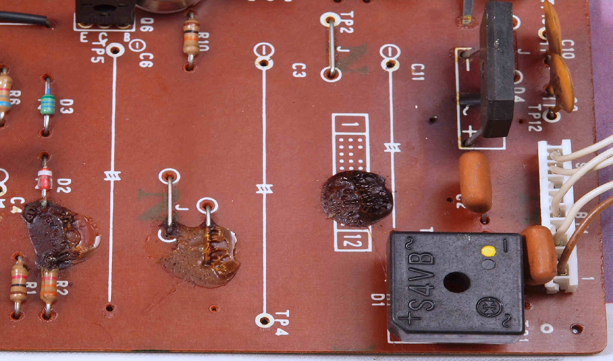 | C212. 修理中 定電圧回路基板、 整流ブリッジが交換されている。 電解コンデンサーの液漏れ! | ||||||||||||||||||||||||||||||||||||||||