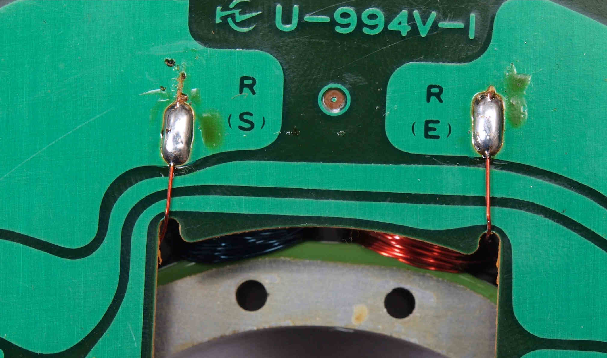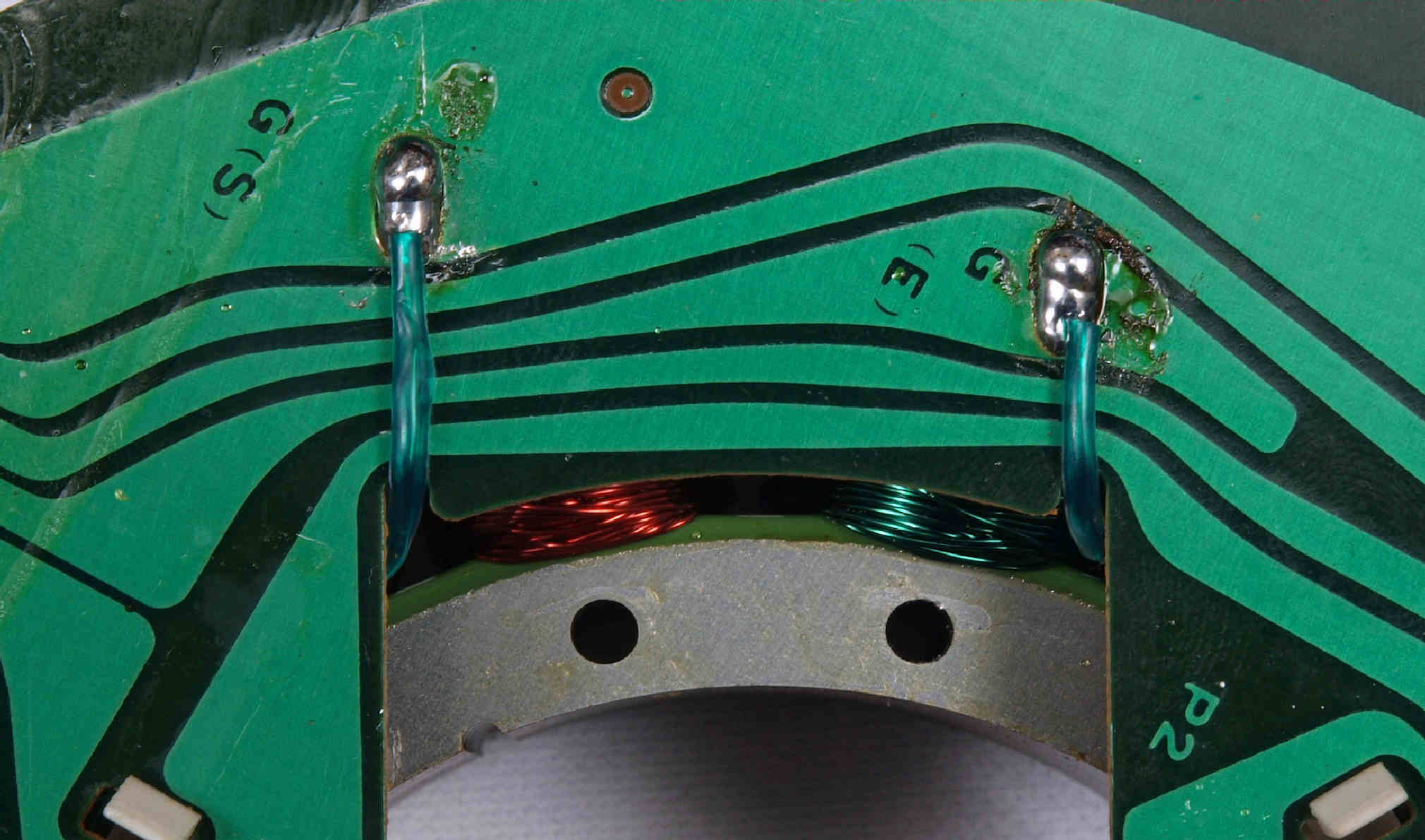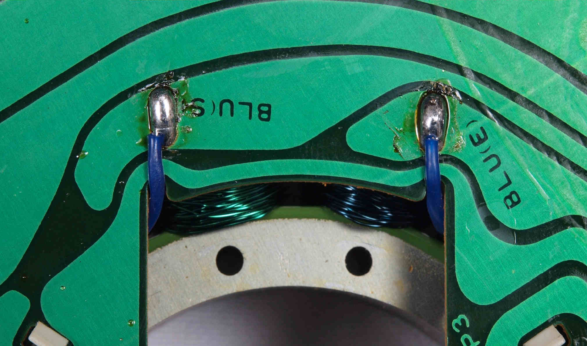 | M413. 修理中、 アマチュア(回転子)基盤裏巻線半田、引き出し線が絶縁していない!(BLUE巻線)拡大 | ||||||||||||||||||||||||||||||||||||||||
