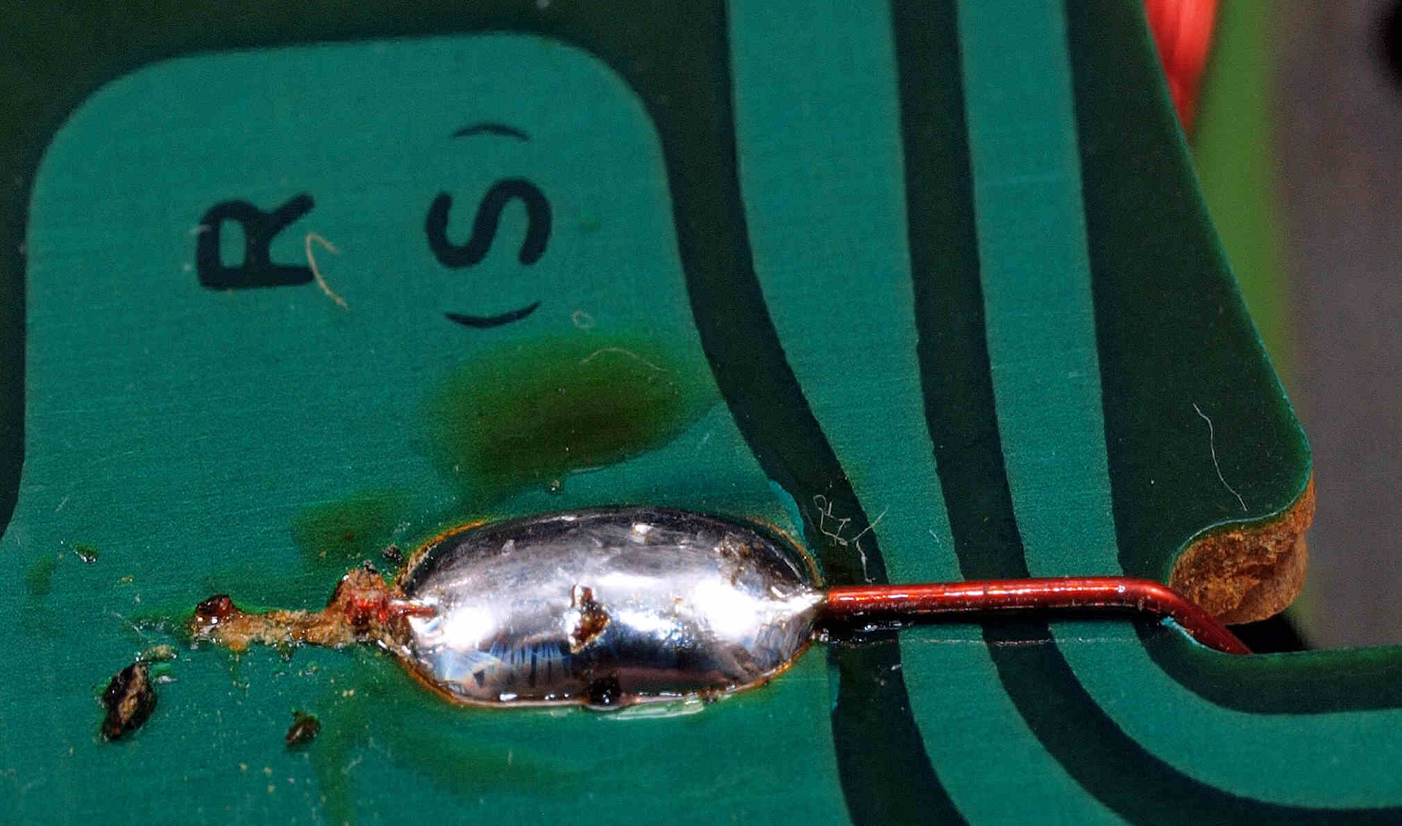 | M312. 修理中、 アマチュア(回転子)基盤裏巻線半田、引き出し線が絶縁していない!(RED巻線)拡大 | ||||||||||||||||||||||||||||||||||||||||