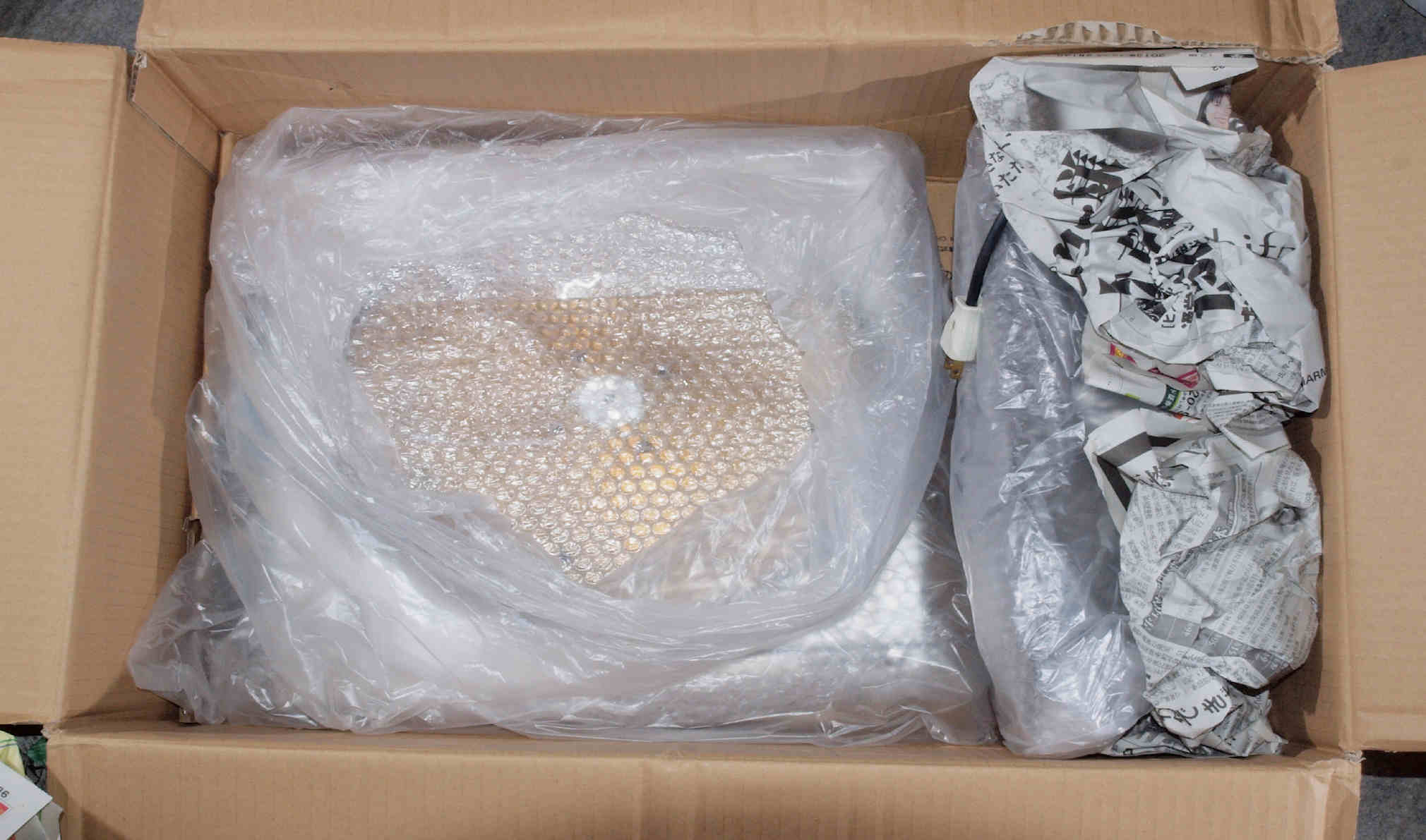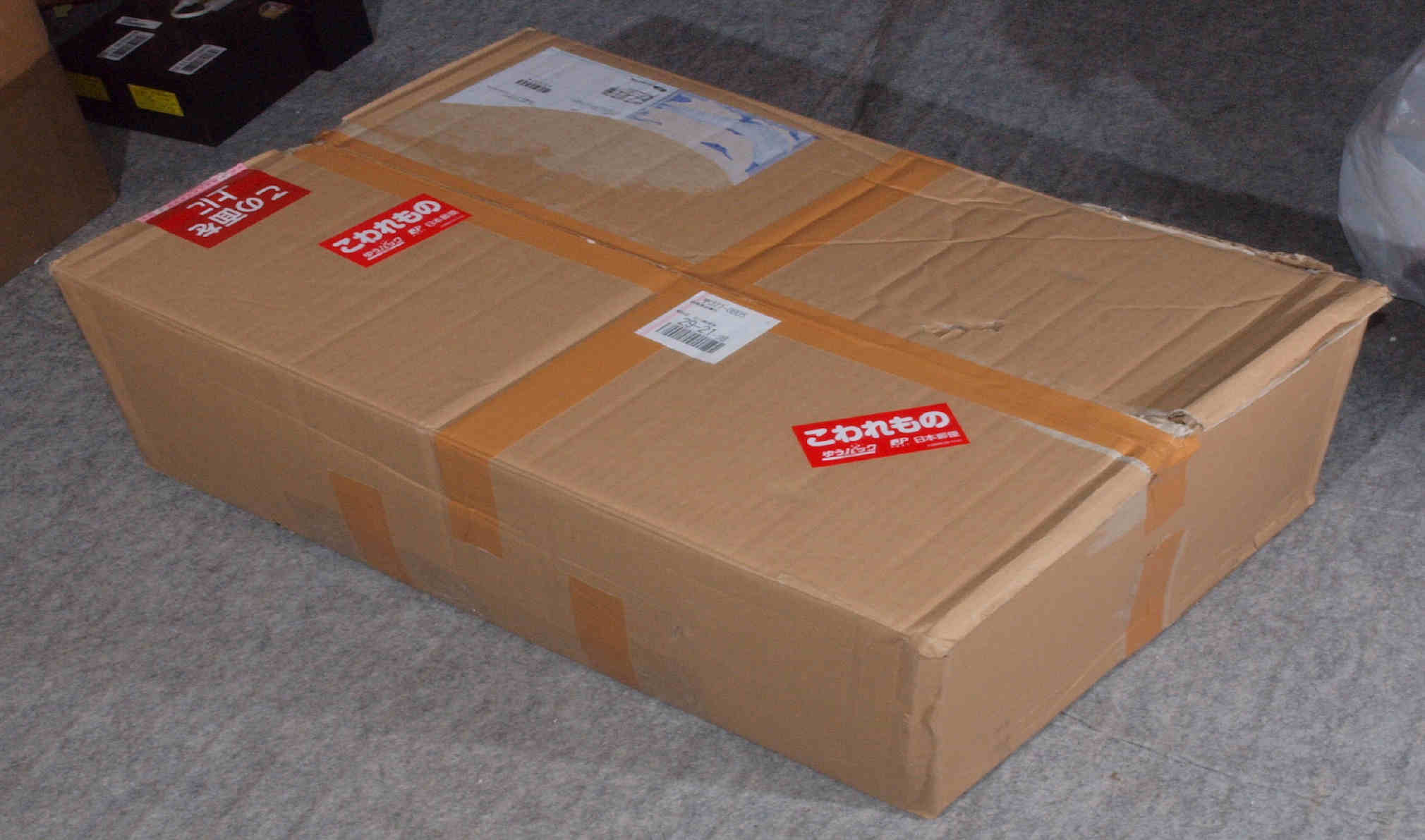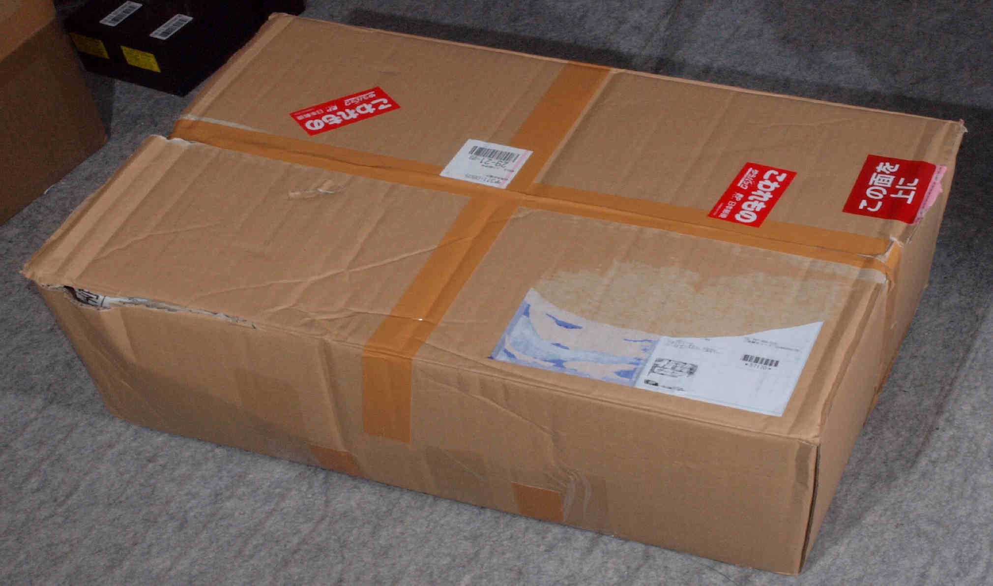 | A. 修理前の状況。 画像をクリックすると、大きく(横幅2050ドット)表示されます。 A01. 点検中 梱包の様子、弱い1重ねのダンボール。 |
