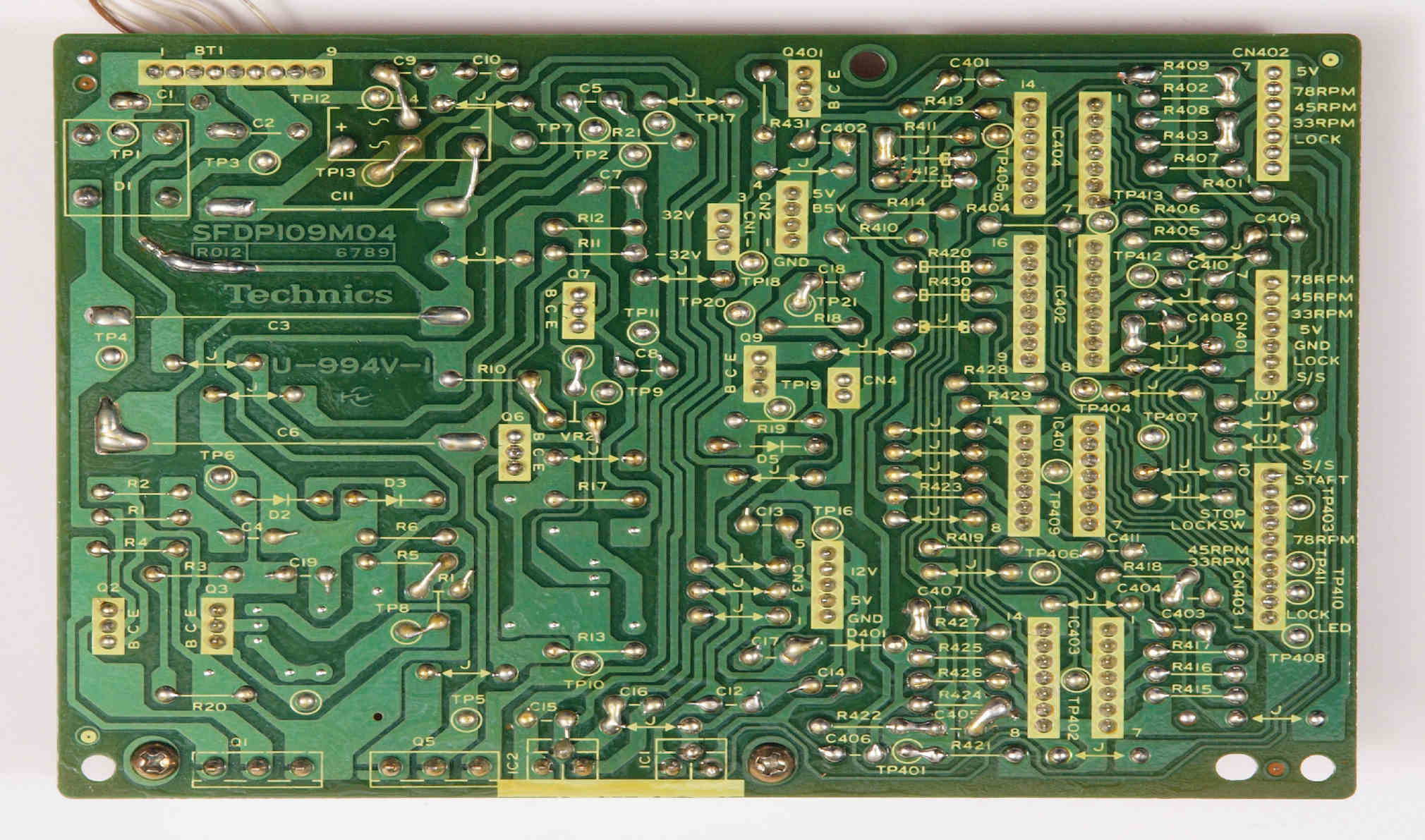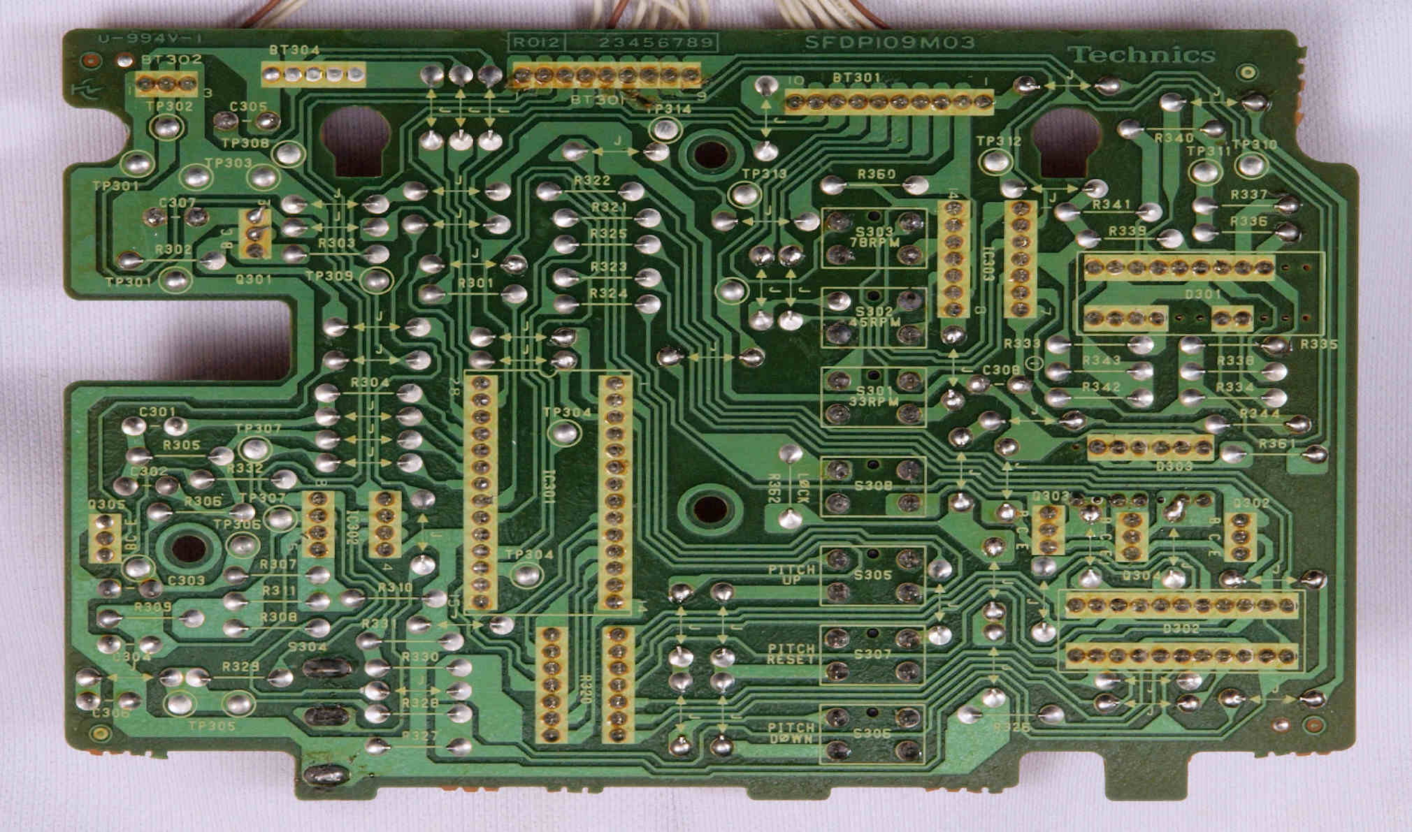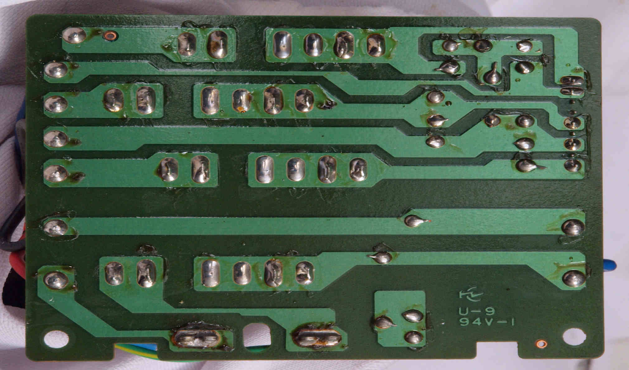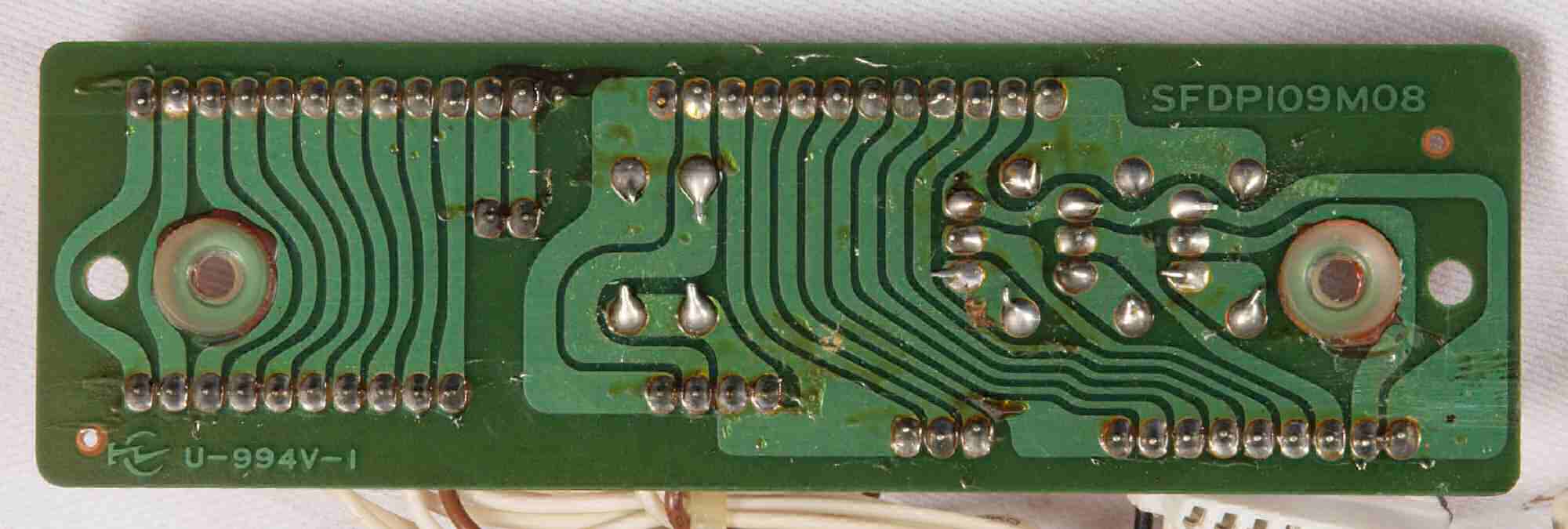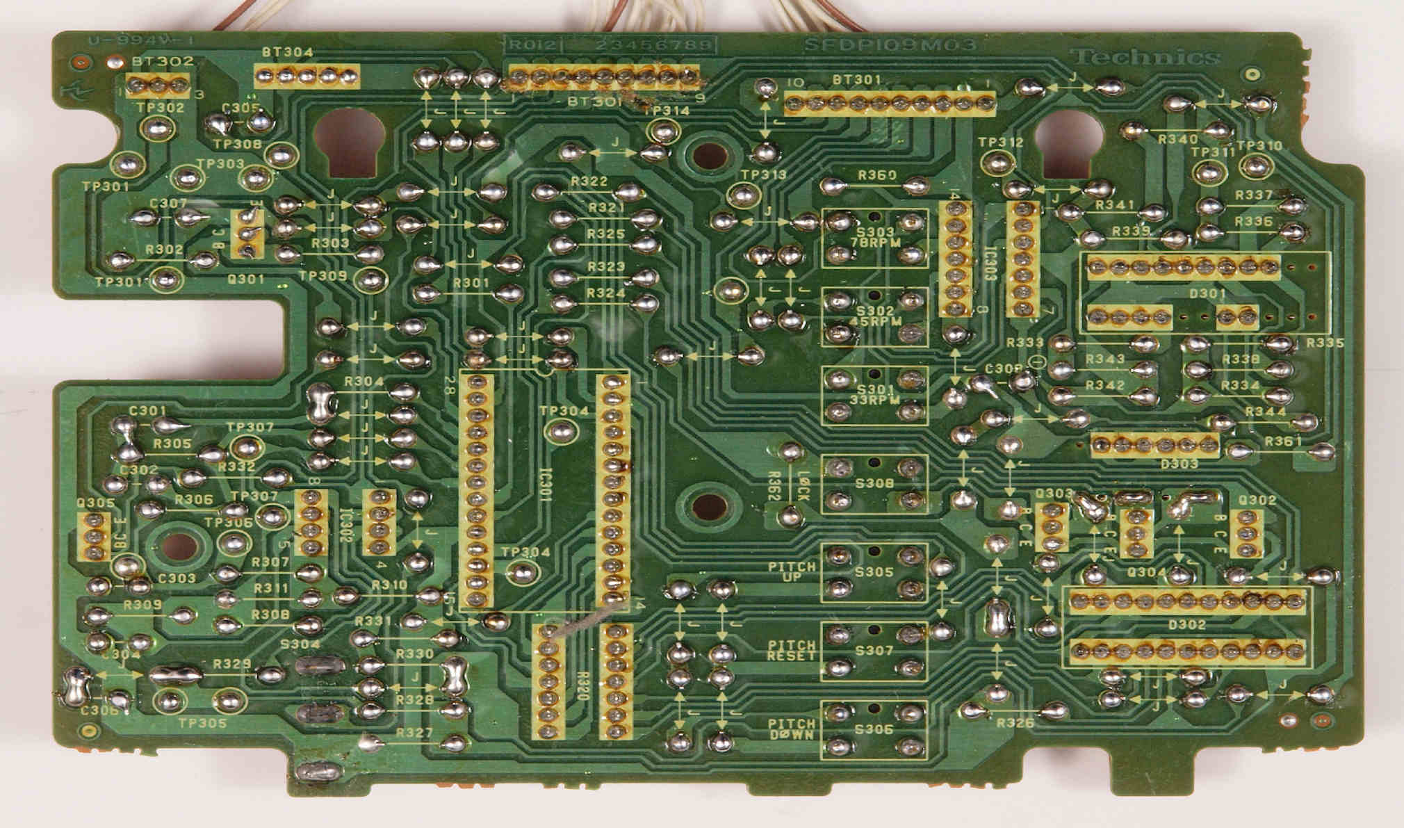 | D35. 完成ターンテーブル操作基板基板裏。 余分なフラックスを落として、コート液を塗る。 | ||||||||||||||||||||||||||||||||||||||||