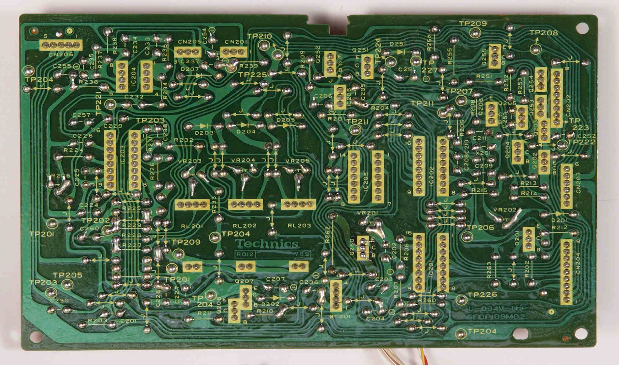 | D54. 完成ターンテーブル接続基板裏。余分なフラックスを落として、コート液を塗る。 | ||||||||||||||||||||||||||||||||||||||||