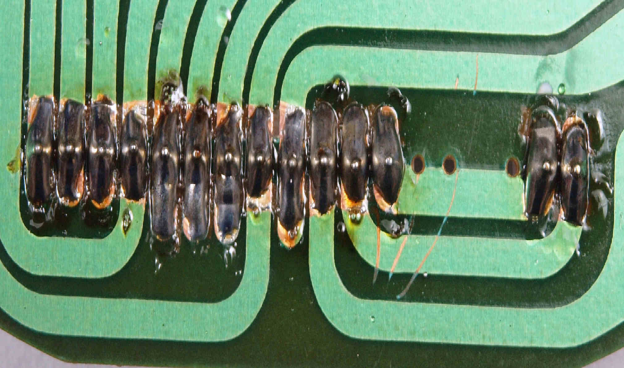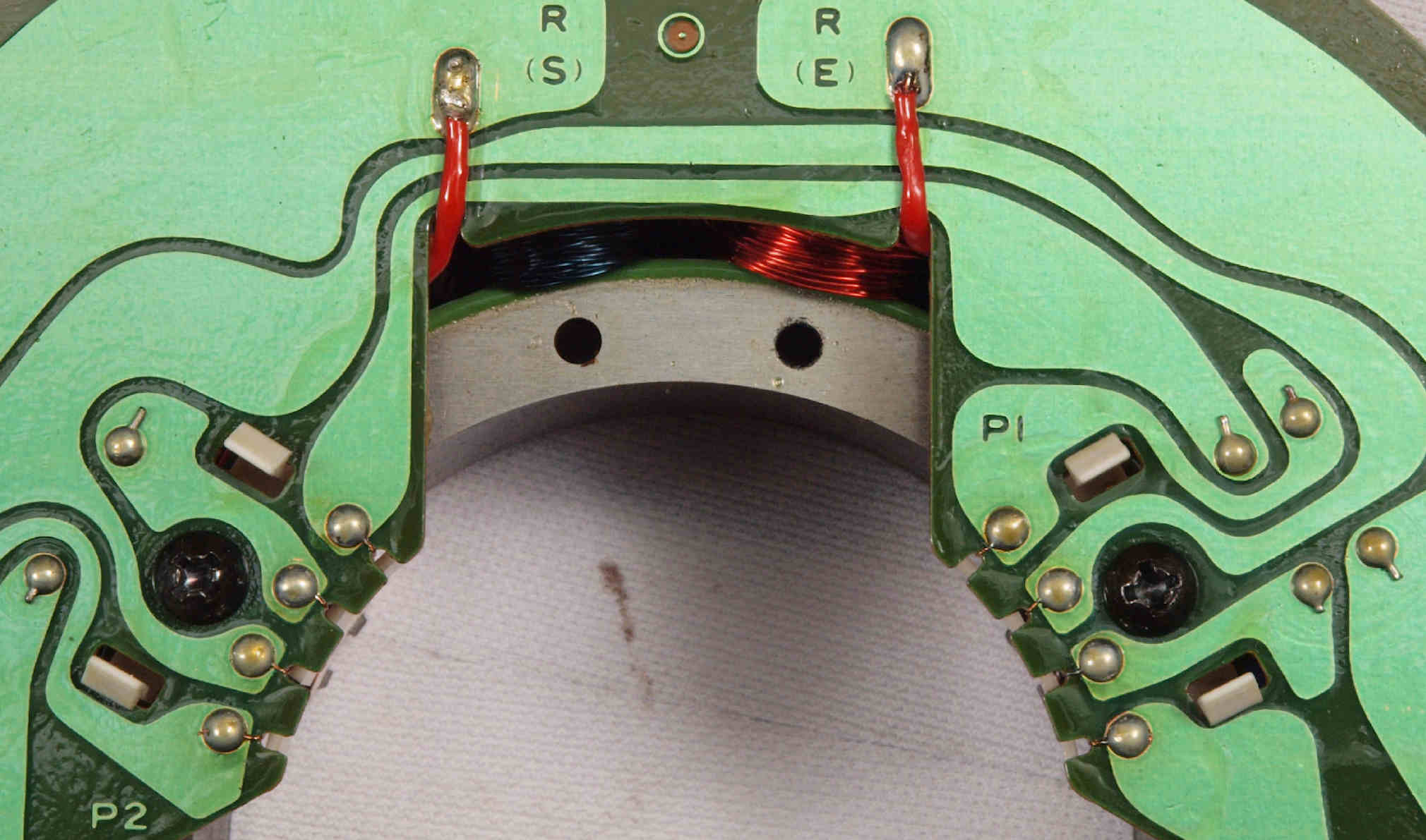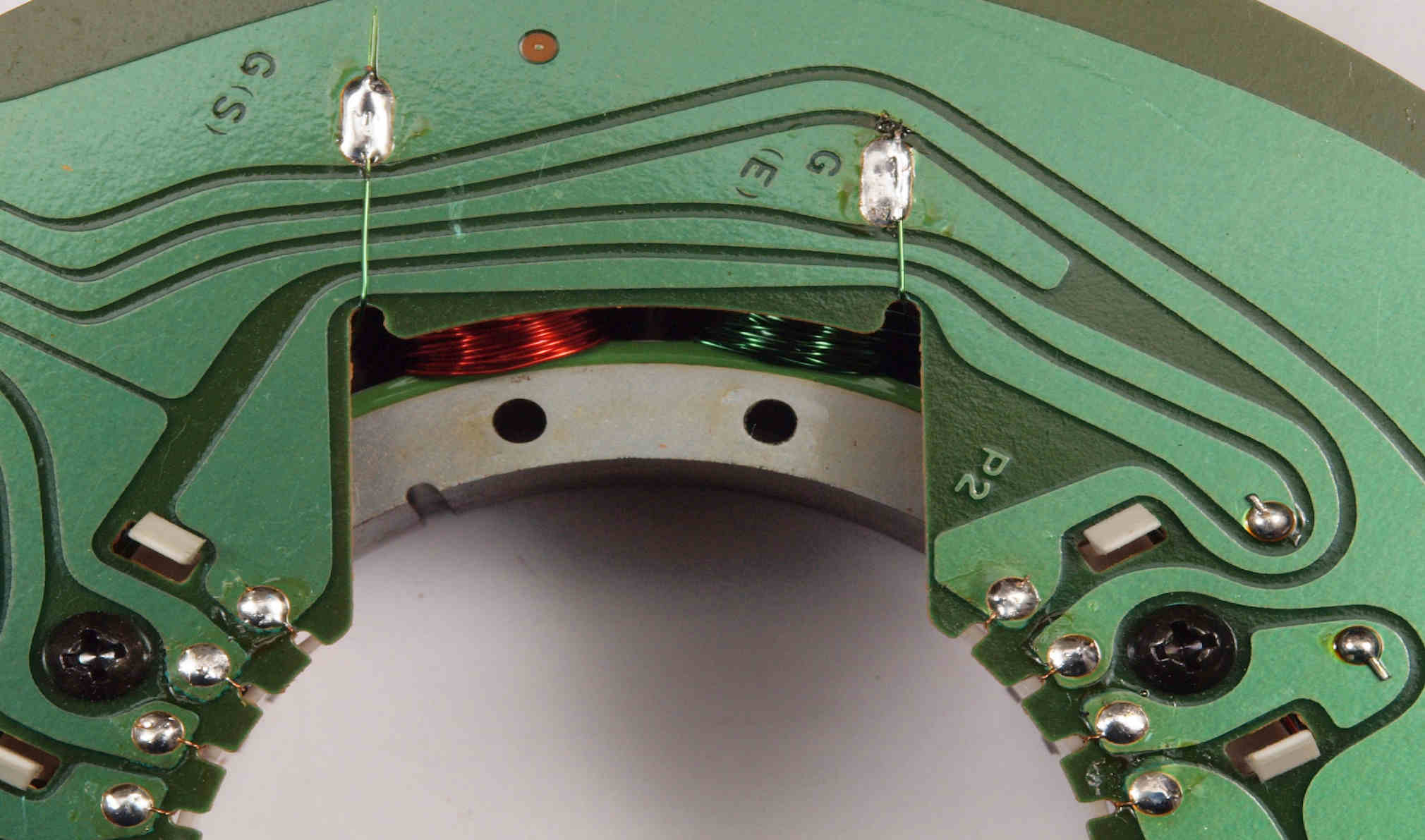 | M512. 修理中、 アマチュア(回転子)基盤裏巻線半田、引き出し線が絶縁していない!(GREEN巻線)拡大 | ||||||||||||||||||||||||||||||||||||||||