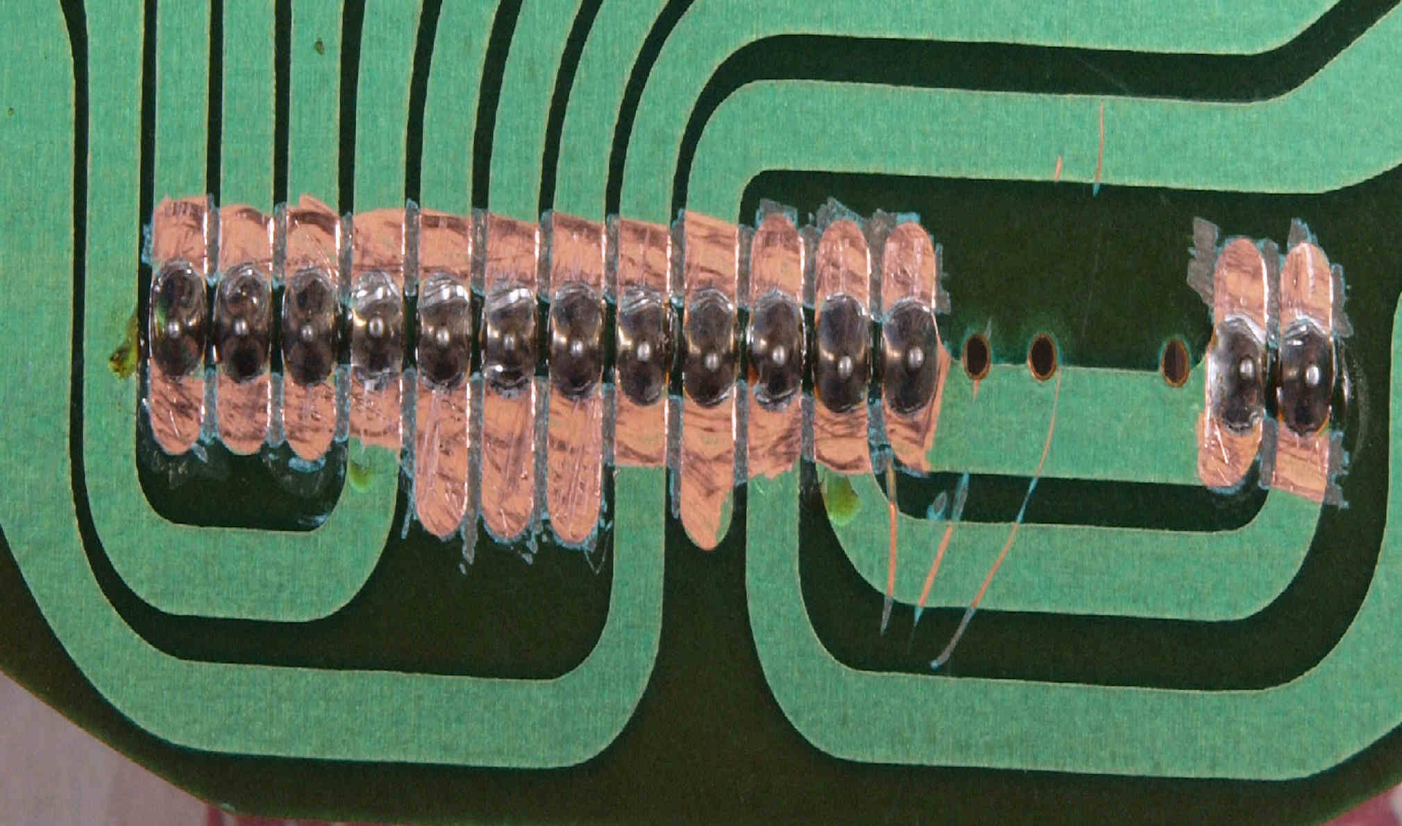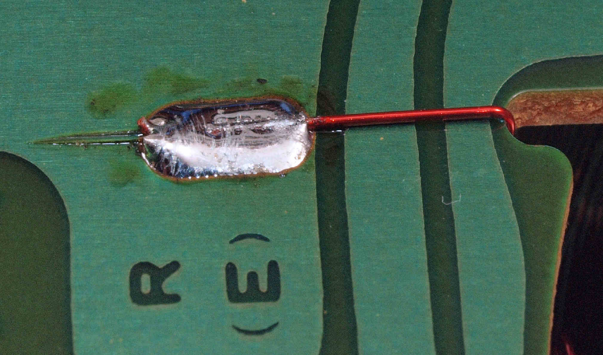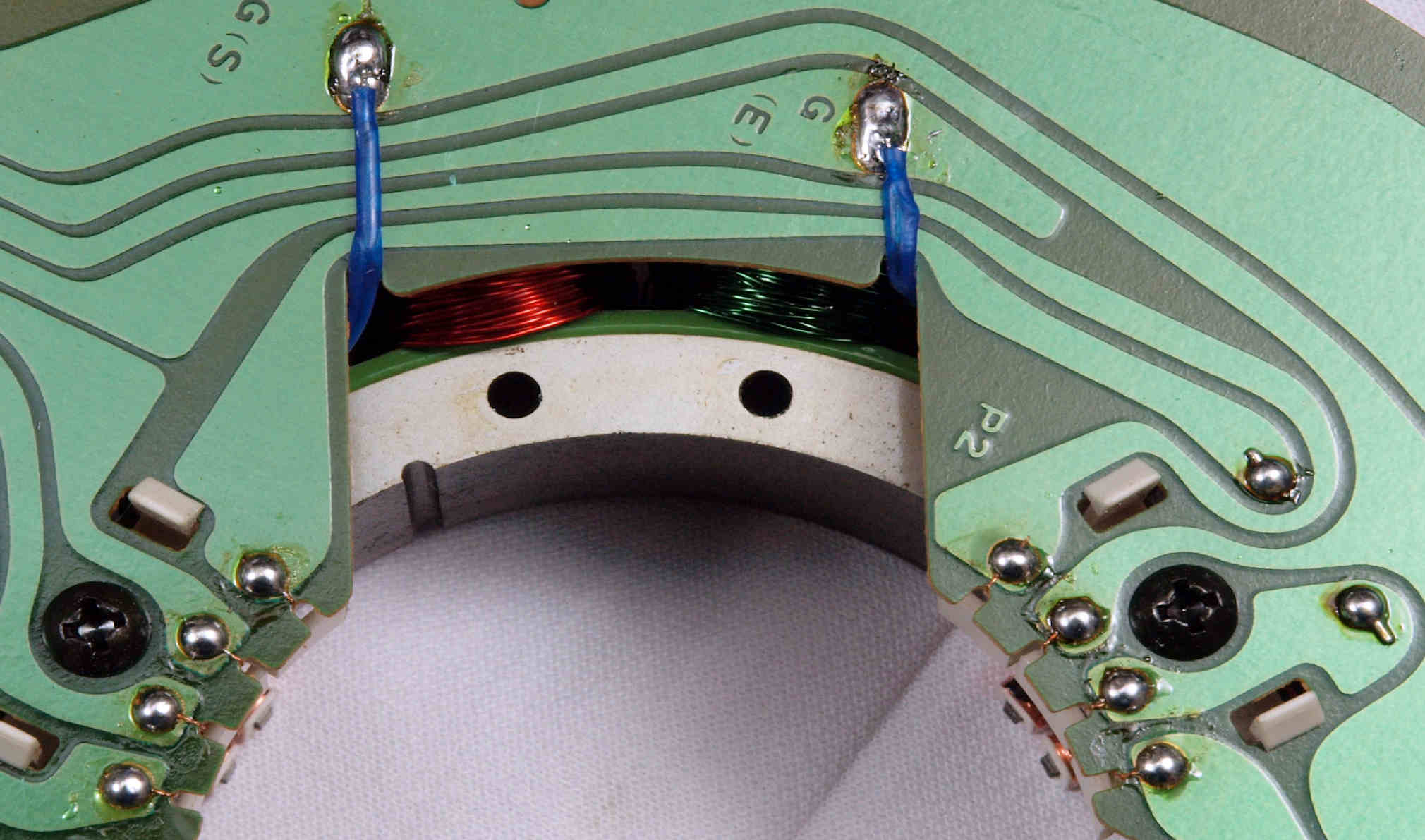 | M512. 修理中、 アマチュア(回転子)基盤裏巻線半田、引き出し線が絶縁していない!(GREEN巻線)拡大 | ||||||||||||||||||||||||||||||||||||||||