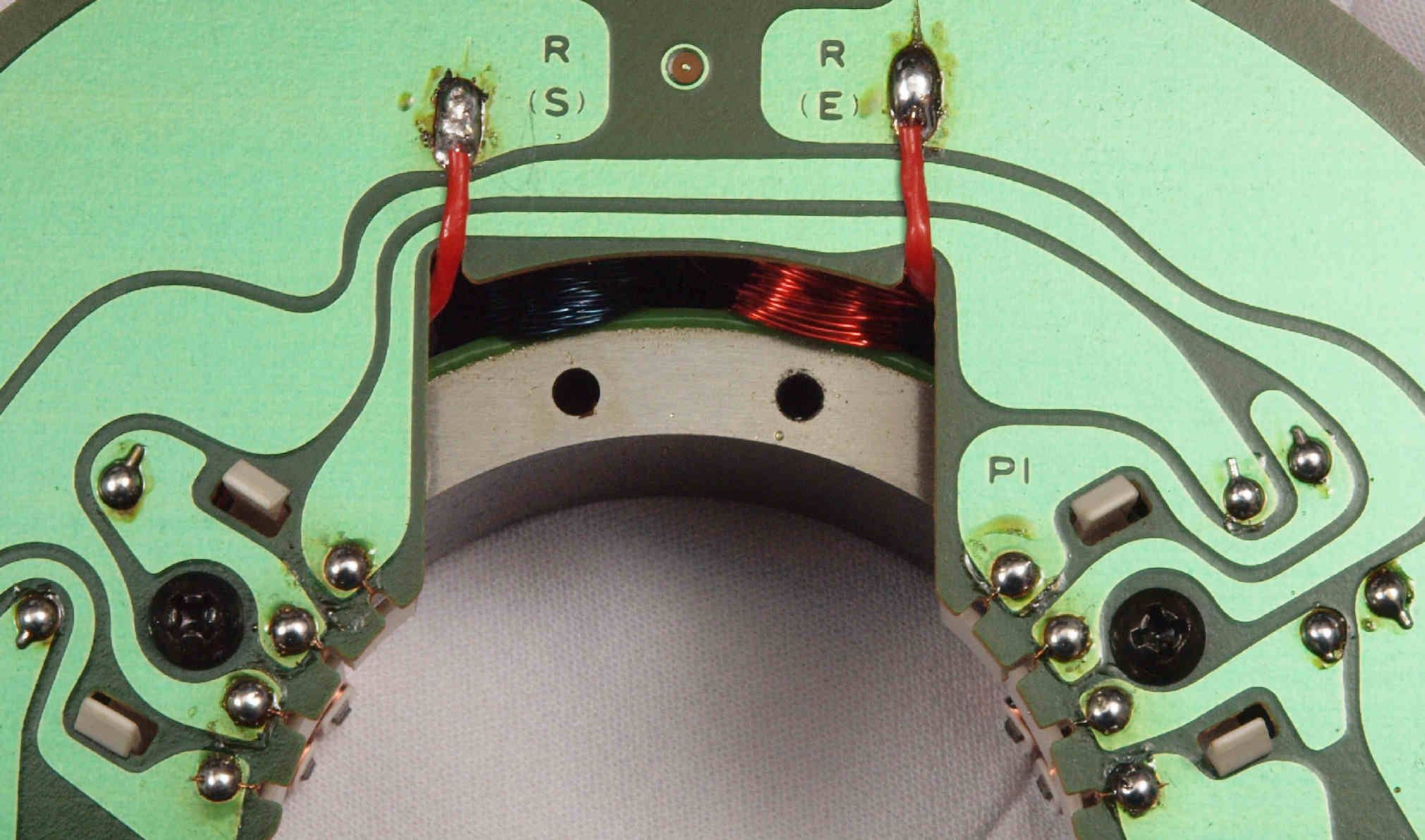 | M312. 修理中、 アマチュア(回転子)基盤裏巻線半田、引き出し線が絶縁していない!(RED巻線)拡大 | ||||||||||||||||||||||||||||||||||||||||