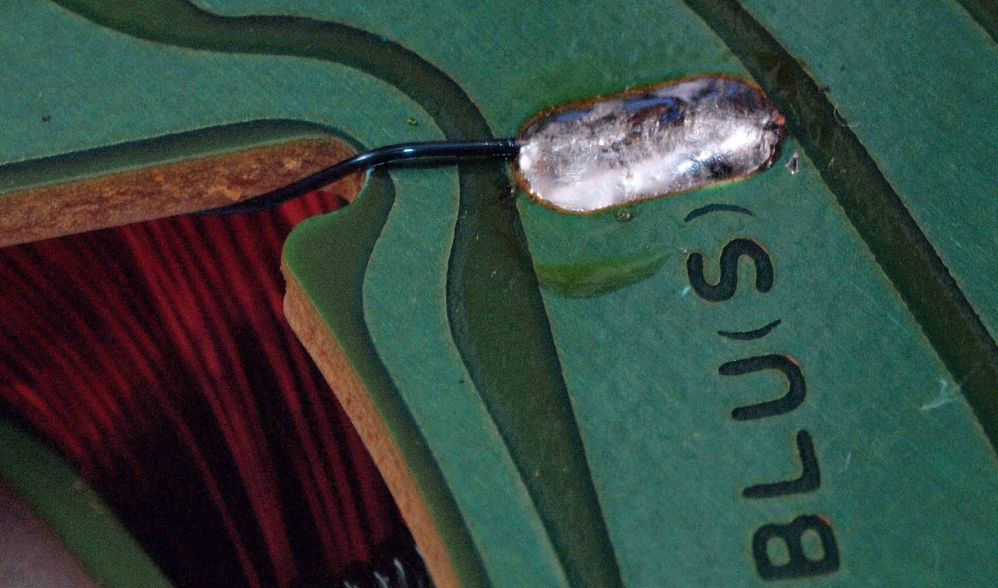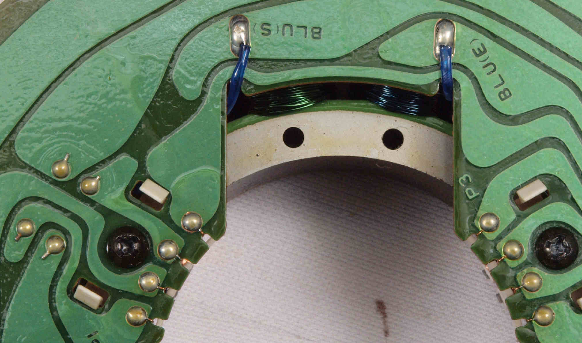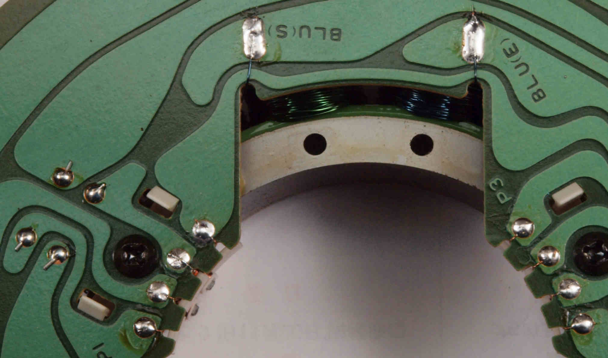 | M412. 修理中、 アマチュア(回転子)基盤裏巻線半田、引き出し線が絶縁していない!(BLUE巻線)拡大 | ||||||||||||||||||||||||||||||||||||||||