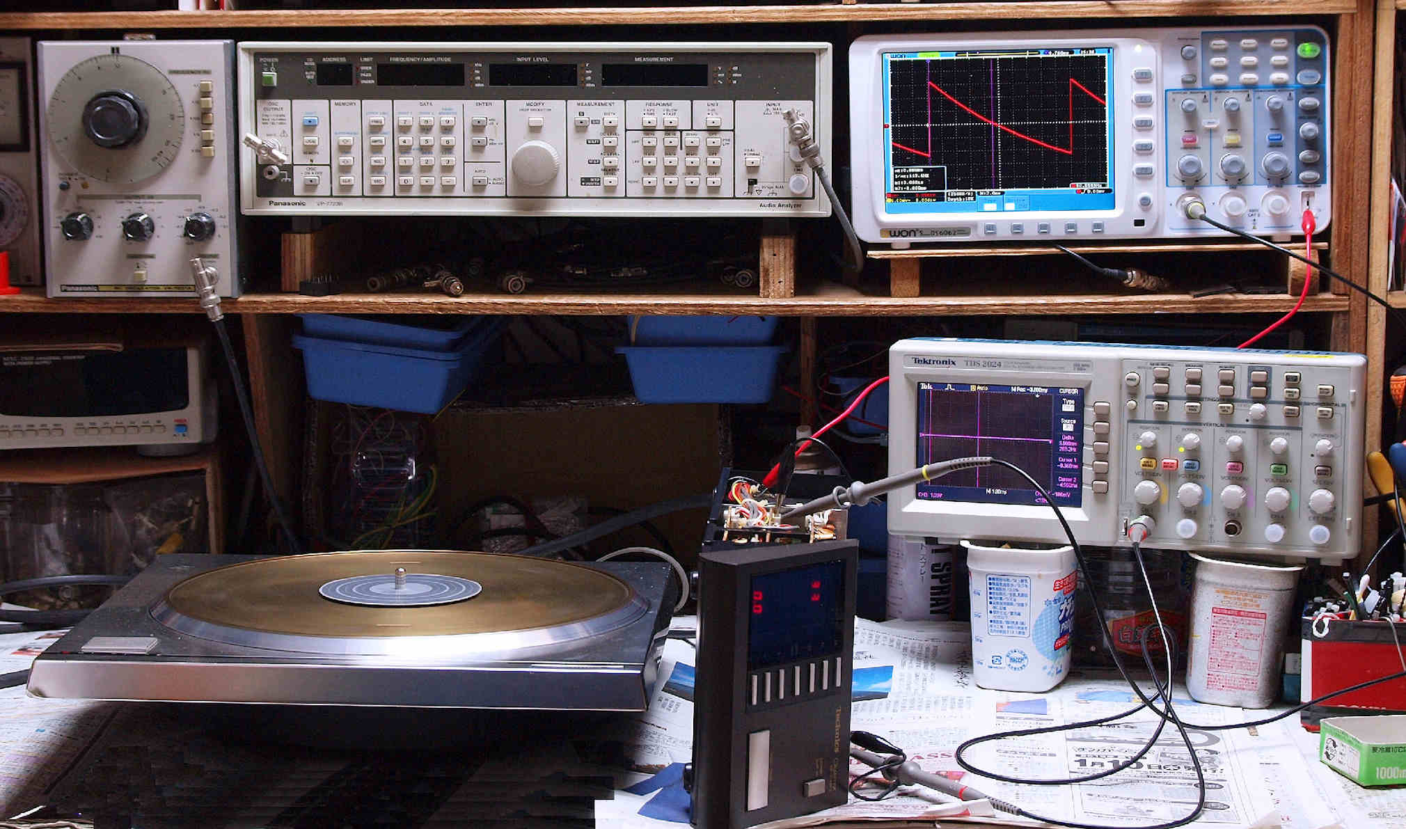 | E6. 完成し24時間連続動作エージング中 マイクロがベルトドライブ等の機械的機構で安定させたのに比べ、純粋に電気で安定させている。 | ||||||||||||||||||||||||||||||||||||||||
