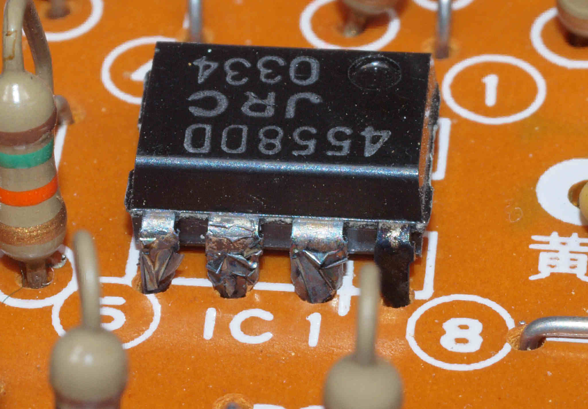 | C73. 交換部品。 足(端子)が炭化したOP-AMP、反対側。 | ||||||||||||||||||||||||||||