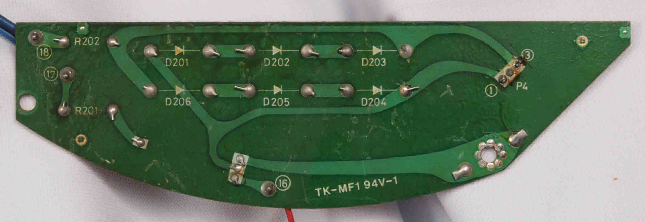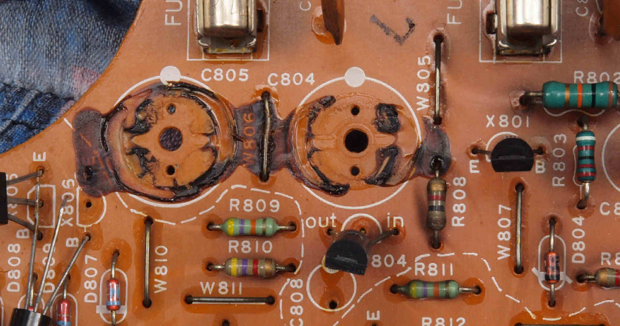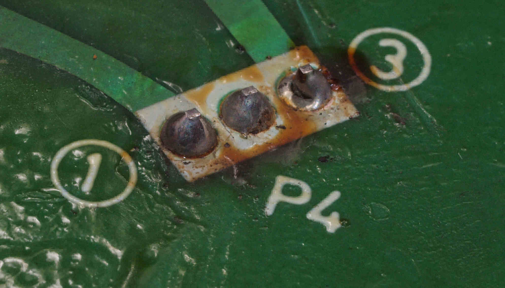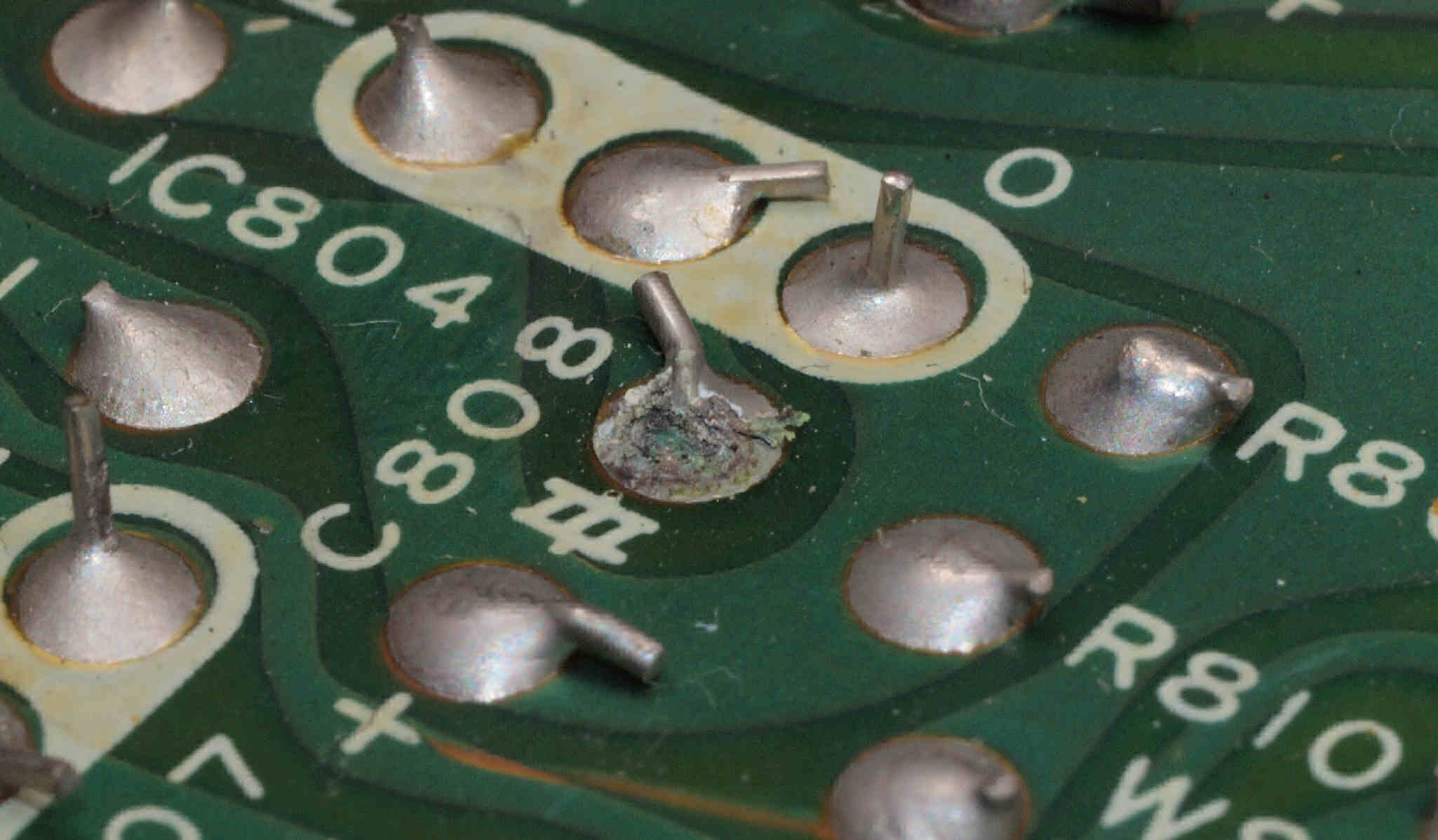 | C132. 修理中 制御基板裏。 電解コンデンサーの液漏れで腐食した銅箔。 | ||||||||||||||||||||||||||||