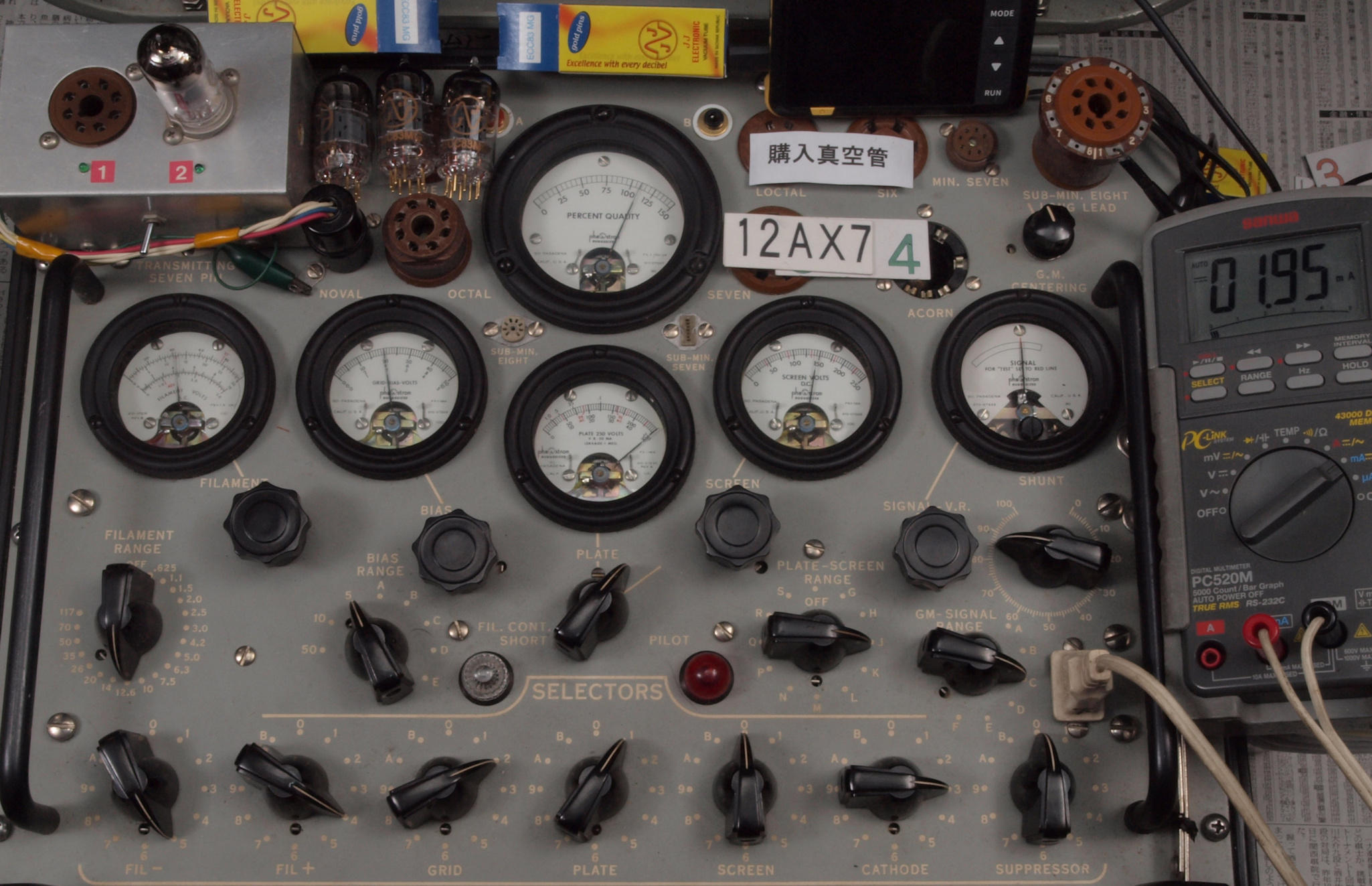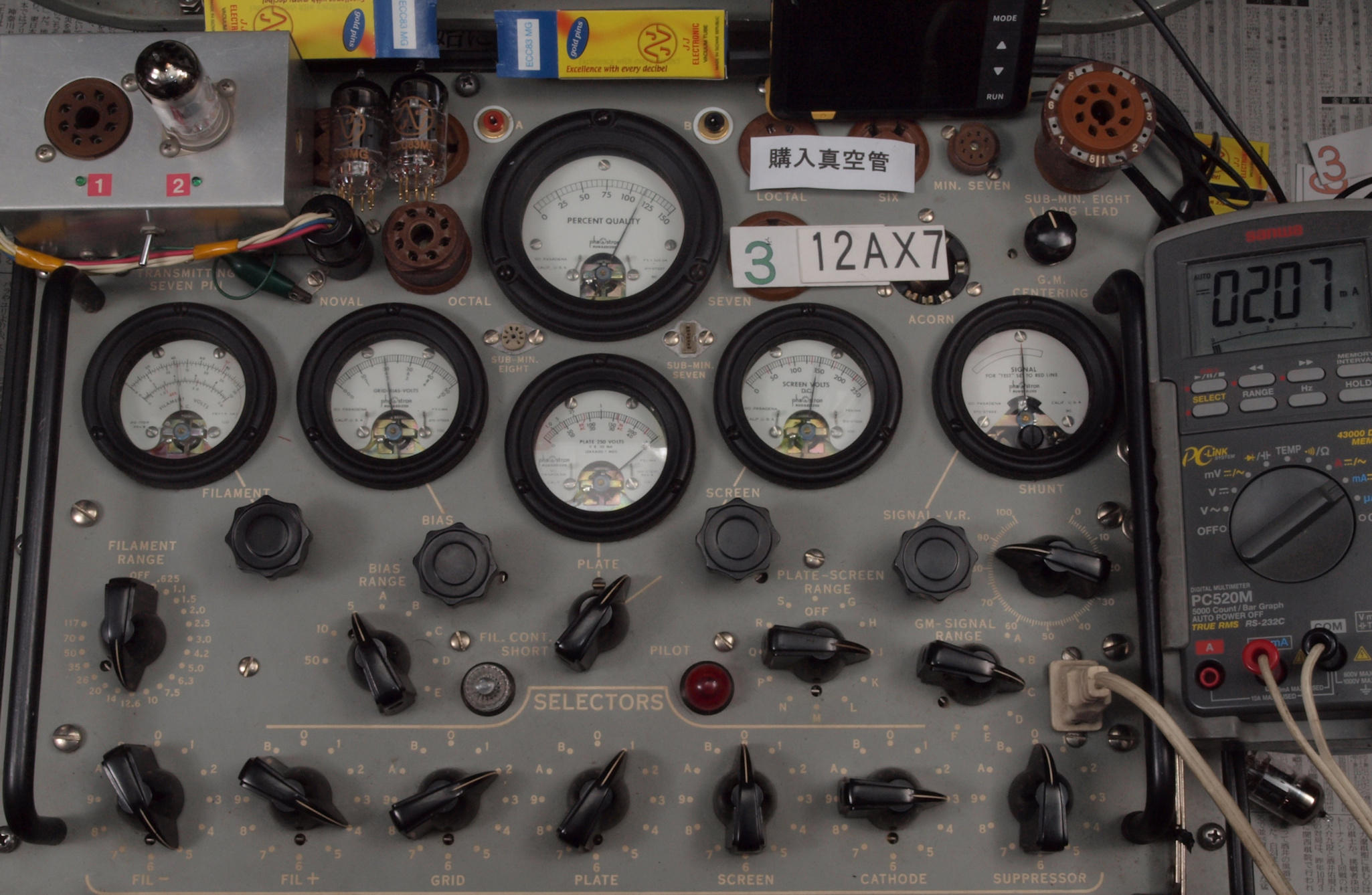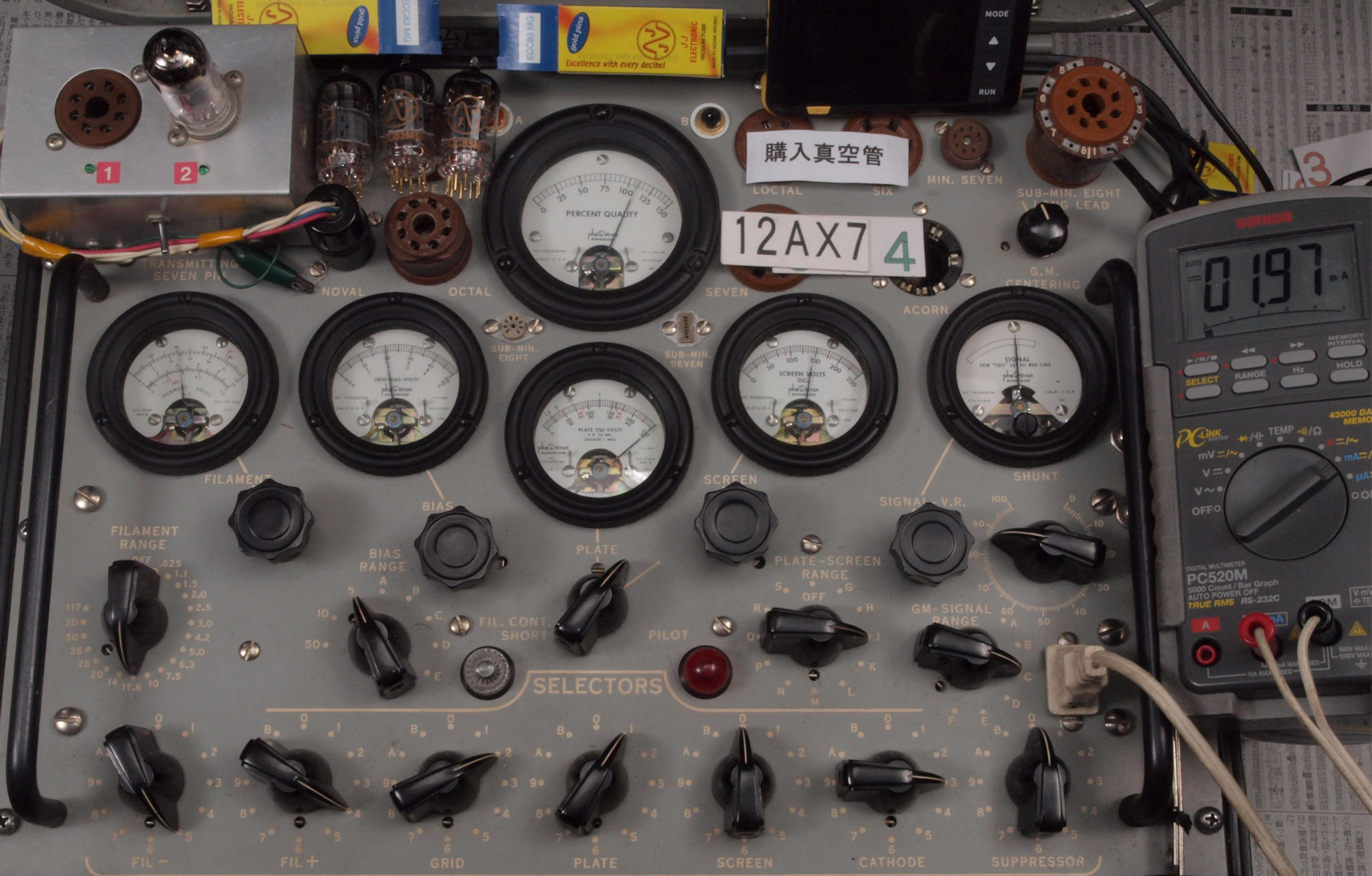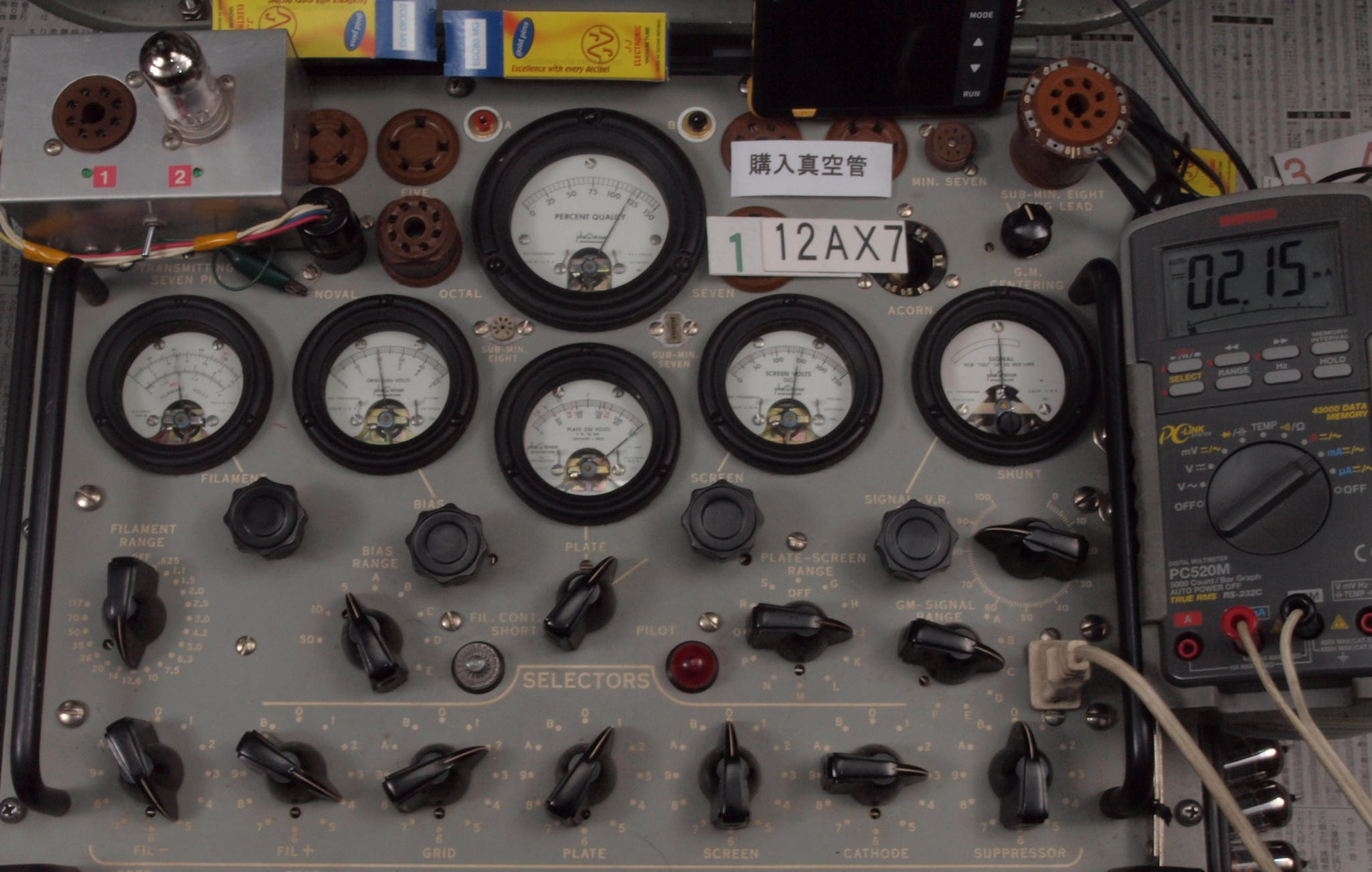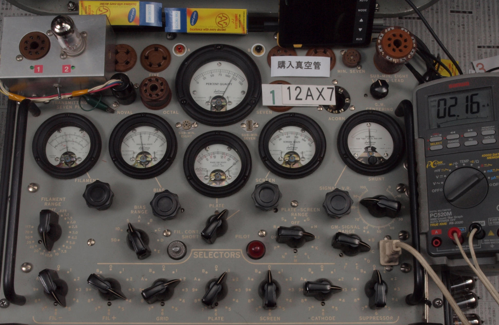 | J11. 付属1本目 12AX7 ユニット1。 Gm測定=1700μmho、IP=1.49mA。 Cレンジ=3000μmhoレンジでの測定、「Ep=250V、Eg1=−2V」 |