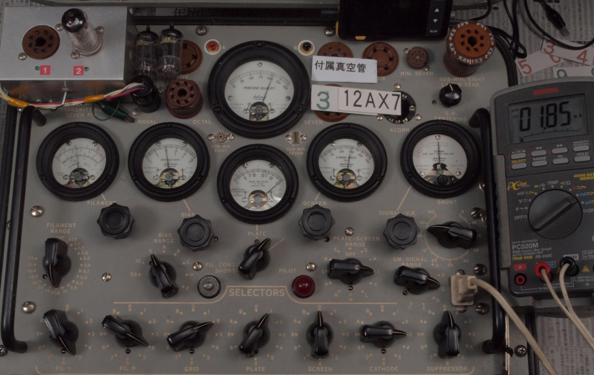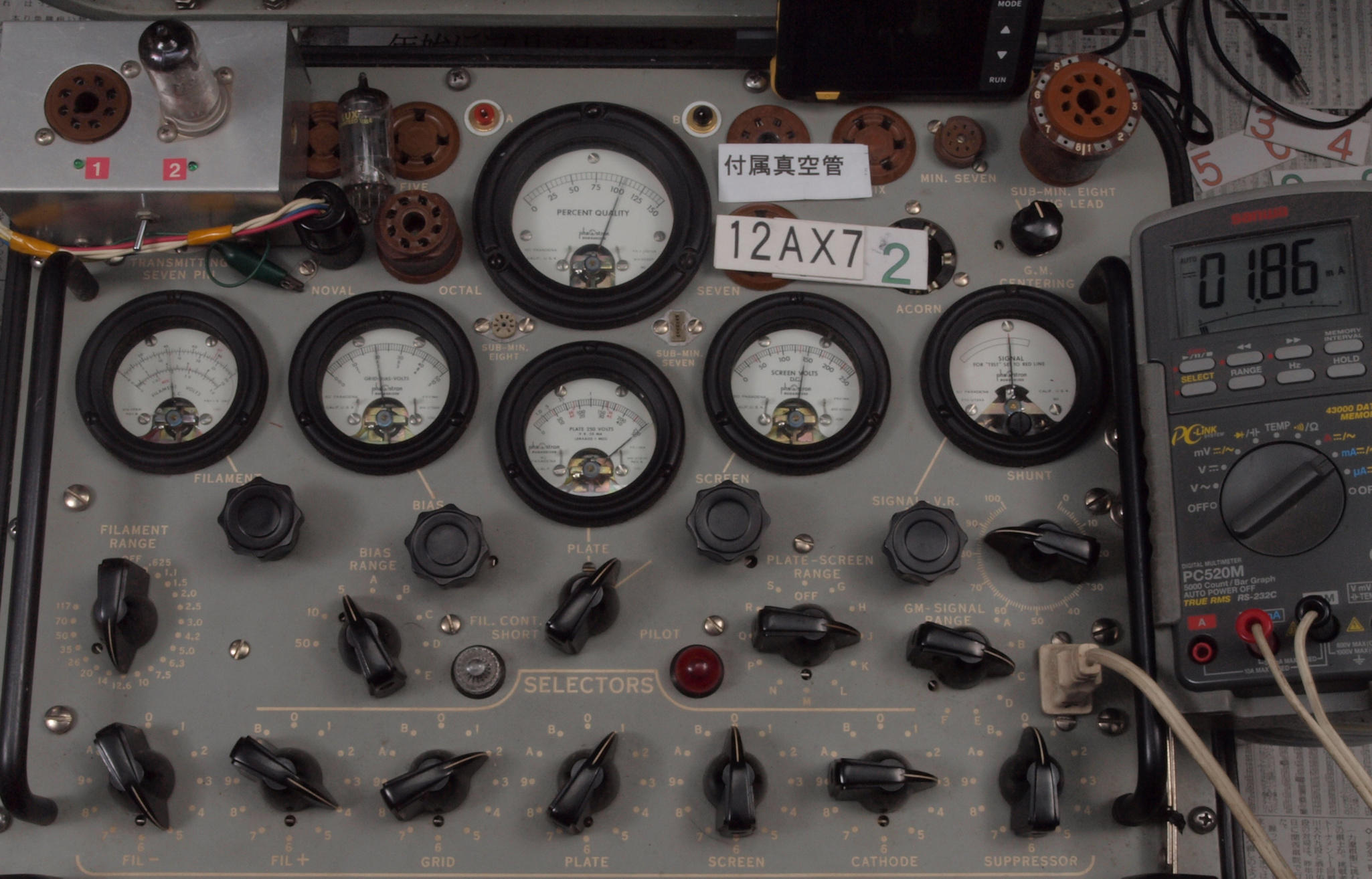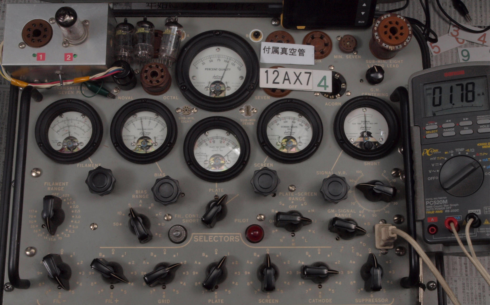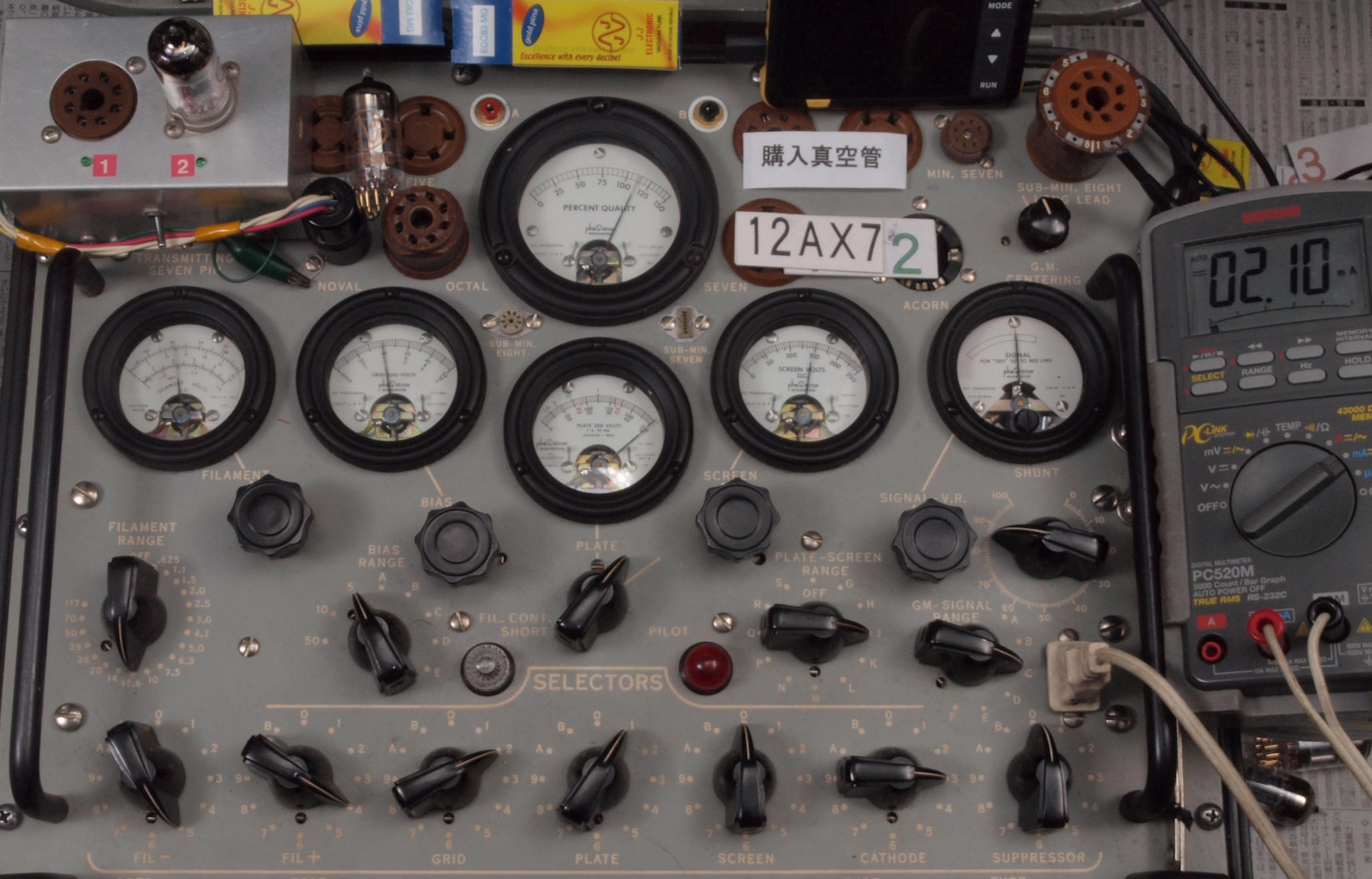 | J11. 付属1本目 12AX7 ユニット1。 Gm測定=1700μmho、IP=1.49mA。 Cレンジ=3000μmhoレンジでの測定、「Ep=250V、Eg1=−2V」 |