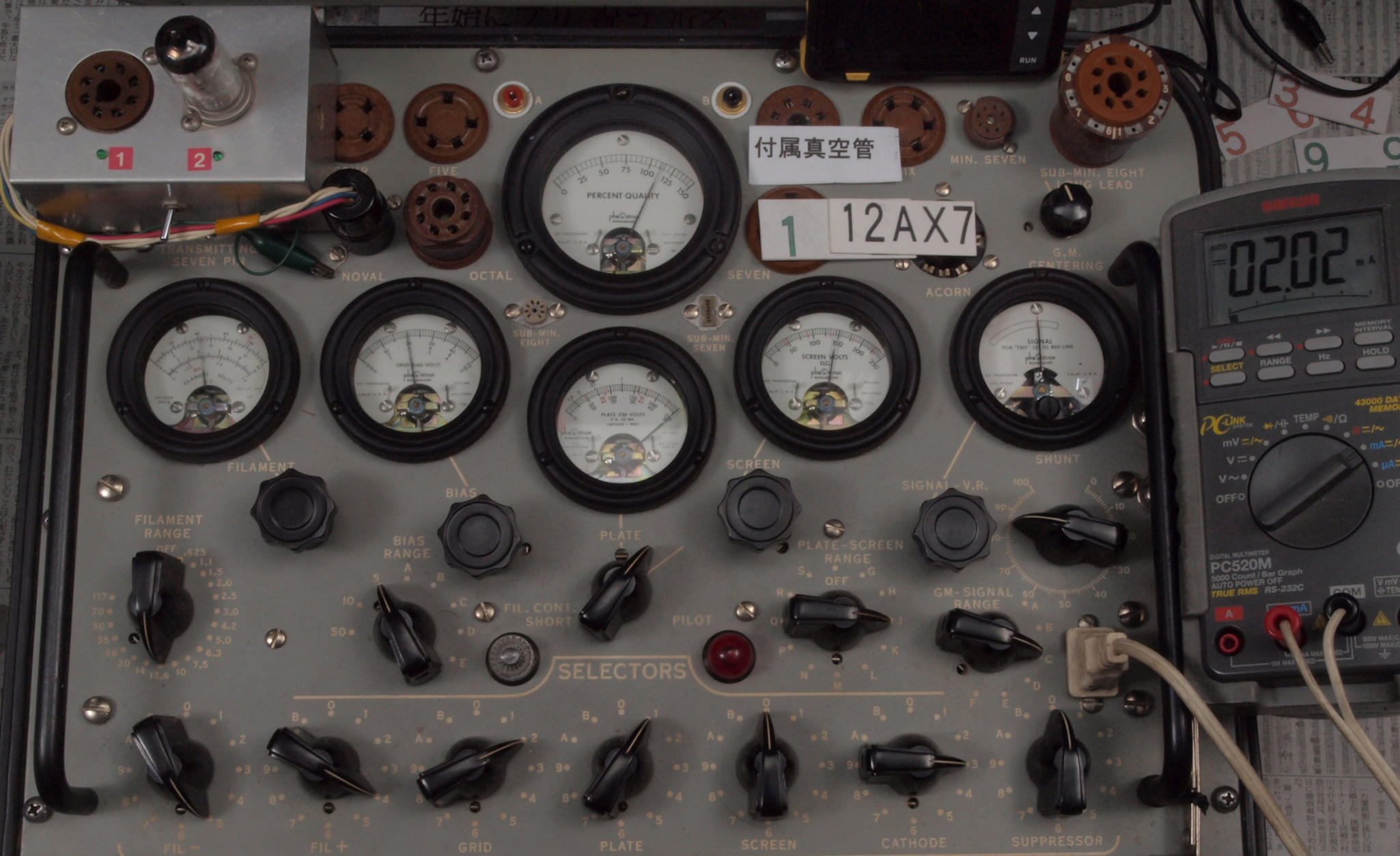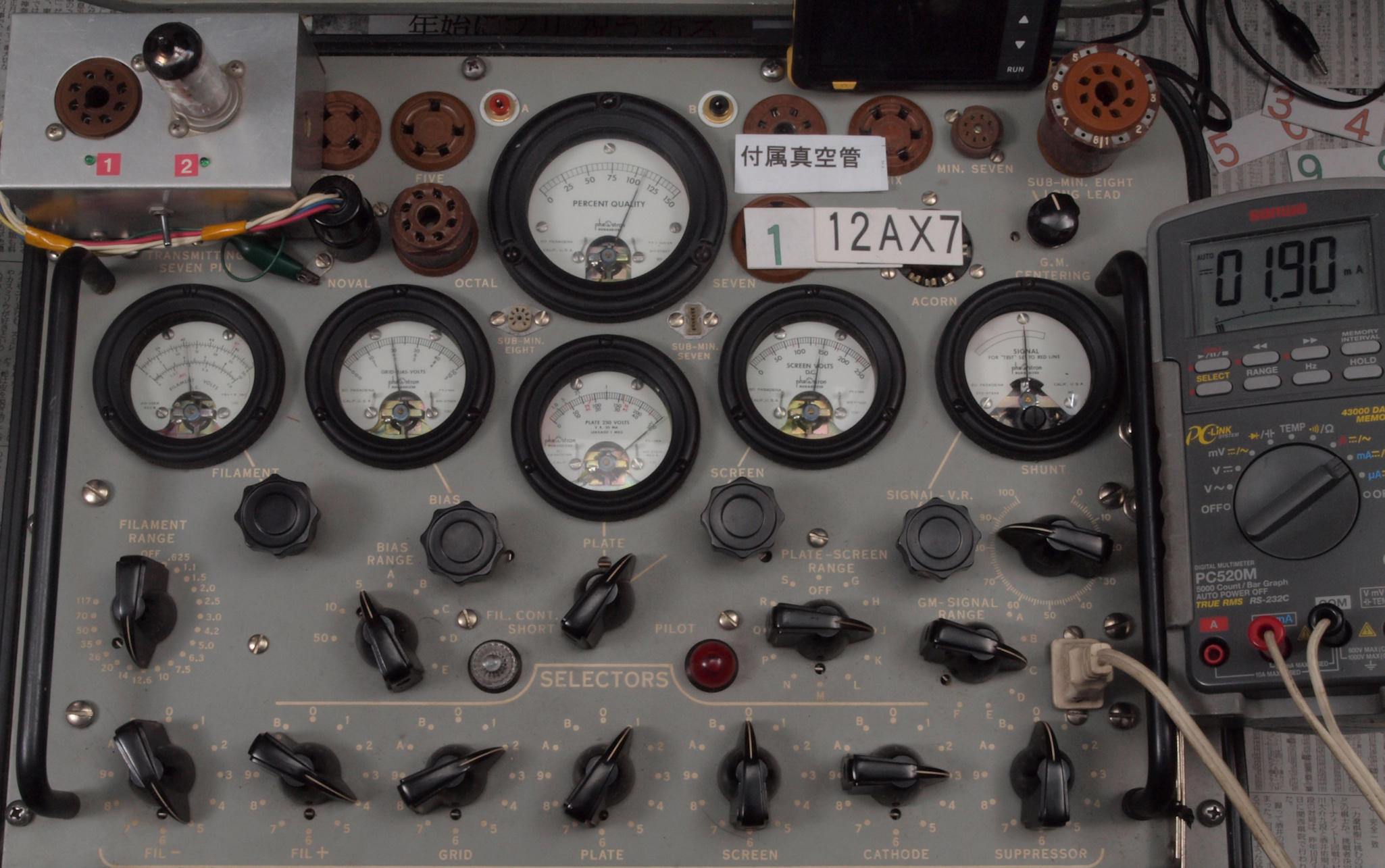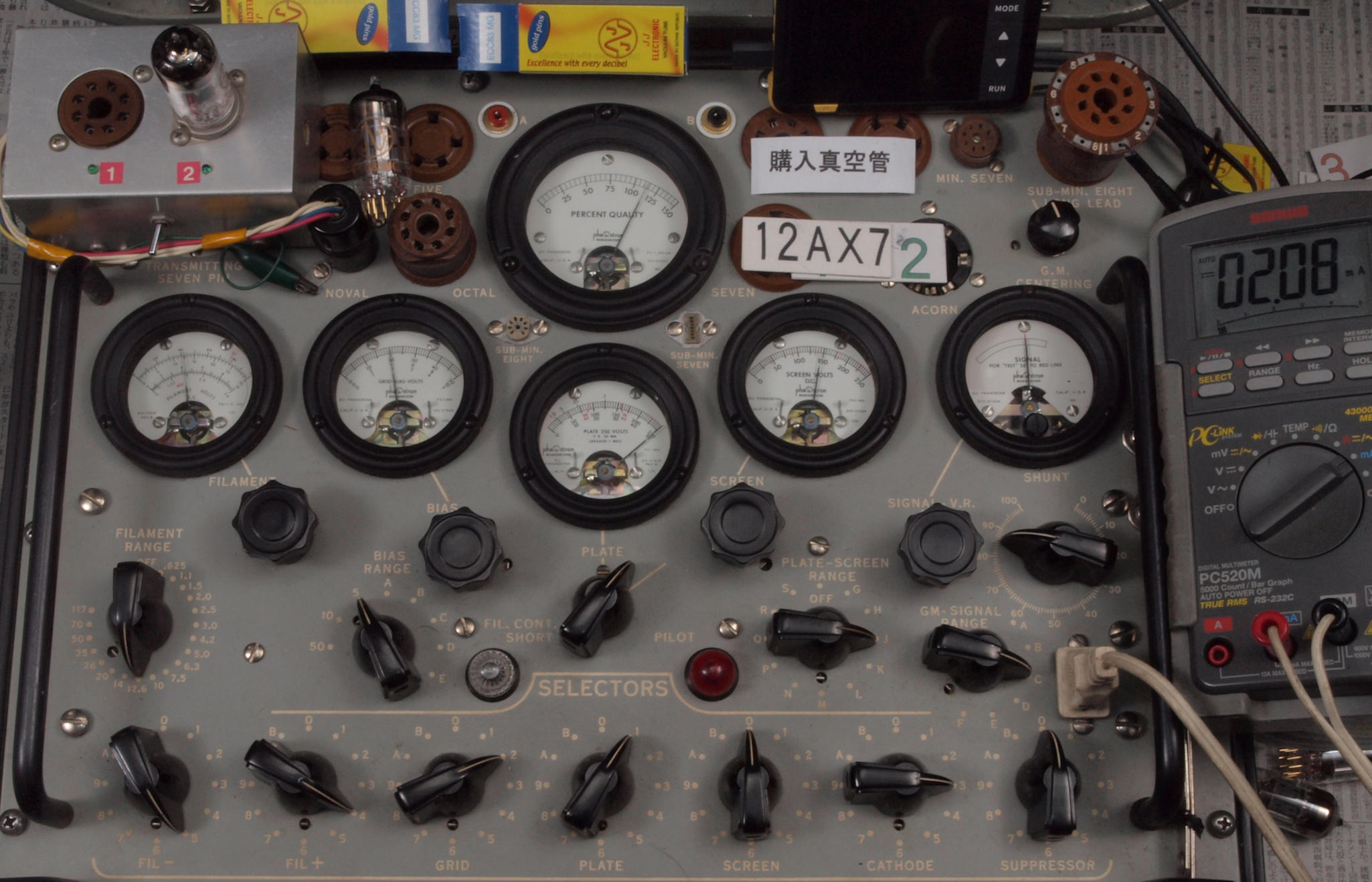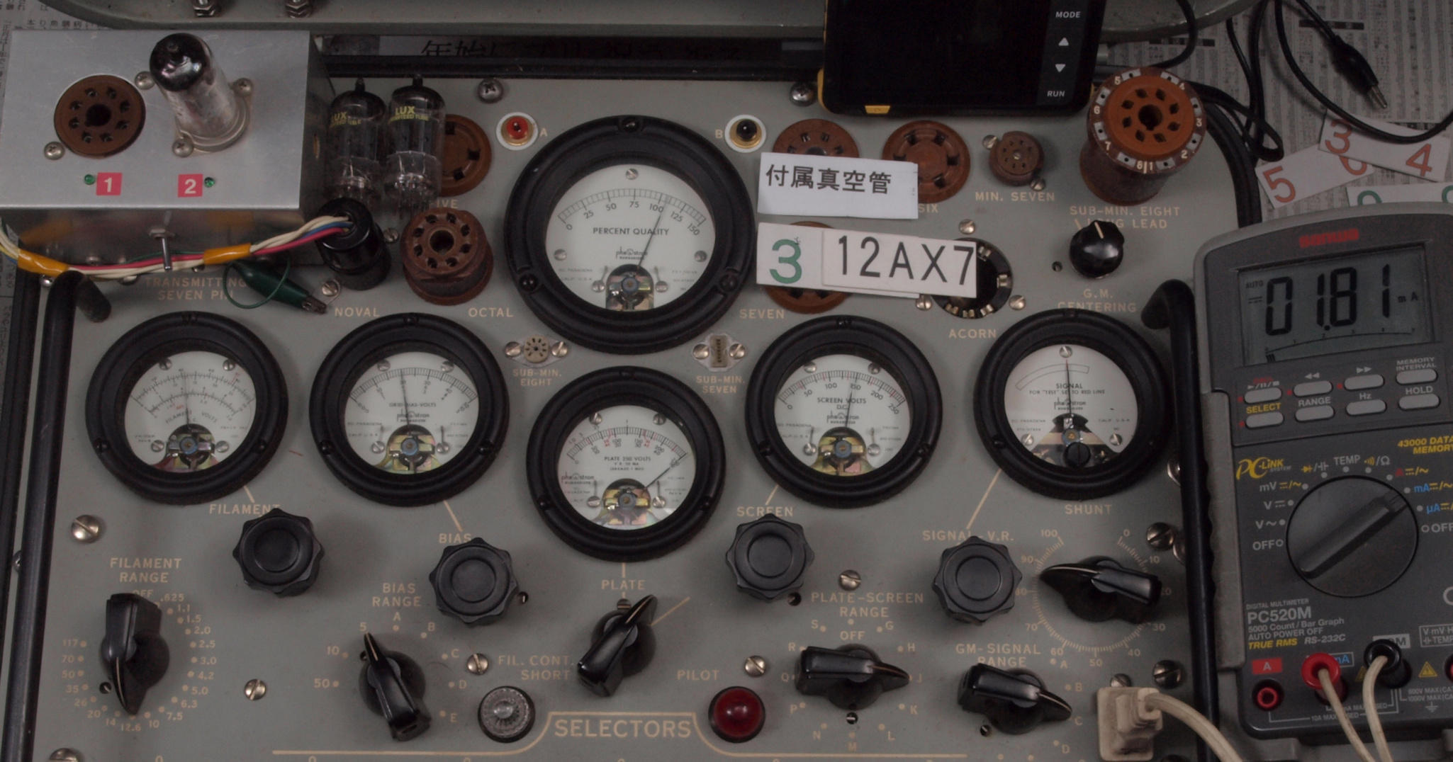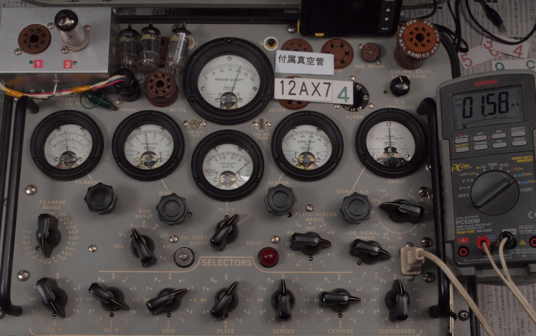 | J11. 付属1本目 12AX7 ユニット1。 Gm測定=1700μmho、IP=1.49mA。 Cレンジ=3000μmhoレンジでの測定、「Ep=250V、Eg1=−2V」 |