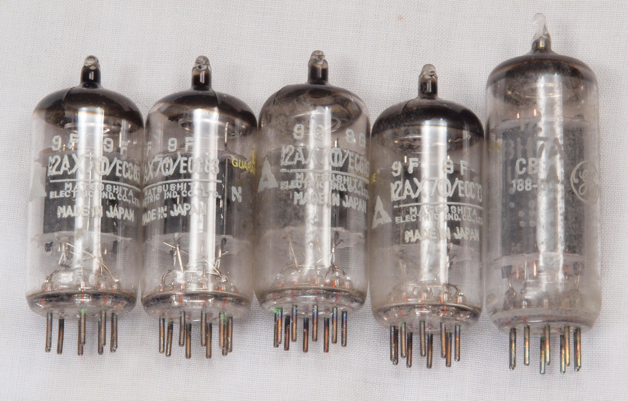 付属真空管「12AX7(ECC83)」。 左から1本目.2本目...5本目.6本目、12AU7。