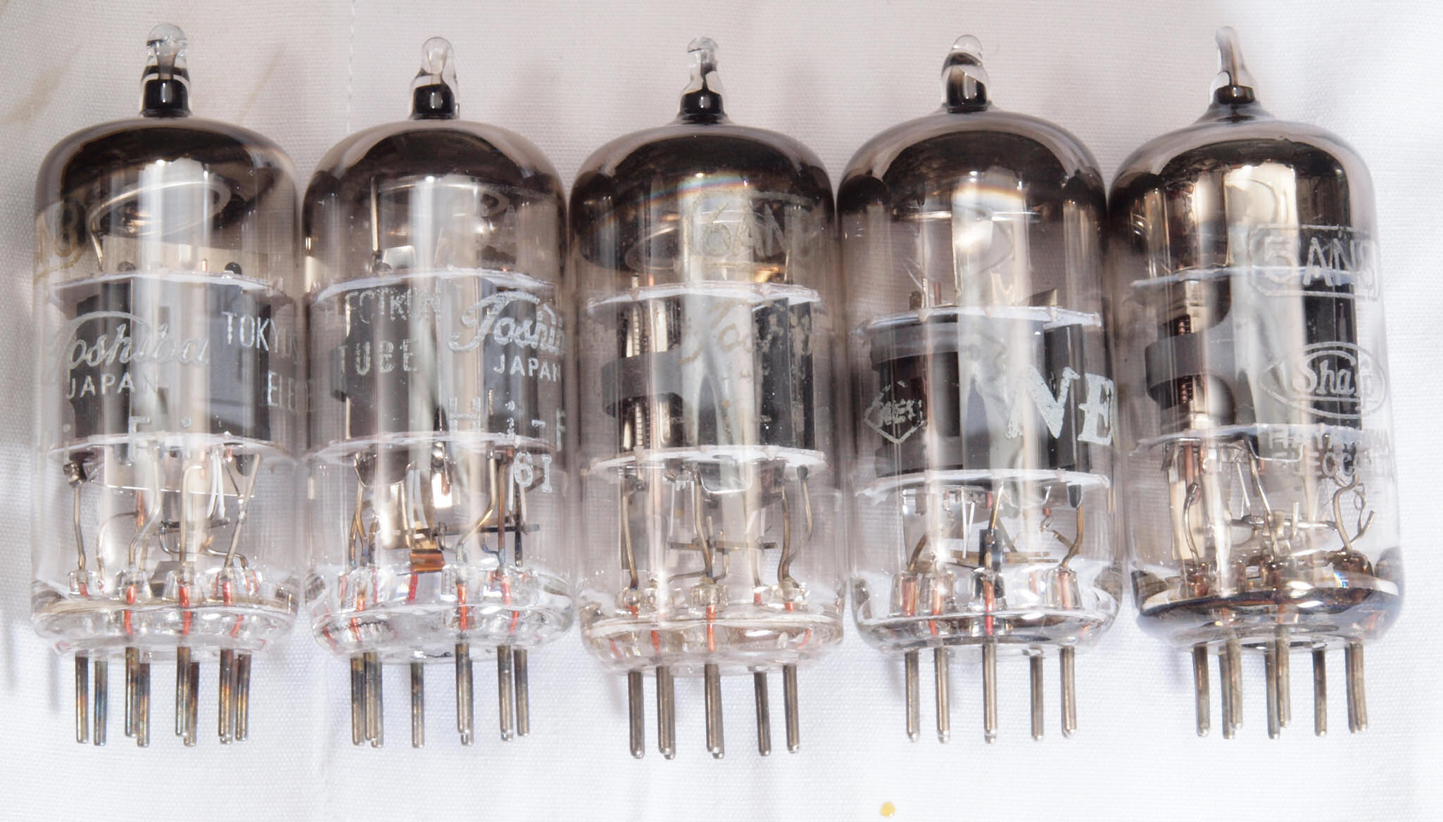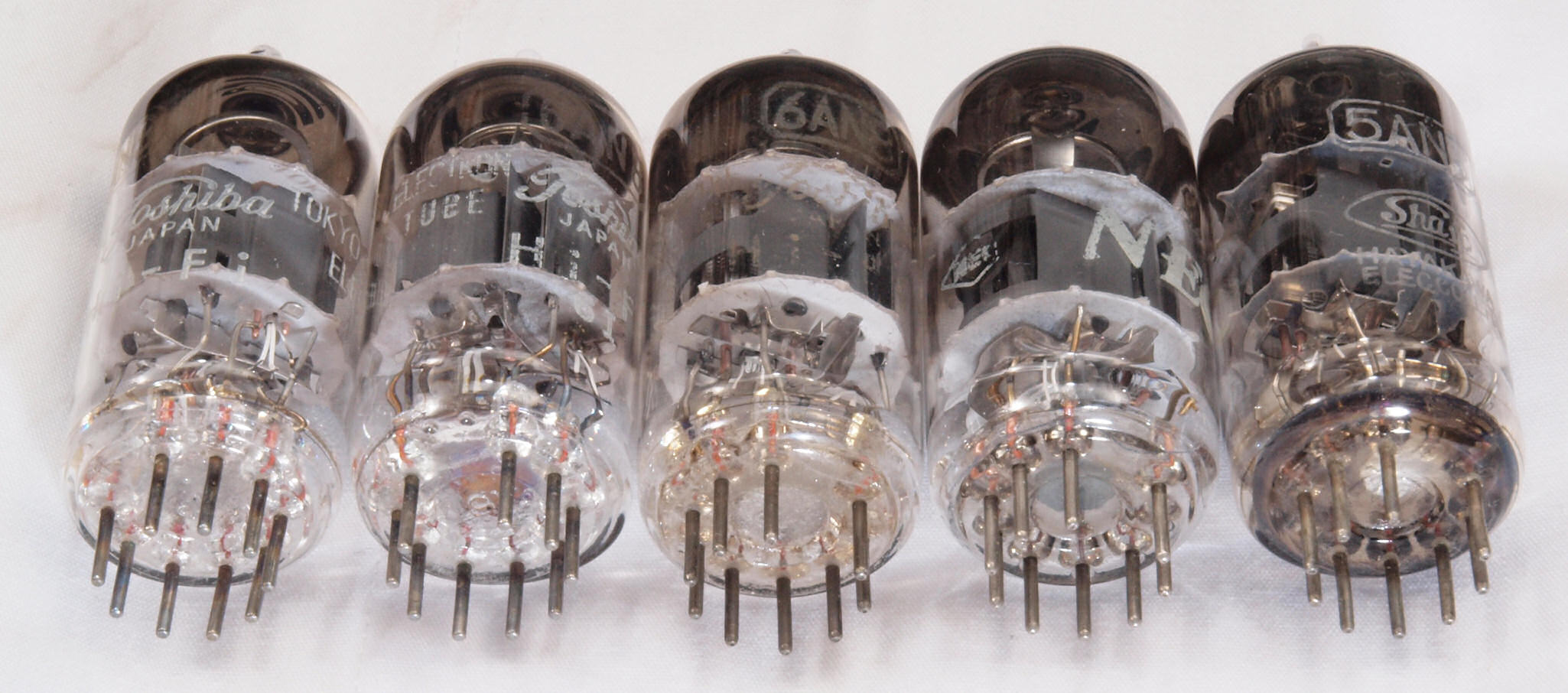 | D2. YAHOOオークションで購入6AN8 Gm、IP測定。 真空管ハンドブック(規格表)の、 6AN8 三極部 相互コンダクタンス=4500μmho 6AN8 五極部 相互コンダクタンス=7800μmho 1960/1962/1964/1966ナショナル真空管ハンドブック、1995オーディオ用真空管マニアル、60/62/69東芝電子管ハンドブック、1962日立電子管ハンドブック、1965/1971全日本真空管マニュアル、RC15/19/26/27/28/29/30 Receiving Tube Manual、1966/実用真空管ハンドブック、1995世界の真空管カタログより。 D02. 左から東芝6AN8 1本目、東芝6AN8 2本目、東芝6AN8 3本目、NEC 6AN8、東芝5AN8。