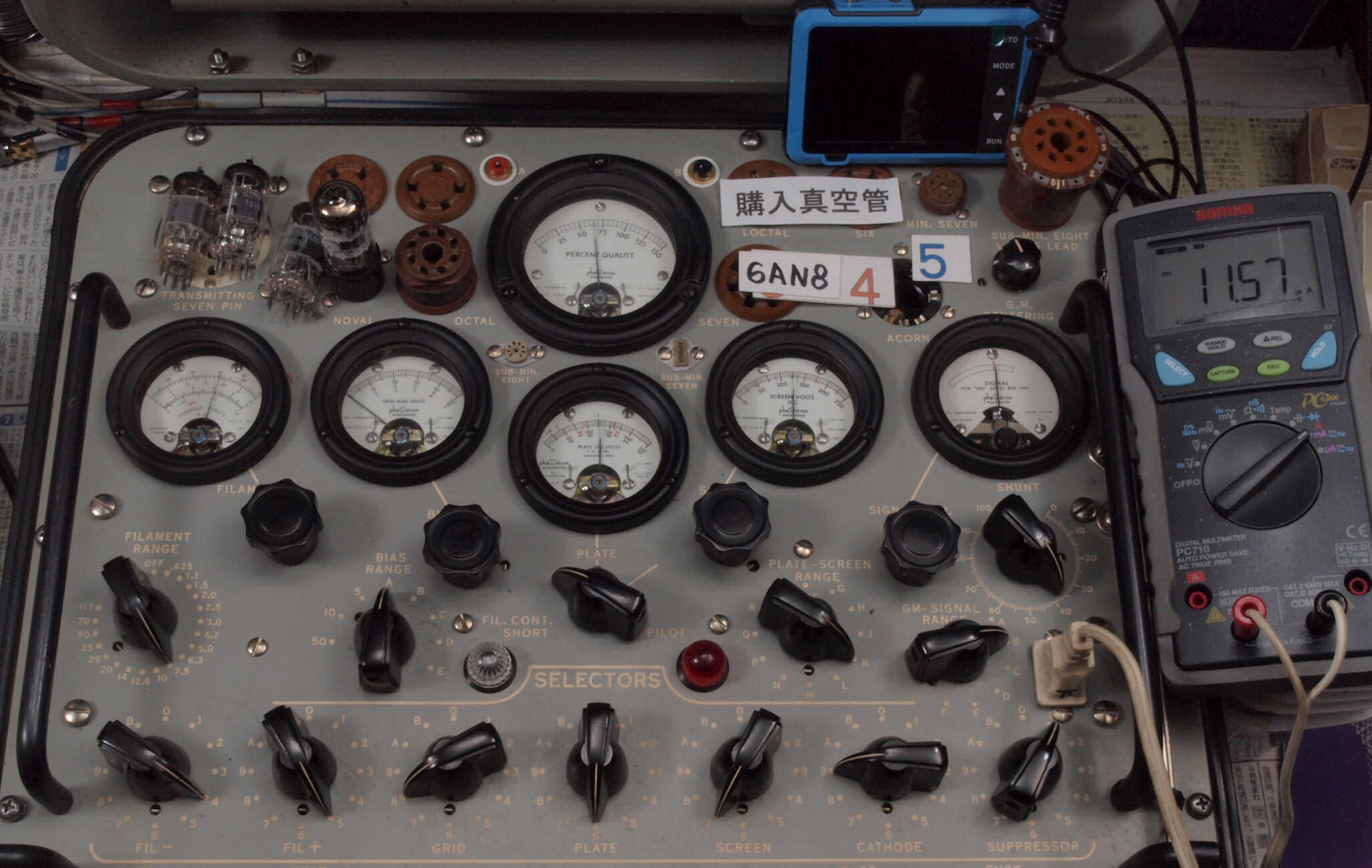 | A11. 付属真空管 6AN8 三極部。 Gm測定=5500μmho、Ip=20.4mA。 測定条件、「Ep=Esg=125V、Eg1=−2V、Ip=15mA」、Cレンジ=7500μmhoレンジでの測定。 |