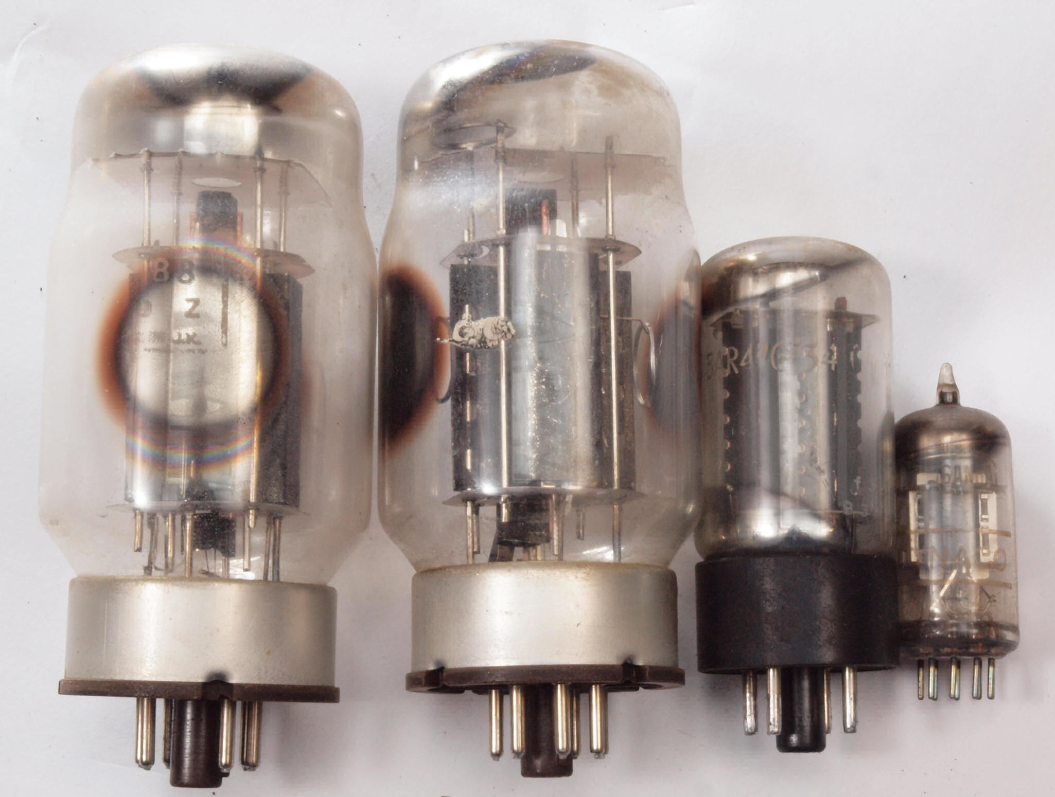 | D. TubeTester HickokTV−2B/UによるDynaco Mark V. 6台目付属真空管測定。 画像をクリックすると、大きく(横幅2050ドット)表示されます。 D0. 付属真空管、左から KT−88 1、2。 5AR4。 6AN8。 真空管ハンドブック(規格表)の、 KT−88 相互コンダクタンス=11500μmho 6AN8 三極部 相互コンダクタンス=4500μmho 6AN8 五極部 相互コンダクタンス=7800μmho 1960/1962/1964/1966ナショナル真空管ハンドブック、1995オーディオ用真空管マニアル、60/62/69東芝電子管ハンドブック、1962日立電子管ハンドブック、1965/1971全日本真空管マニュアル、RC15/19/26/27/28/29/30 Receiving Tube Manual、1966/実用真空管ハンドブック、1995世界の真空管カタログより。 |