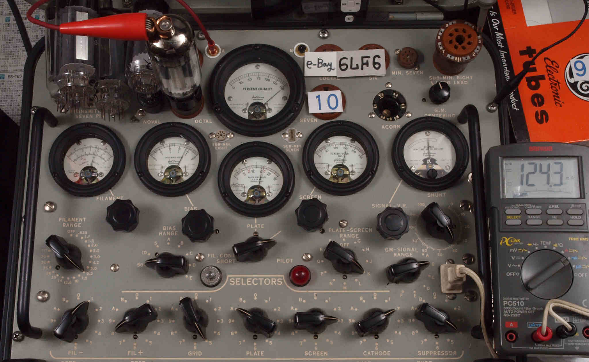 | V410. 10本目「6LF6」。 Gm測定=15000μmho、 Ip=124.3mA。 |