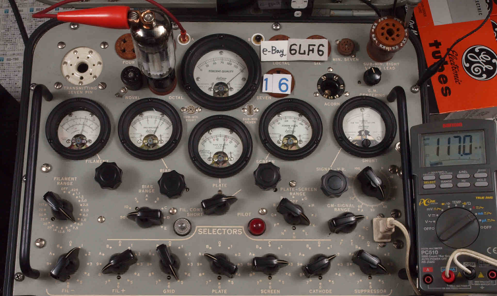 | V117. 17本目 6LF6 。 Gm測定=8000μmho、 Ip=90.1mA。 測定条件、「Ep=Esg=160V、Eg1=−35V」、Bレンジ=15000μmhoでの測定。 |