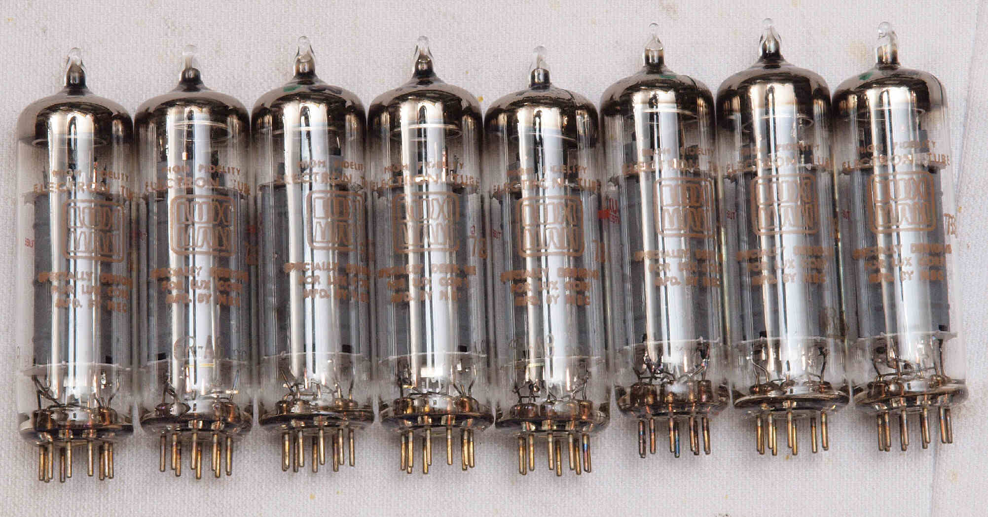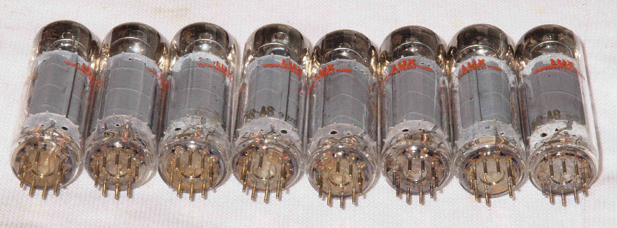 | B. LUX 純正ストック品、 6RA8 8本の「Gm & Ip」測定。 真空管ハンドブック(規格表)による相互コンダクタンス=10500μmho 「Ep=250V、Ip=61mA、Eg1=−19V」 (全日本真空管マニュアル、オーディオ用真空管マニアル、世界の真空管カタログより)。 |