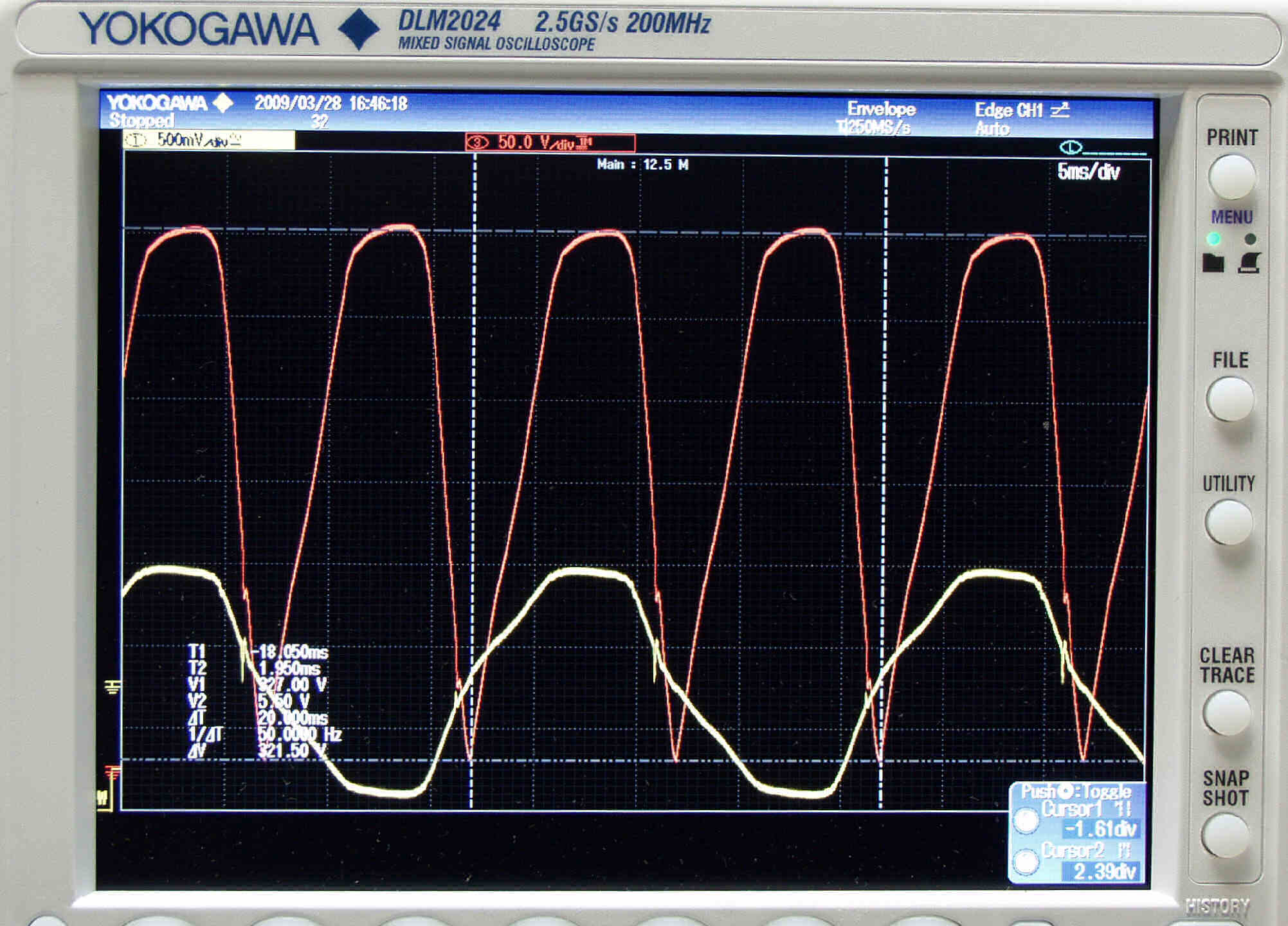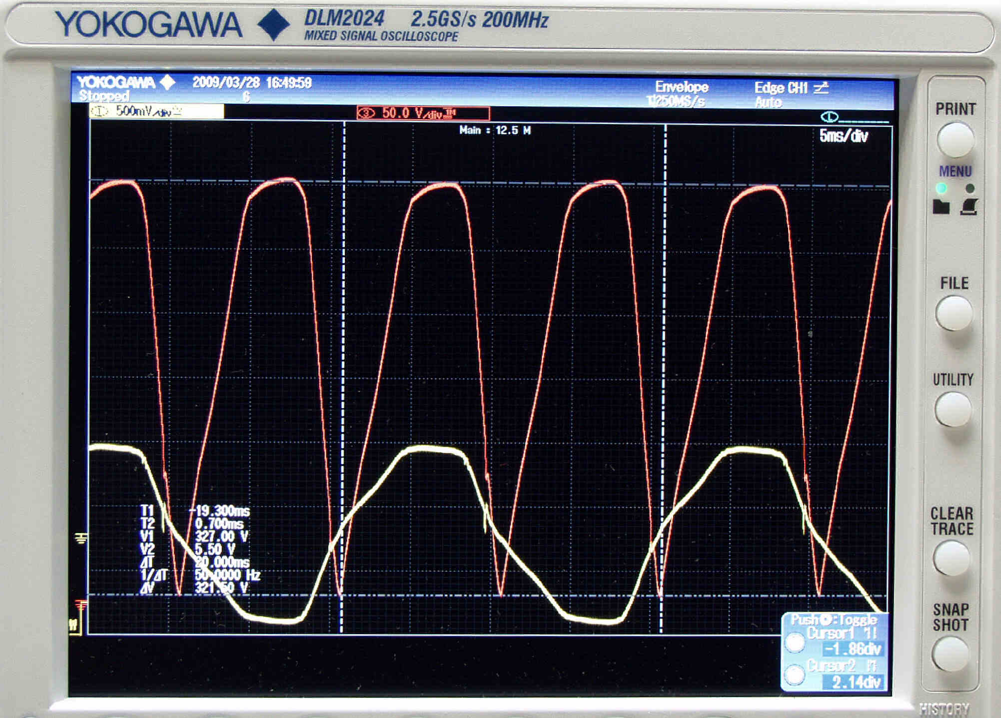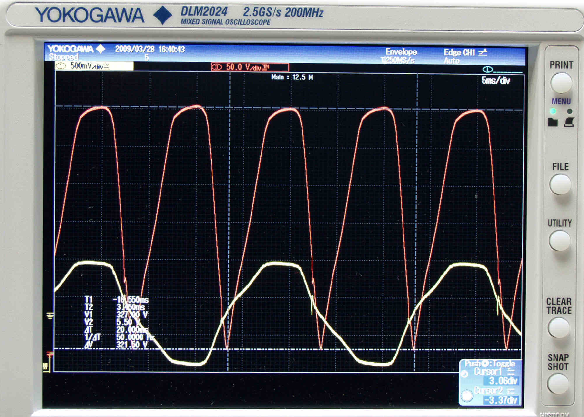 | G23. 「JJ−ECC99」測定の入出力波形、黄色=グリッド電圧、赤色=プレート電圧 | |||||||||||||||||||||||||||||||||